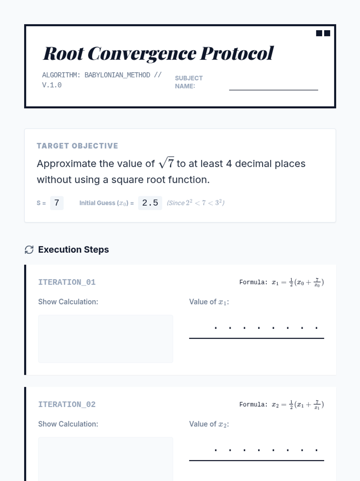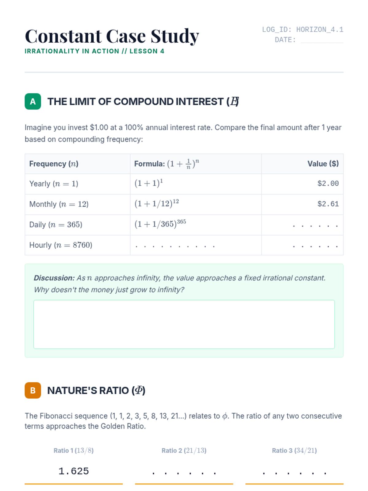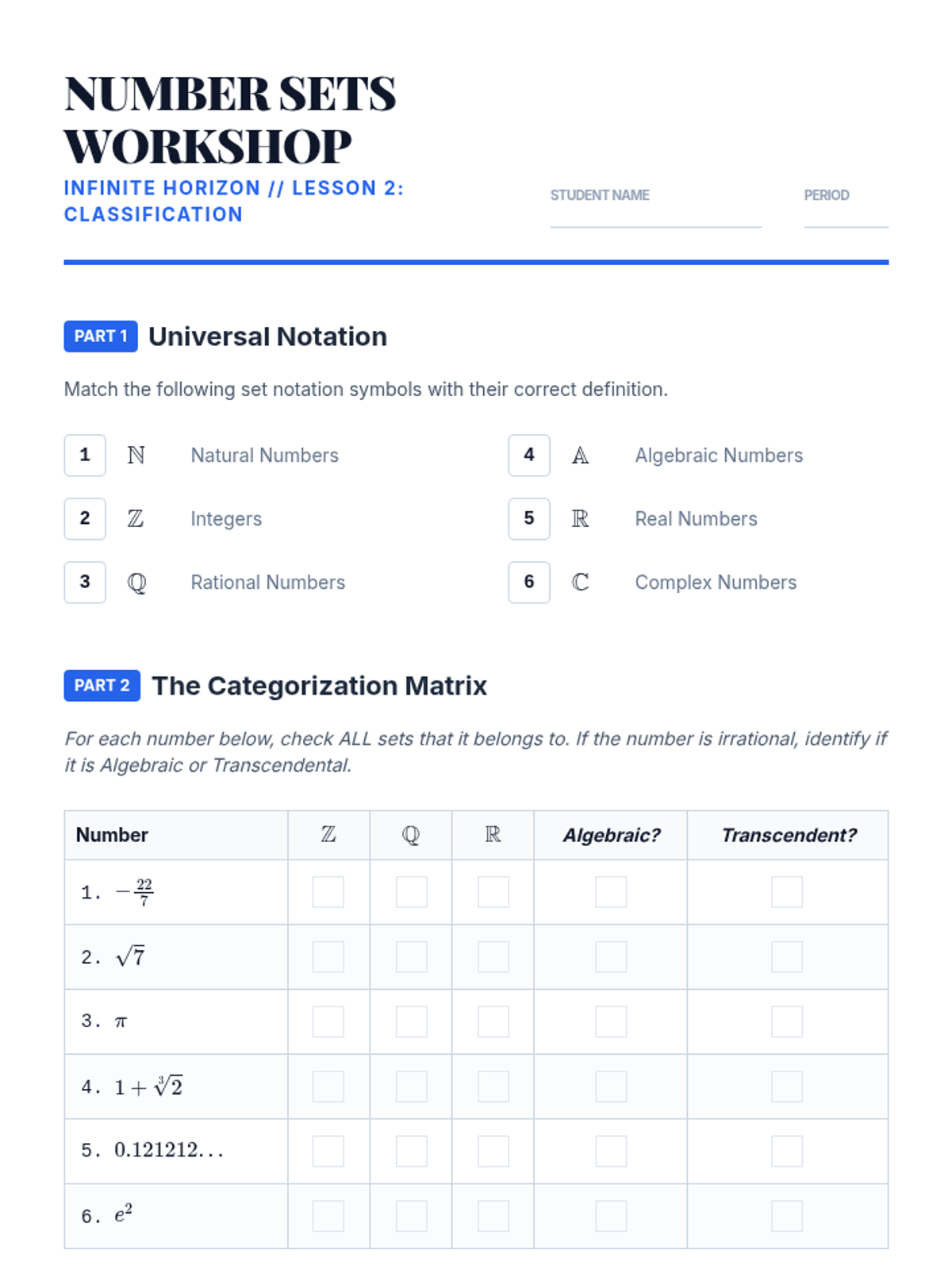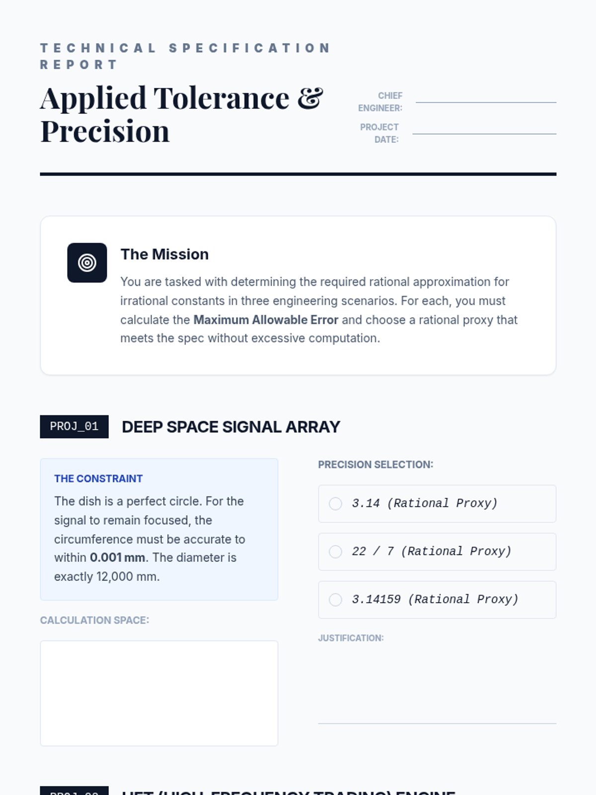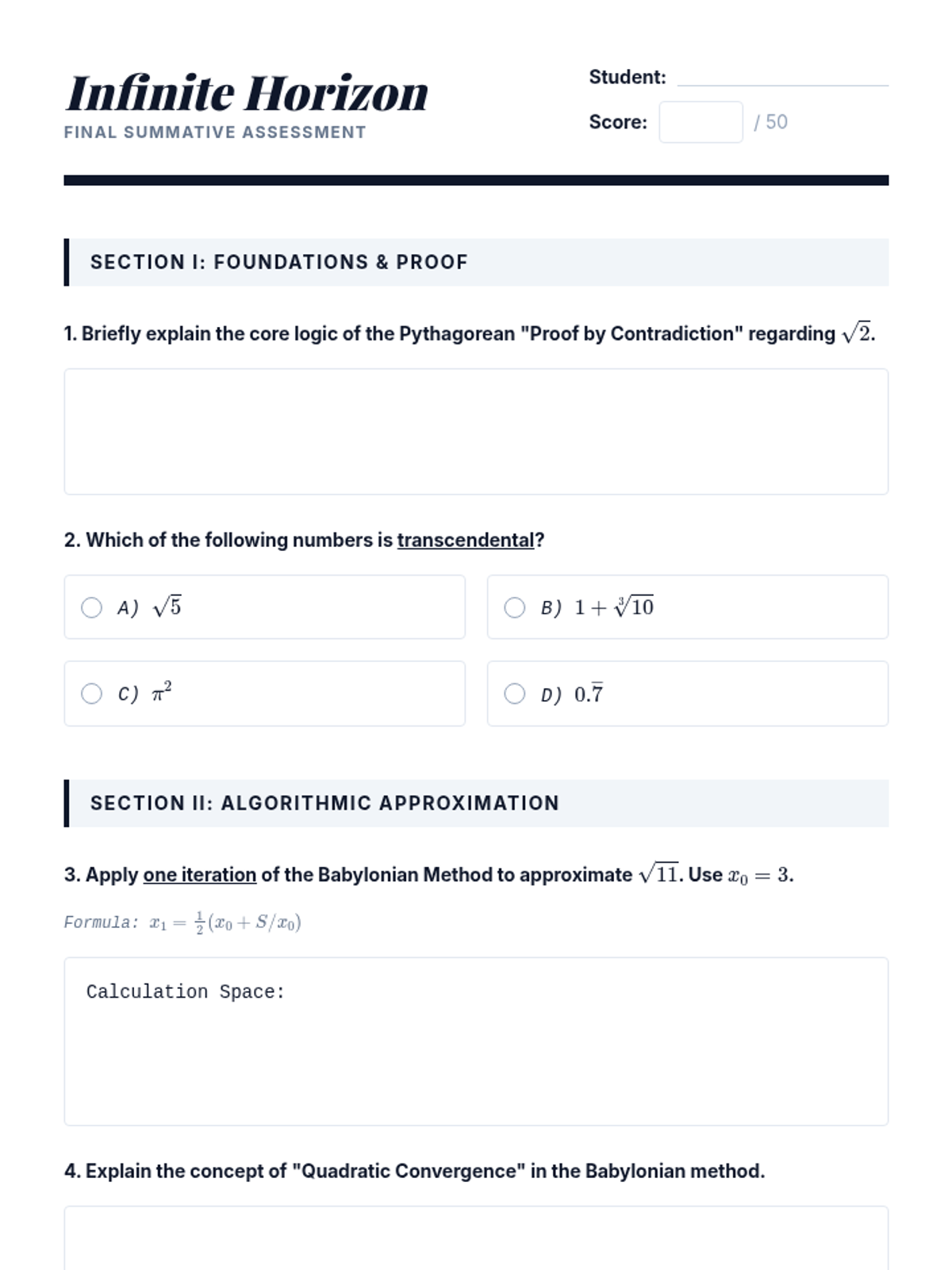 An advanced exploration of irrational numbers for 12th-grade students, covering historical proofs, classification of algebraic and transcendental numbers, iterative approximation algorithms, and real-world precision requirements.