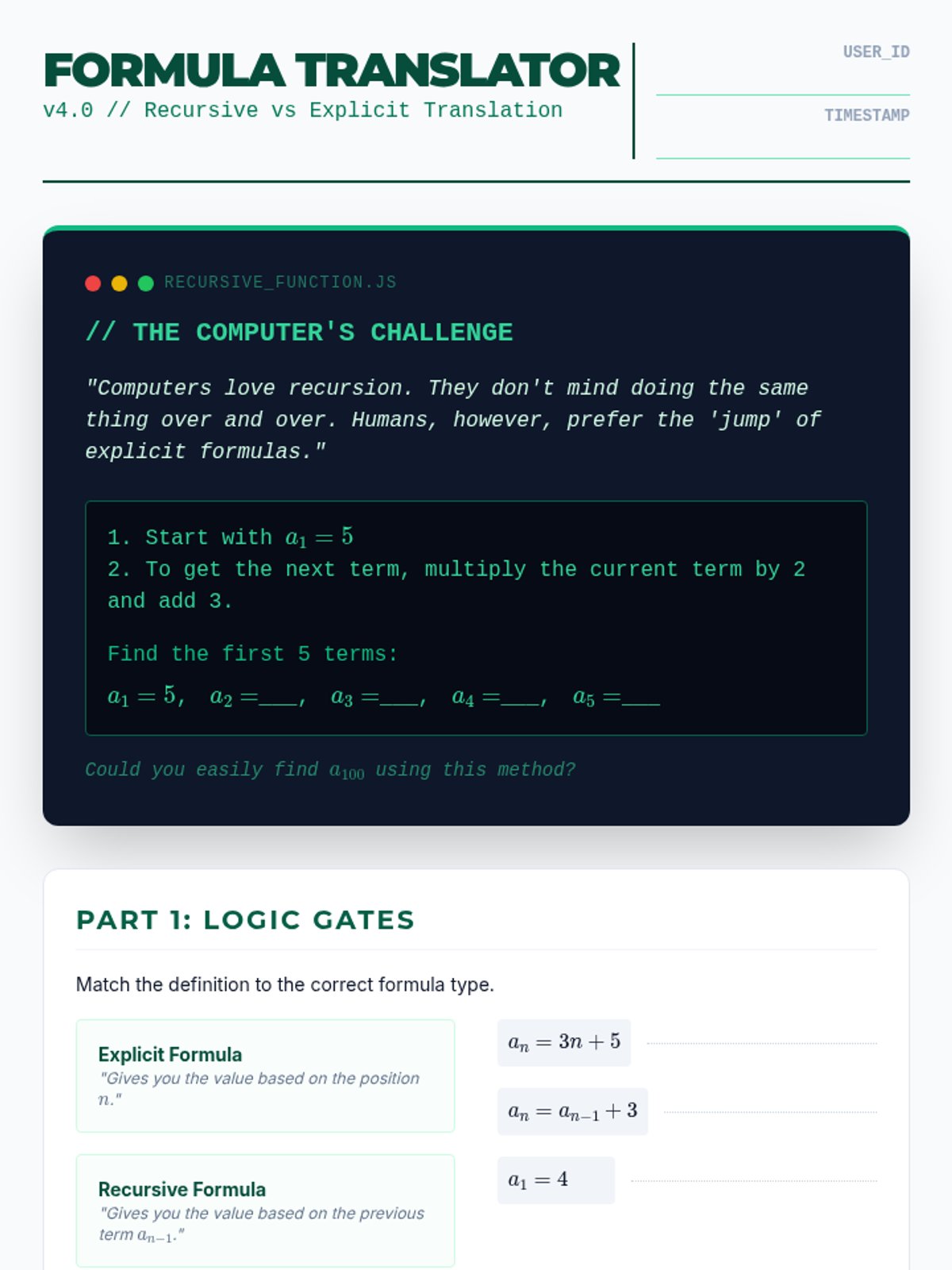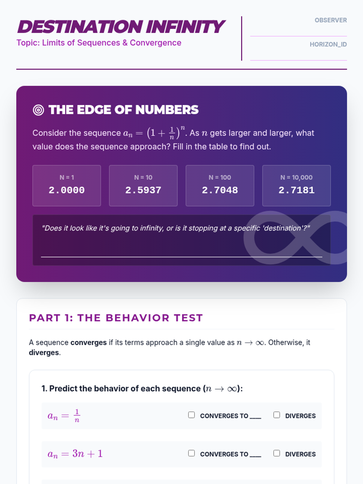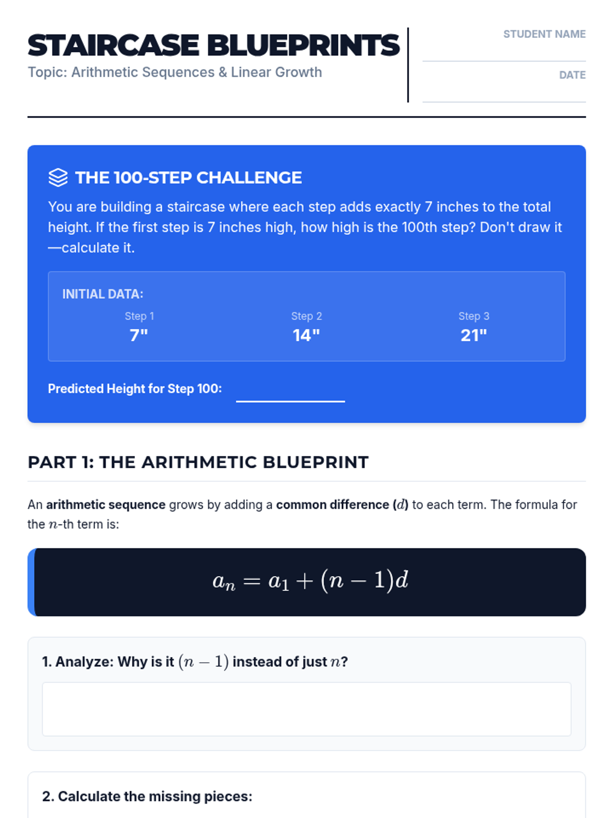 This sequence introduces 11th-grade students to the fundamental concepts of mathematical sequences, bridging the gap between algebra and calculus by exploring arithmetic and geometric progressions, recursive and explicit notation, and the behavior of sequences as they approach infinity.