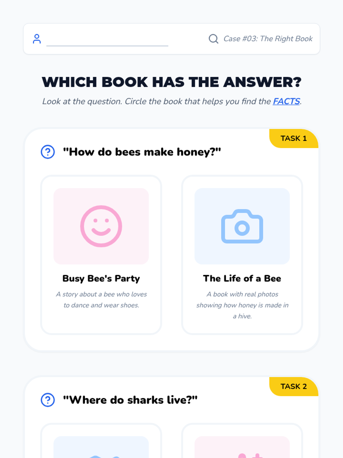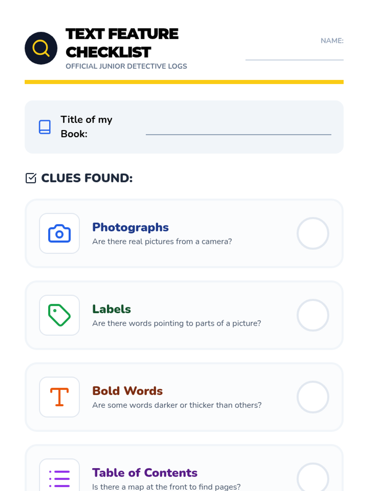 A foundational writing and research sequence for Kindergarteners that teaches the difference between fiction and non-fiction sources. Students learn to identify text features, evaluate source relevance, and select the best tools for gathering facts through a 'Detective' themed workshop approach.
