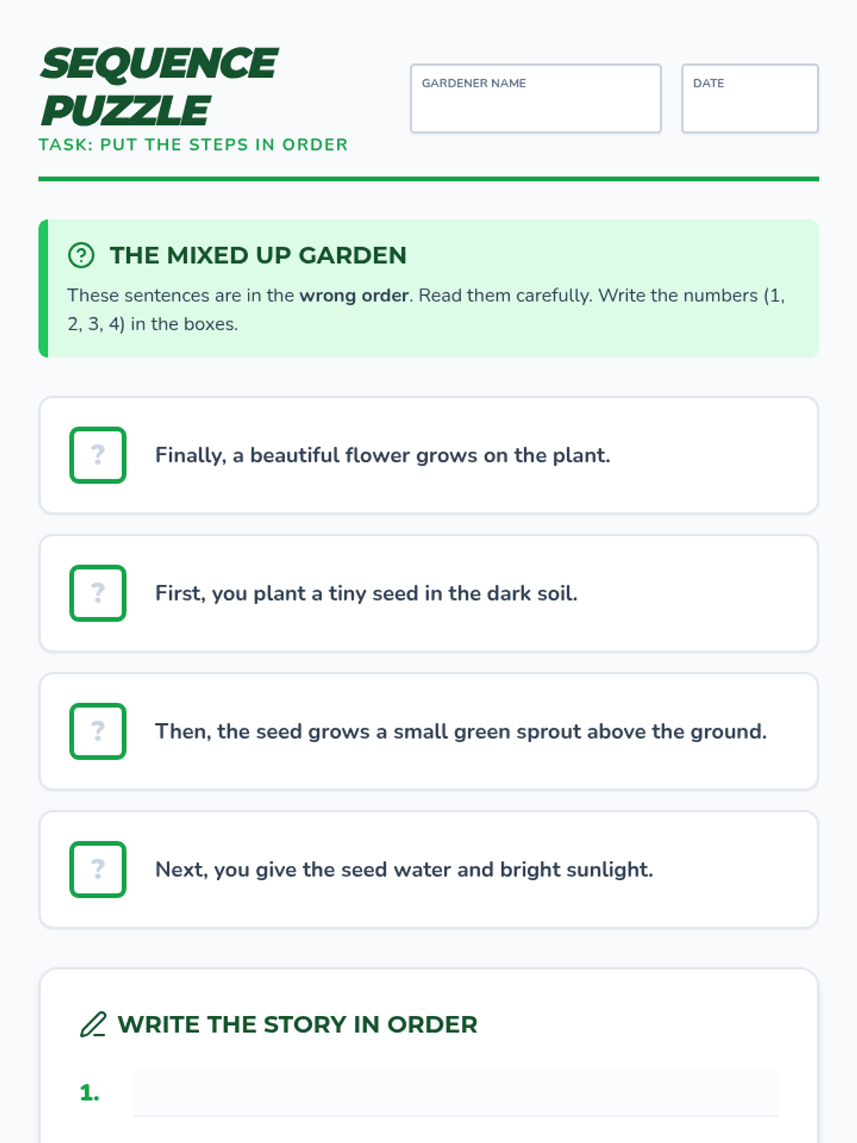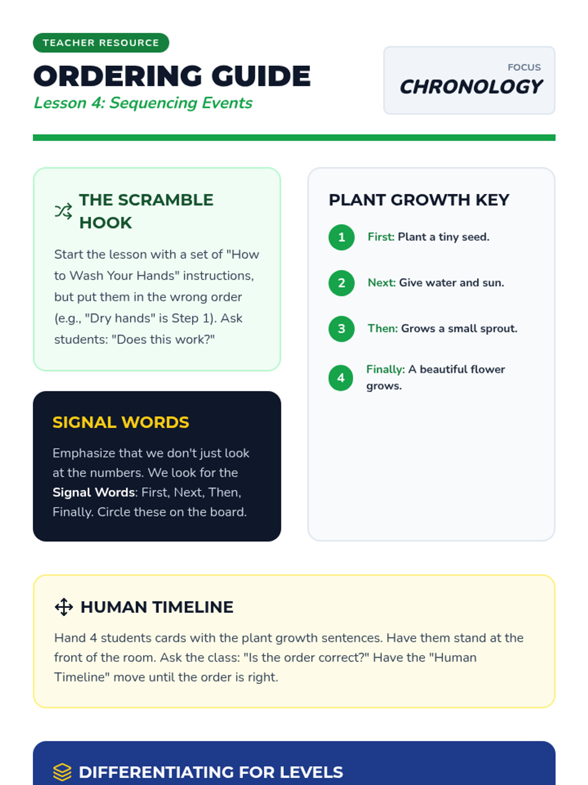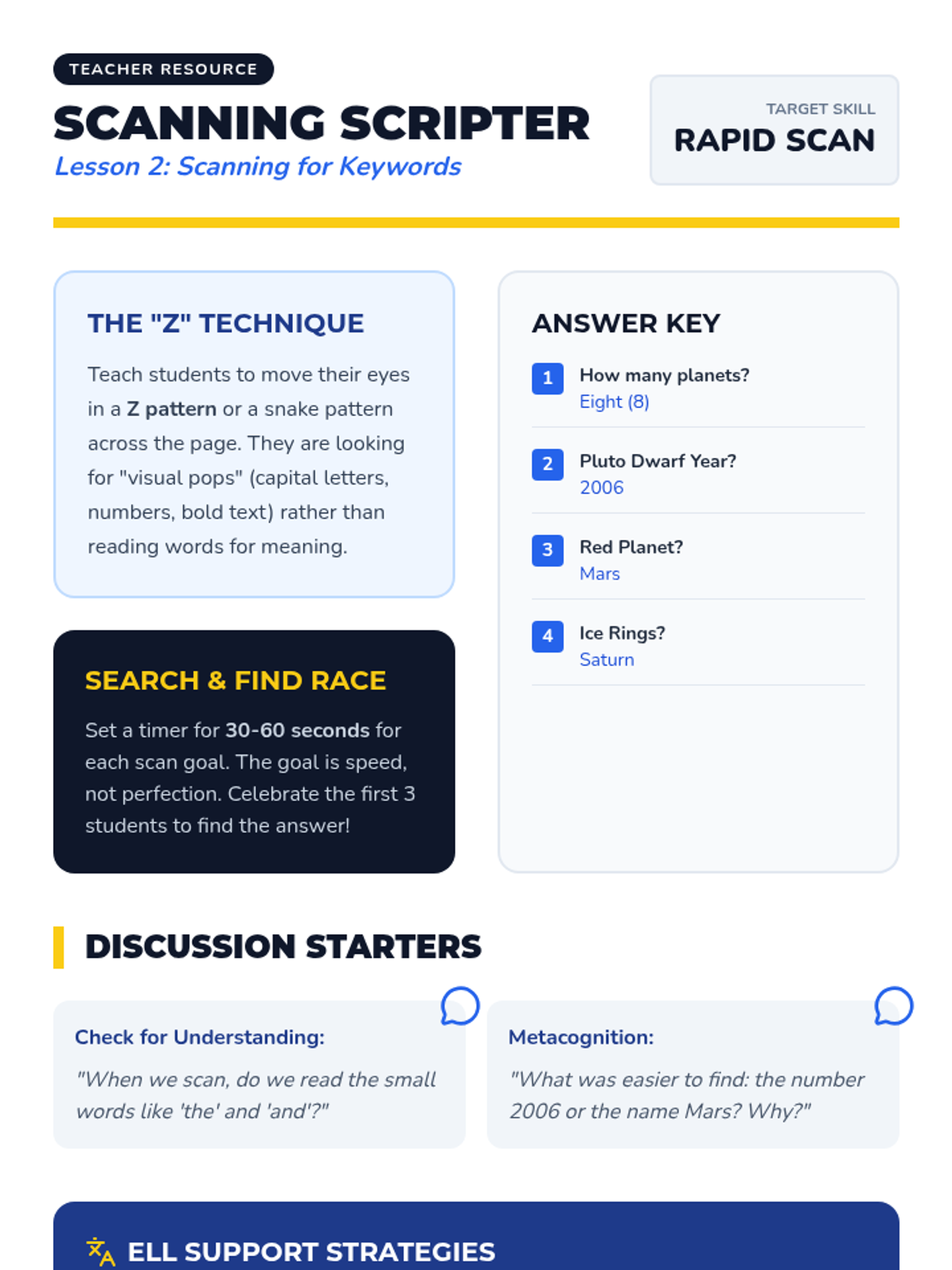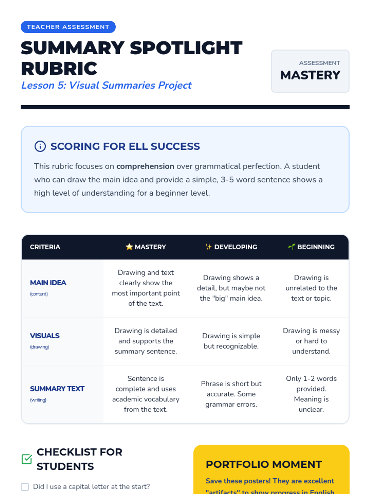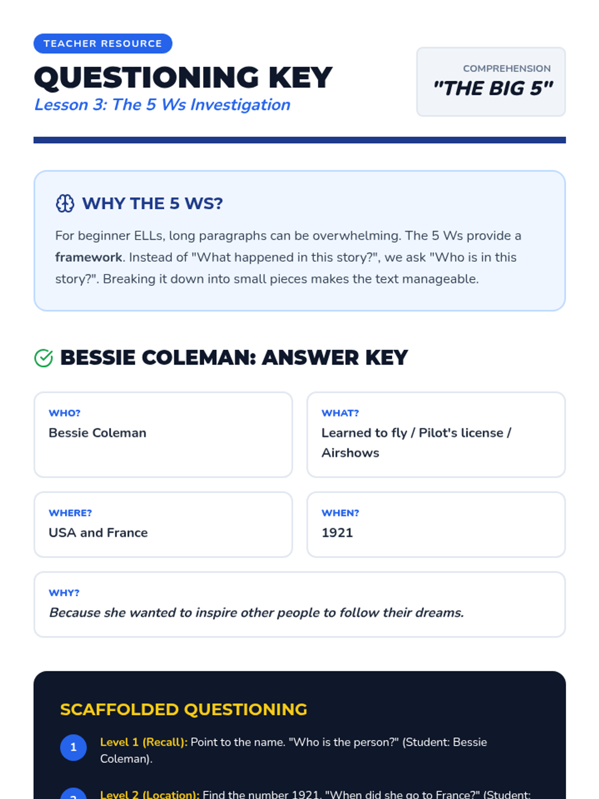 A comprehensive sequence designed for 5th-grade beginner English Language Learners to master the art of extracting key details from informational texts. Through five progressive lessons, students learn to use text features, scan for keywords, apply the 5 Ws, sequence information, and create visual summaries to demonstrate comprehension.