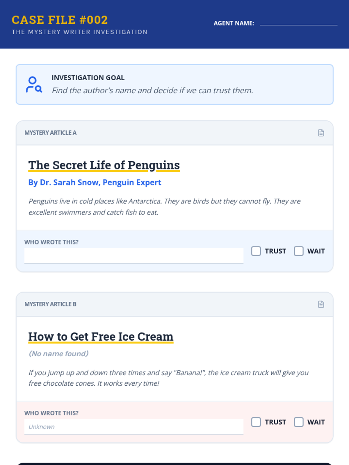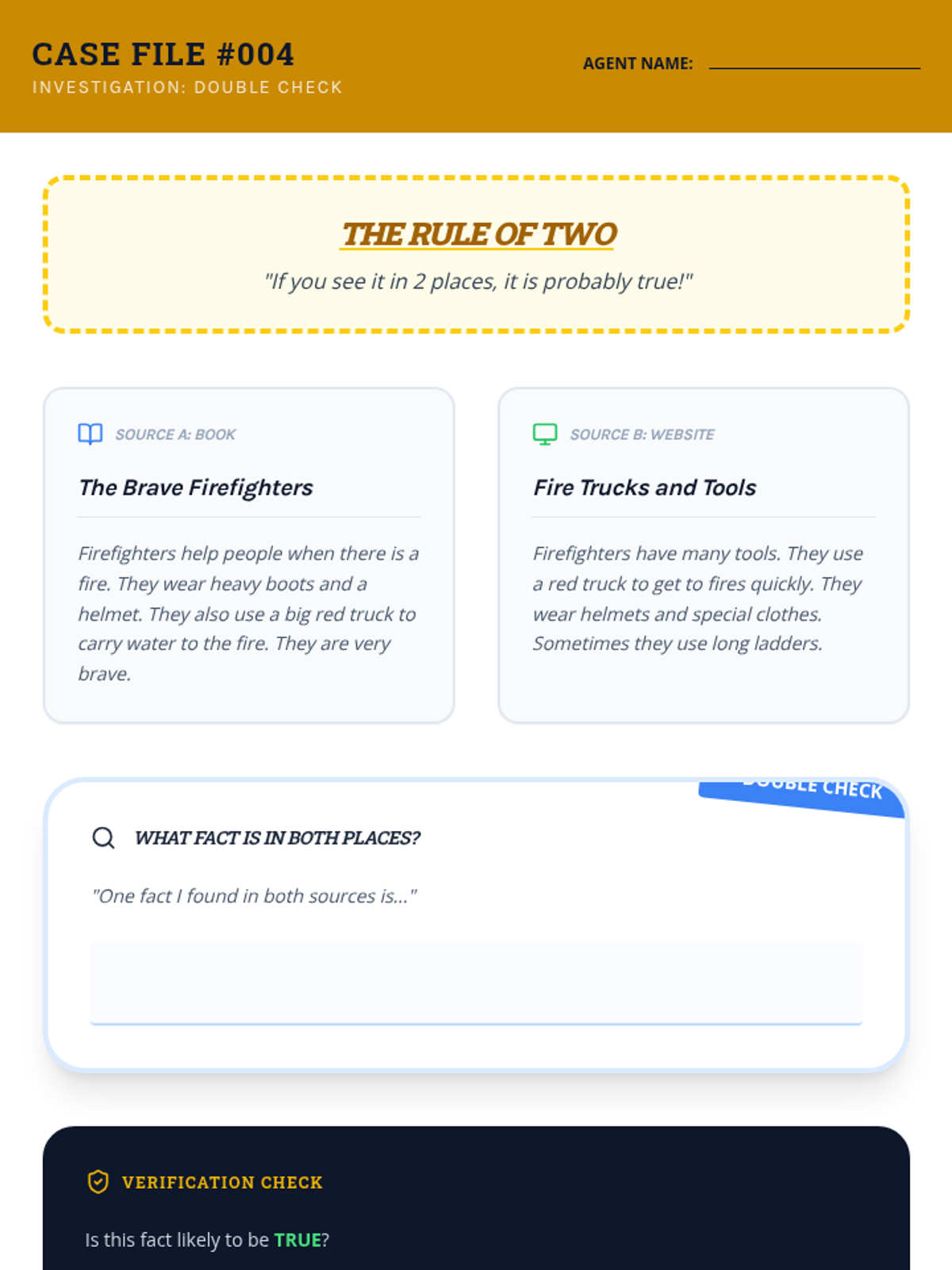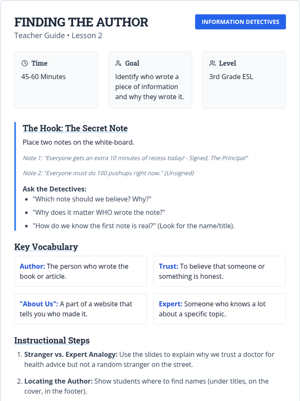 A 5-lesson sequence for 3rd-grade ESL students to learn the basics of source credibility and fact-checking through the lens of 'Information Detectives'. Students learn to distinguish fact from fiction, identify authors, recognize advertisements, and cross-check information.
