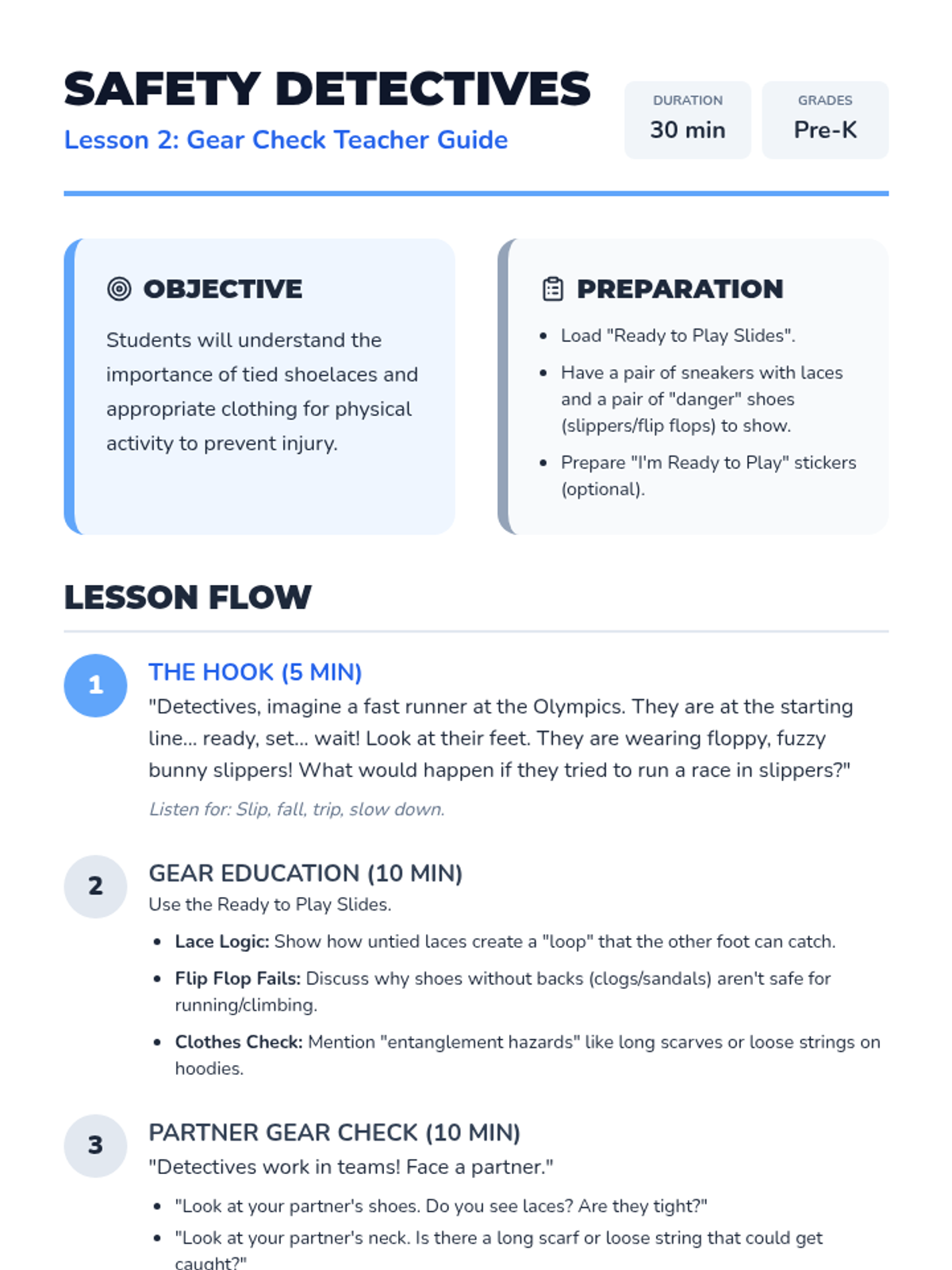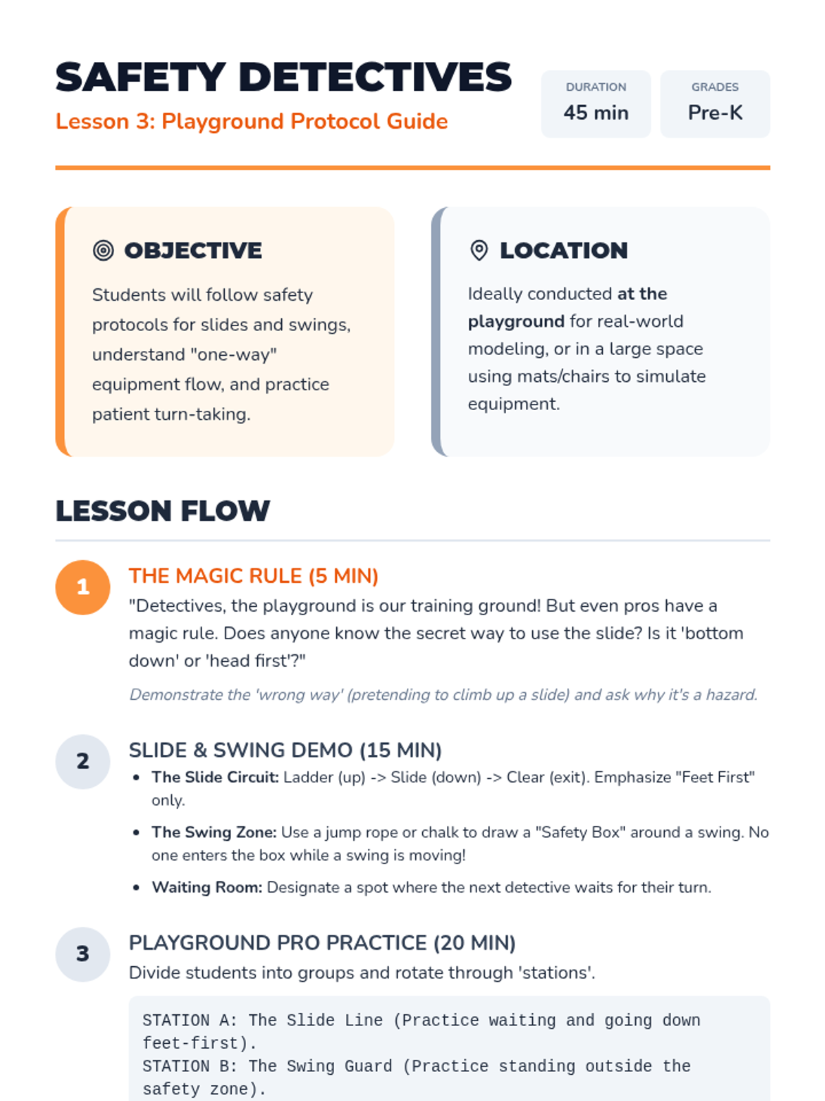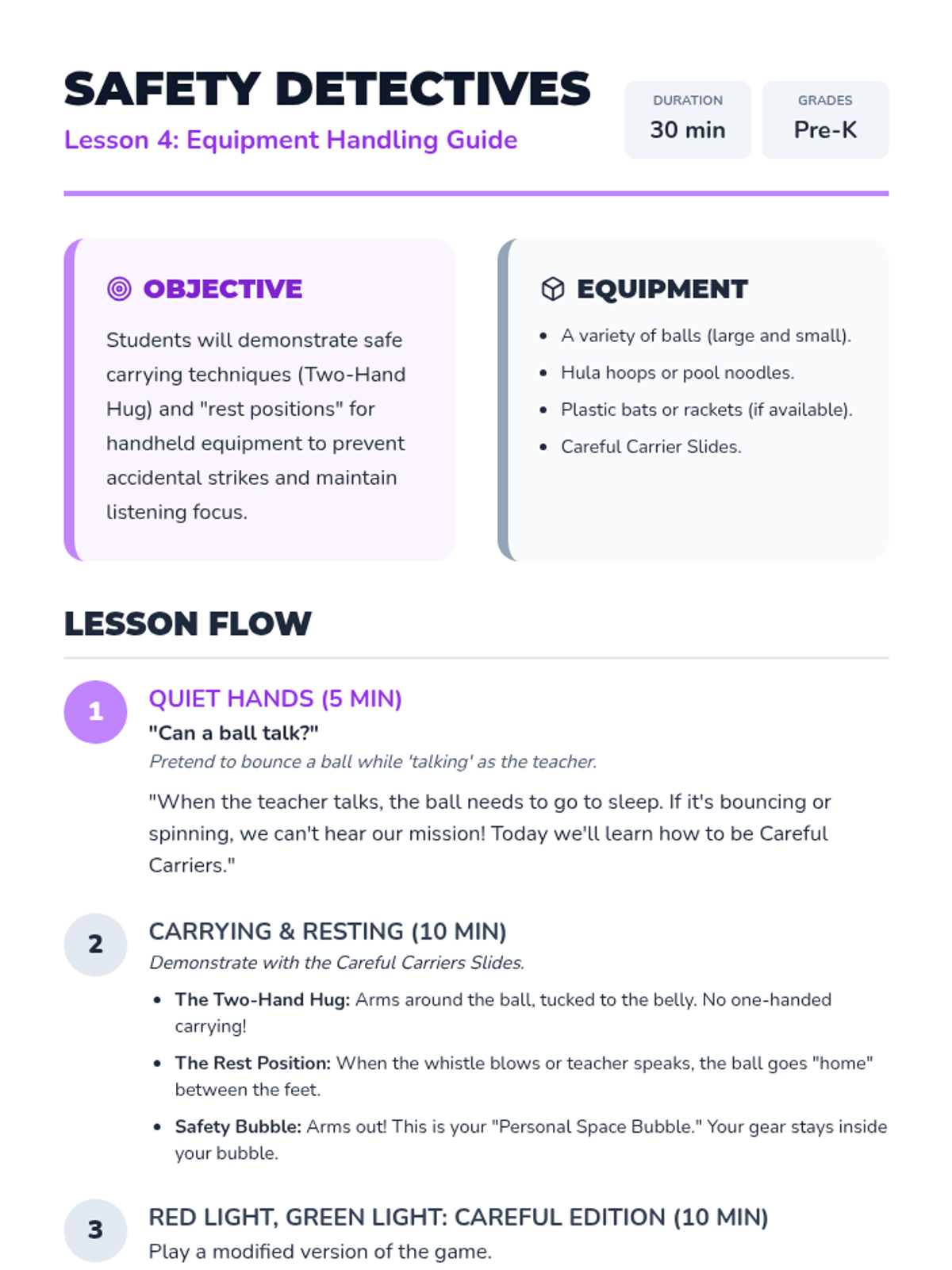 A comprehensive Pre-K sequence focused on environmental awareness, equipment protocols, and reporting hazards to ensure safe play. Students act as 'Safety Detectives' to identify risks and practice safe habits.