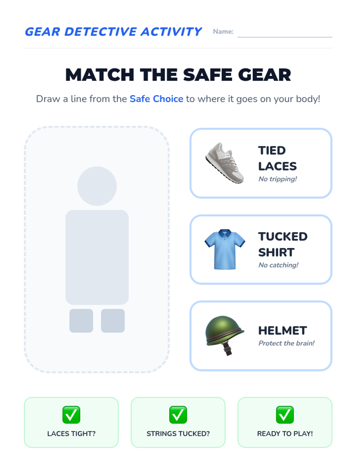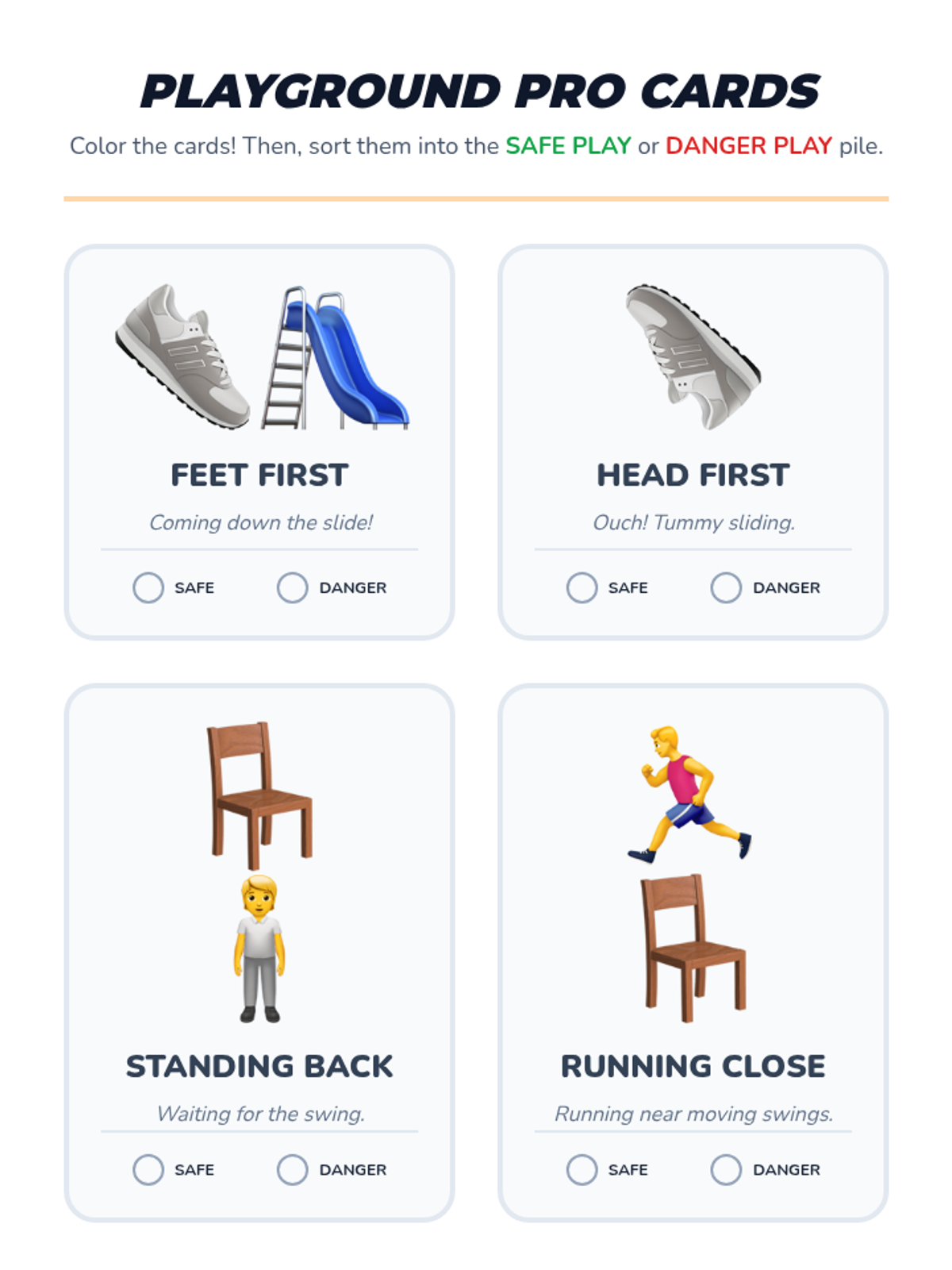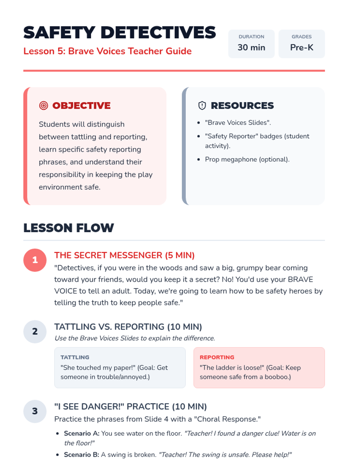 A comprehensive Pre-K sequence focused on environmental awareness, equipment protocols, and reporting hazards to ensure safe play. Students act as 'Safety Detectives' to identify risks and practice safe habits.