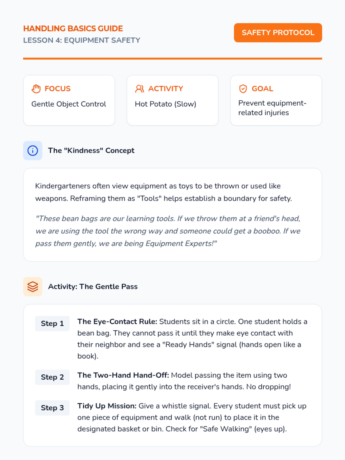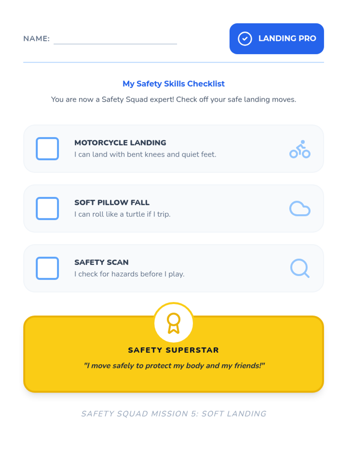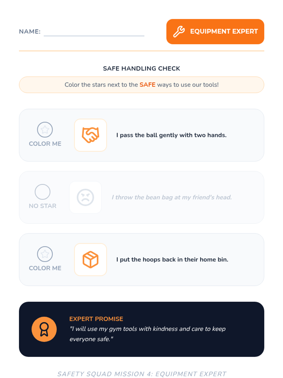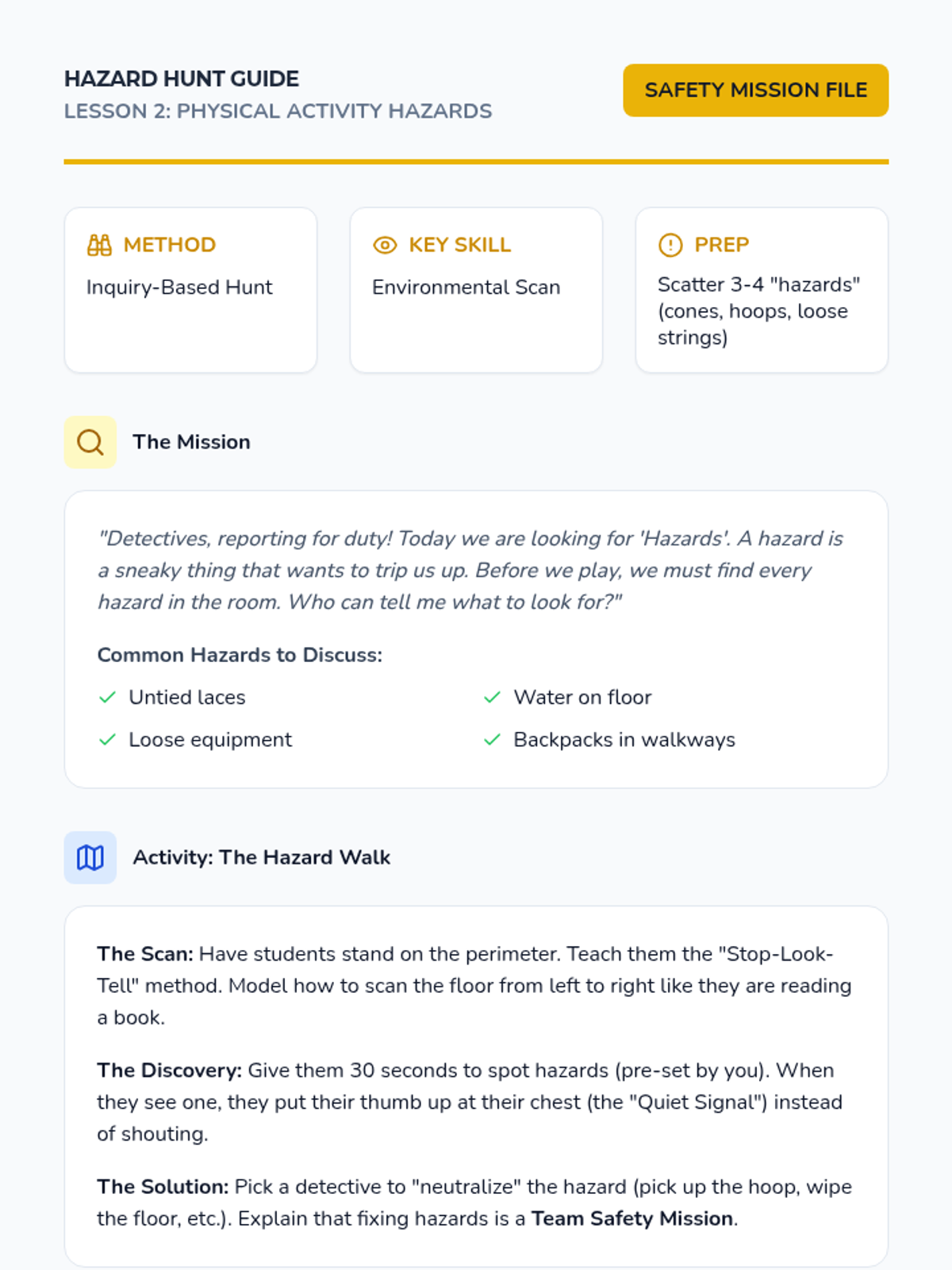 A Kindergarten sequence focused on injury prevention through spatial awareness, hazard identification, and safe movement techniques. Students learn to navigate physical activity safely by respecting personal space, recognizing environmental risks, and practicing safe body mechanics.