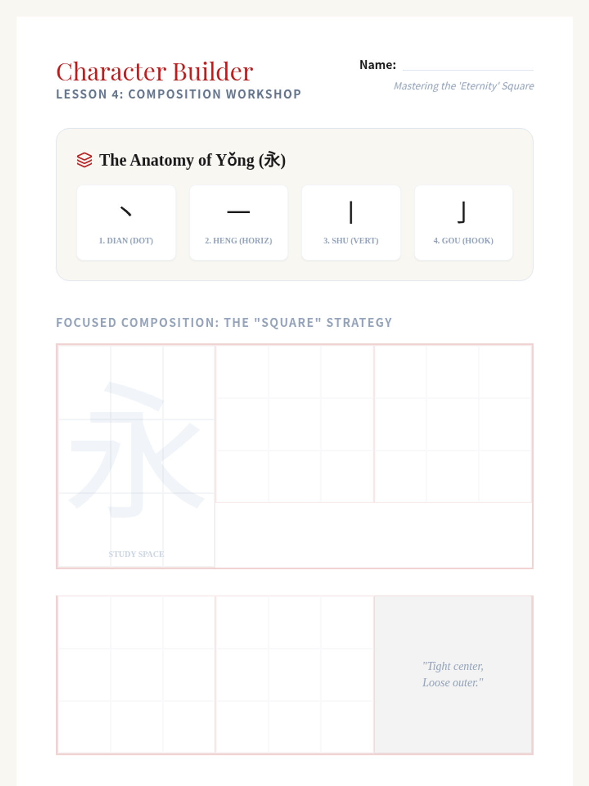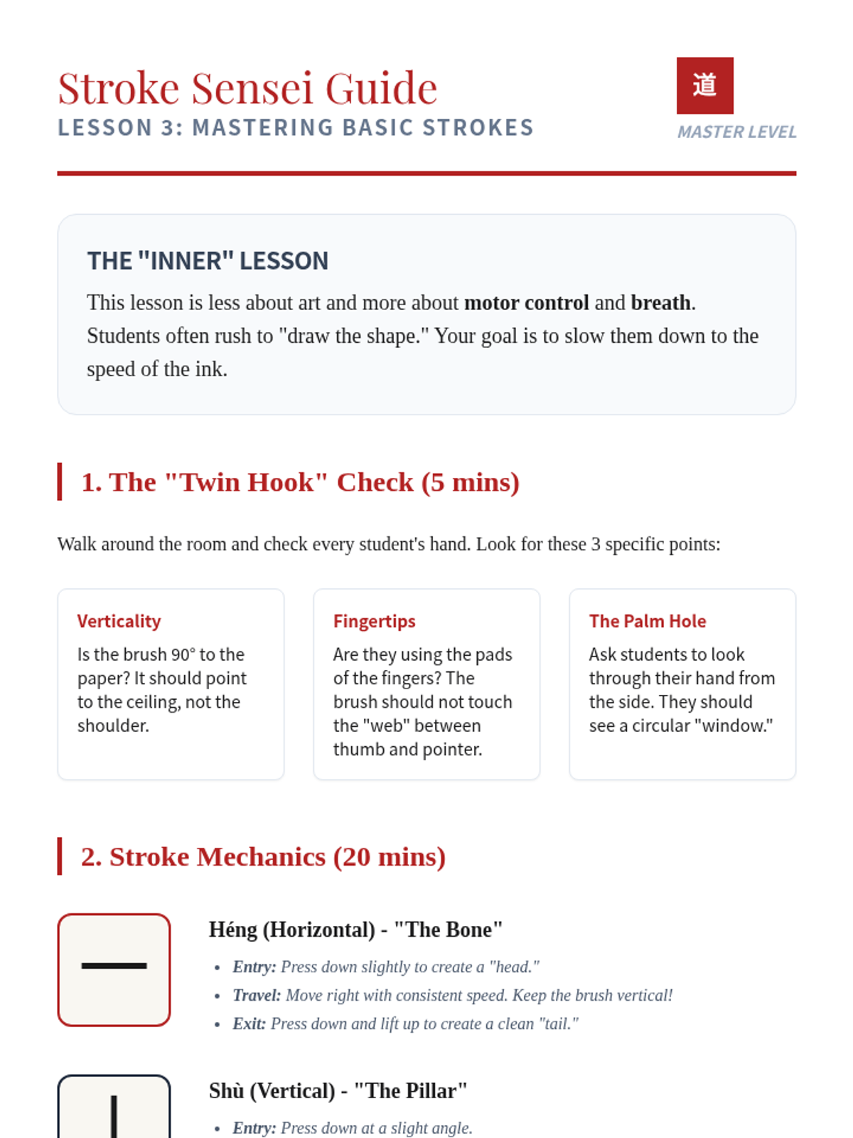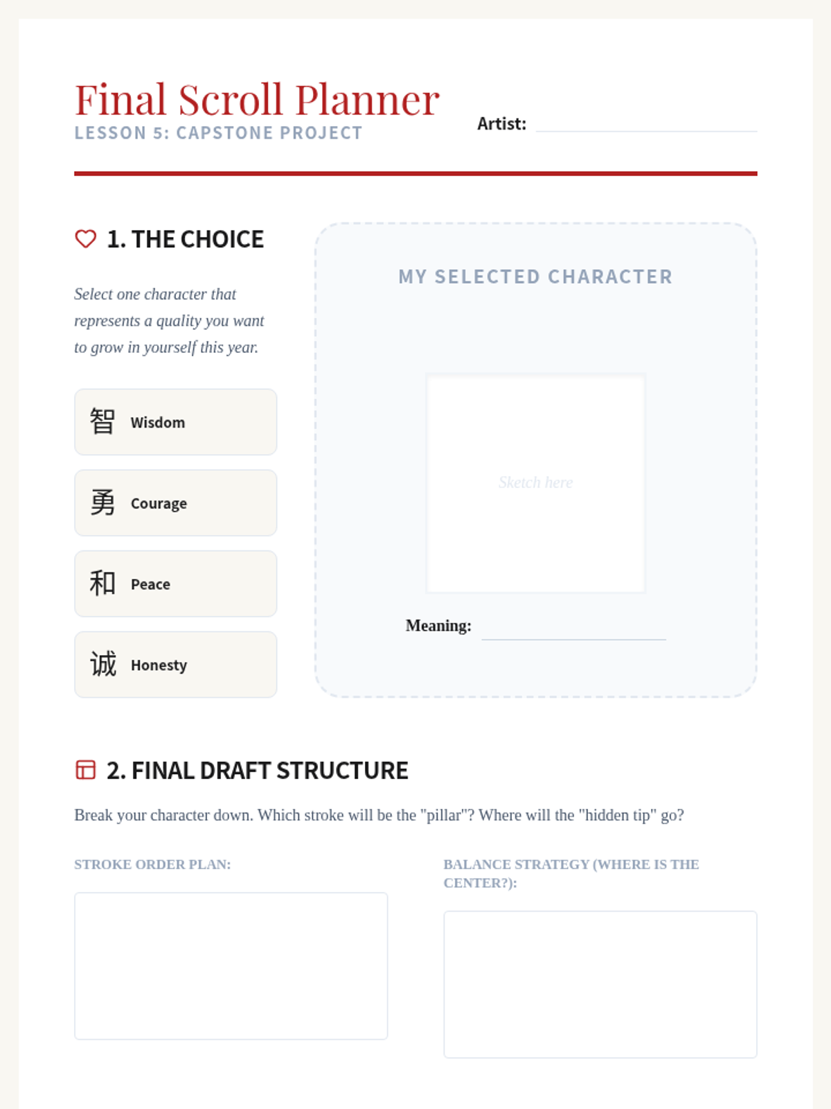 A comprehensive introduction to Chinese calligraphy for 6th-grade students, focusing on the historical evolution of characters, the 'Four Treasures of the Study', and the fundamental techniques of brushwork and composition. Students transition from understanding the tools to creating a finished calligraphic scroll.