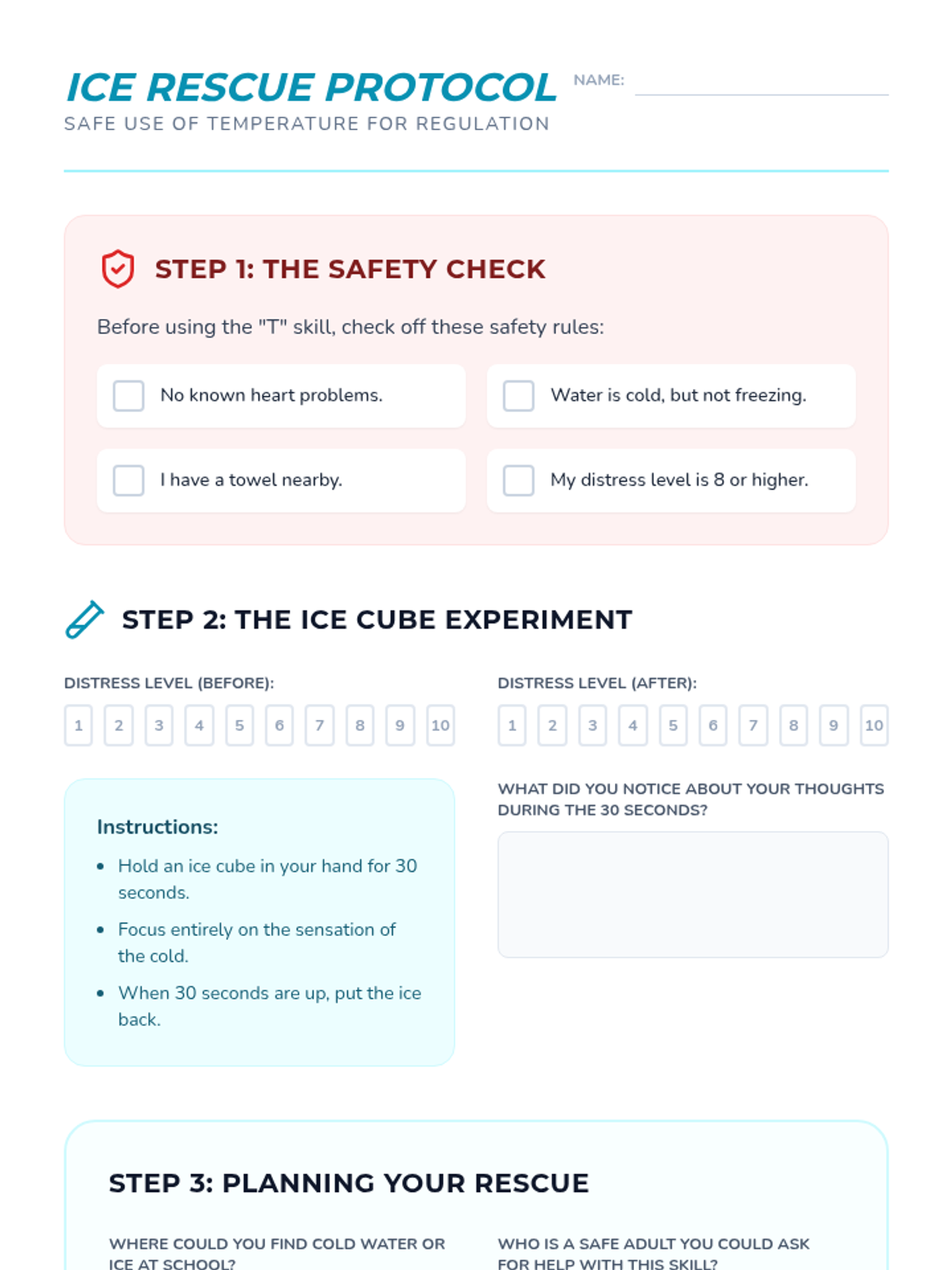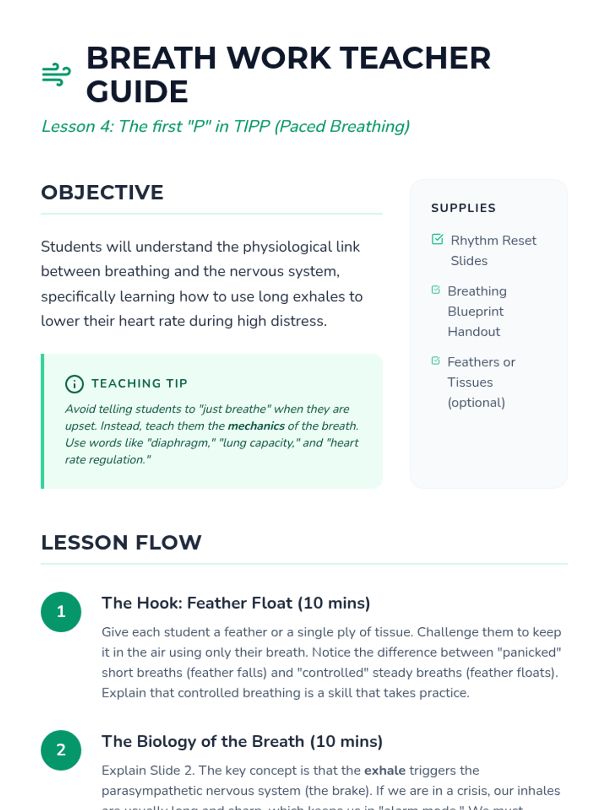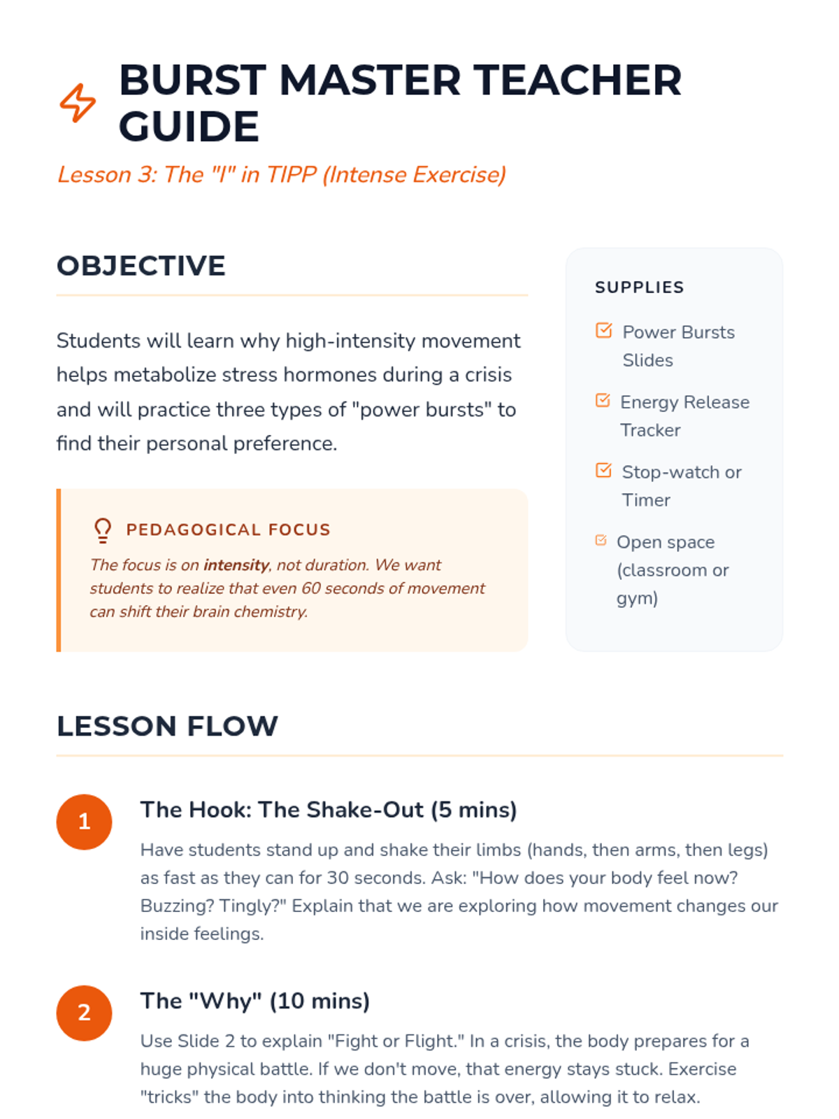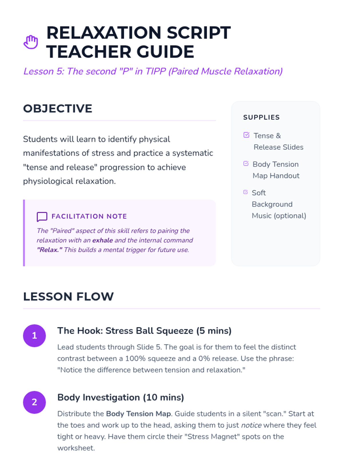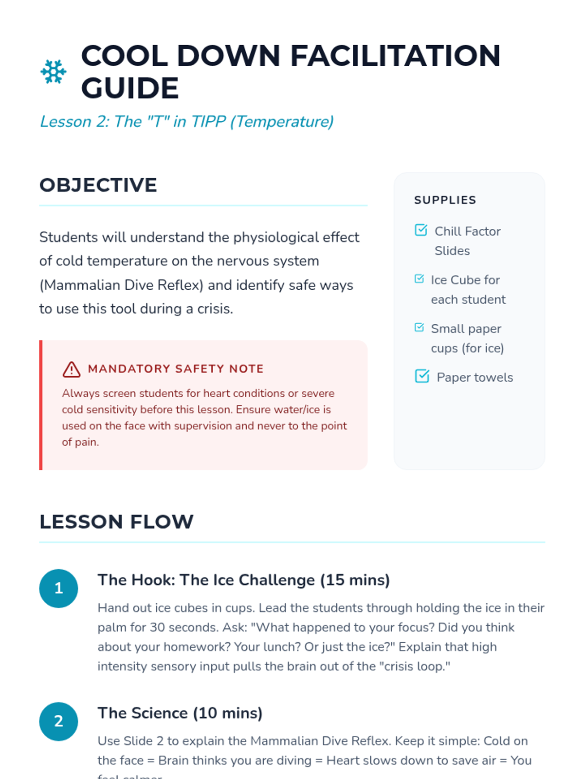 A comprehensive 5th-grade unit introducing the TIPP protocol for crisis survival. Students learn to distinguish between general stress and emotional crises, building a practical toolkit of physiological regulation strategies including temperature change, intense exercise, paced breathing, and paired muscle relaxation.