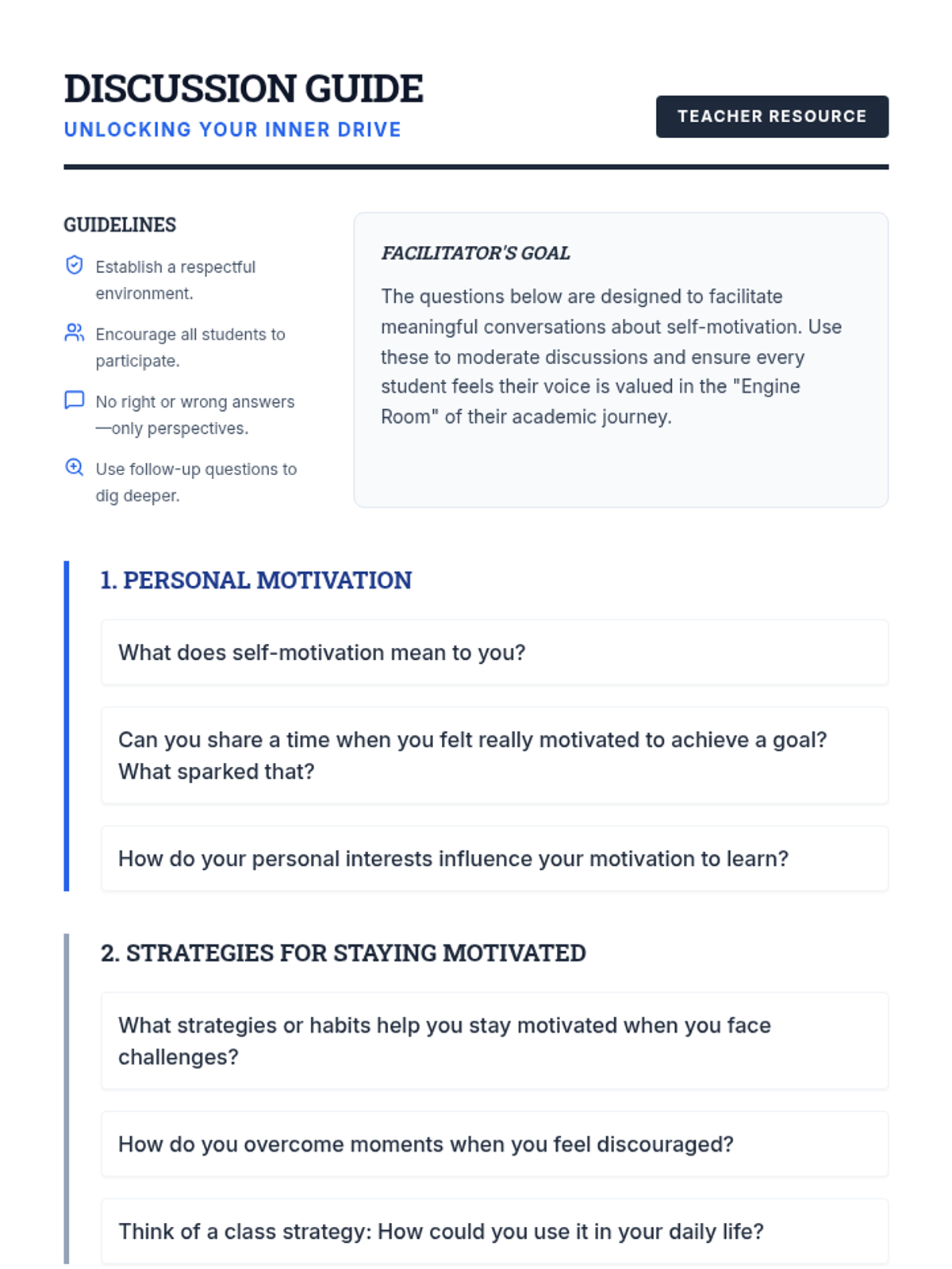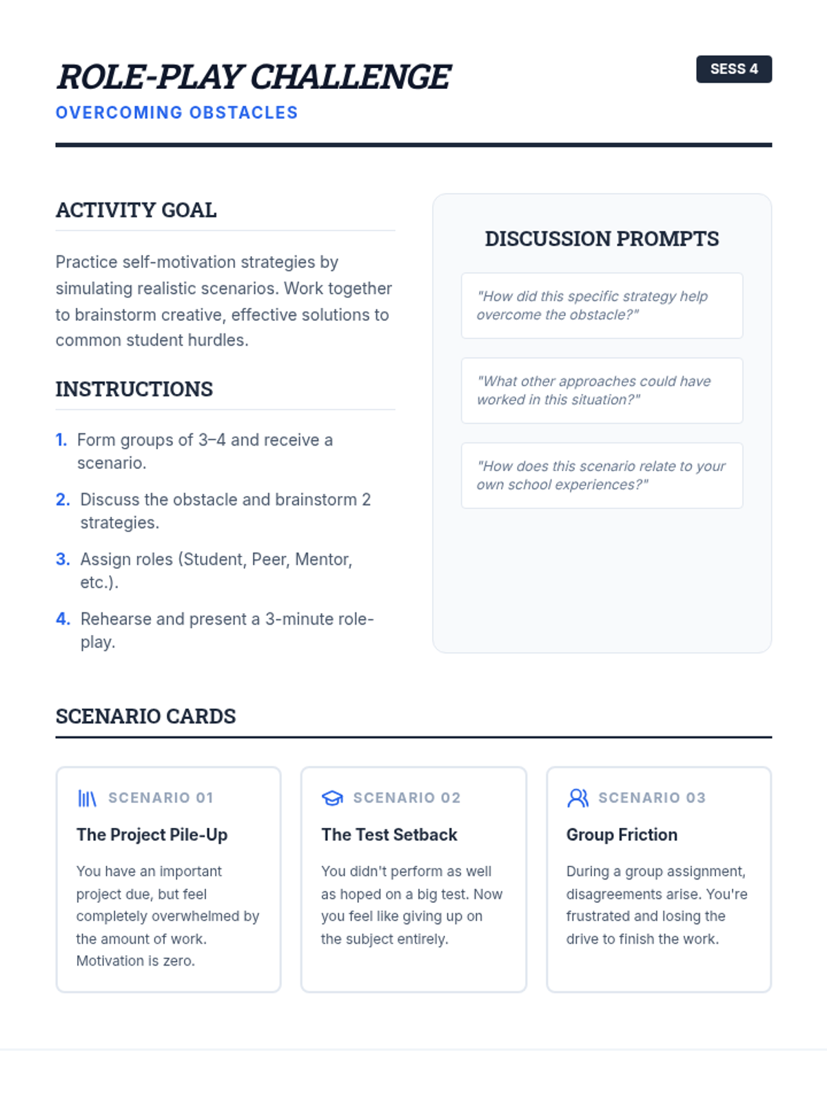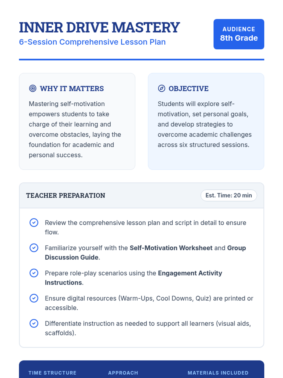 A 6-session series for 8th graders focused on developing self-motivation, setting academic goals, and building resilience to overcome challenges. Students move from understanding internal motivators to applying concrete strategies for success.