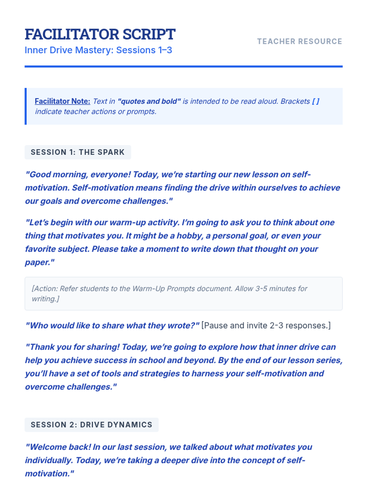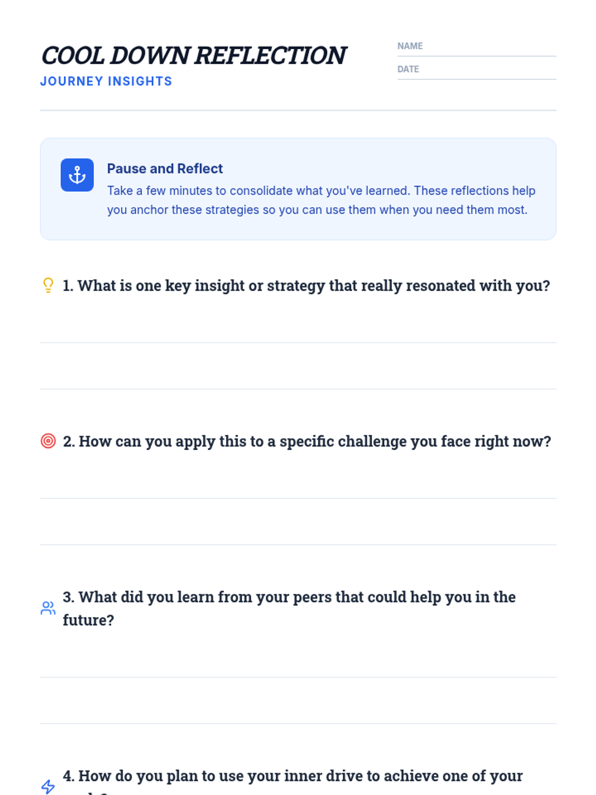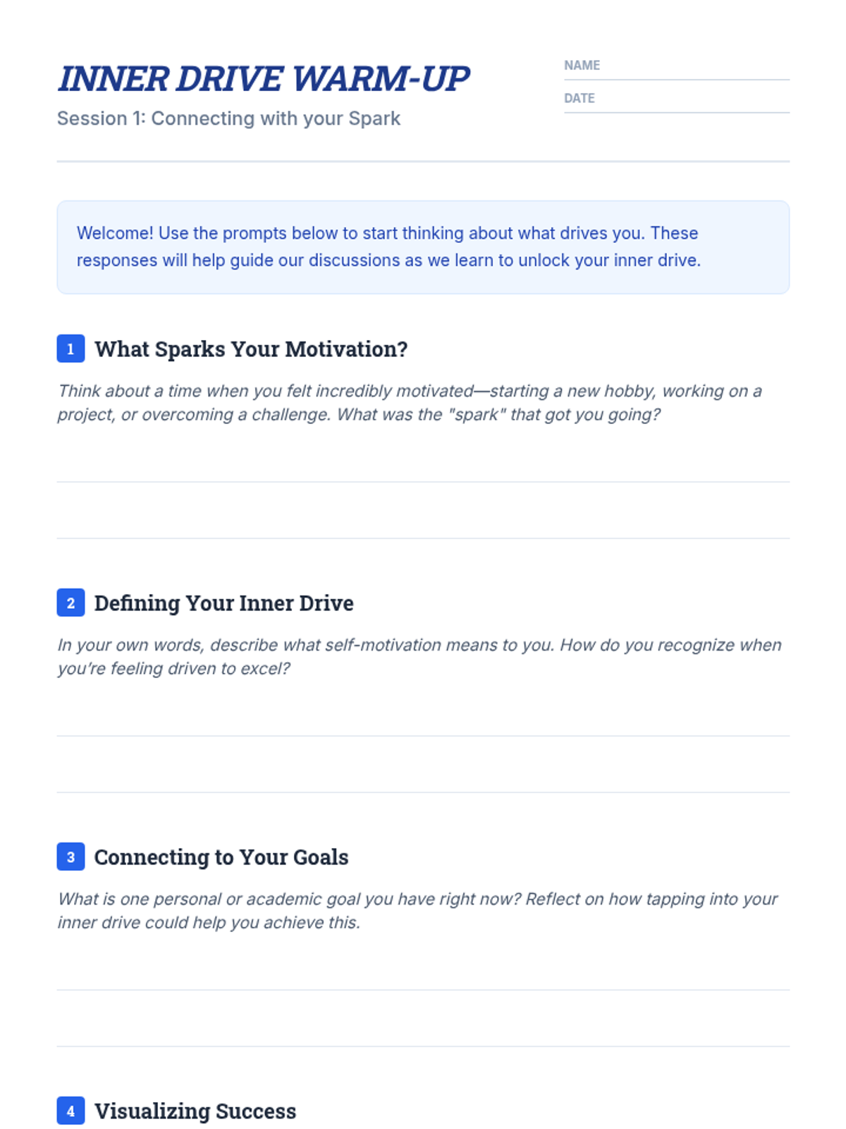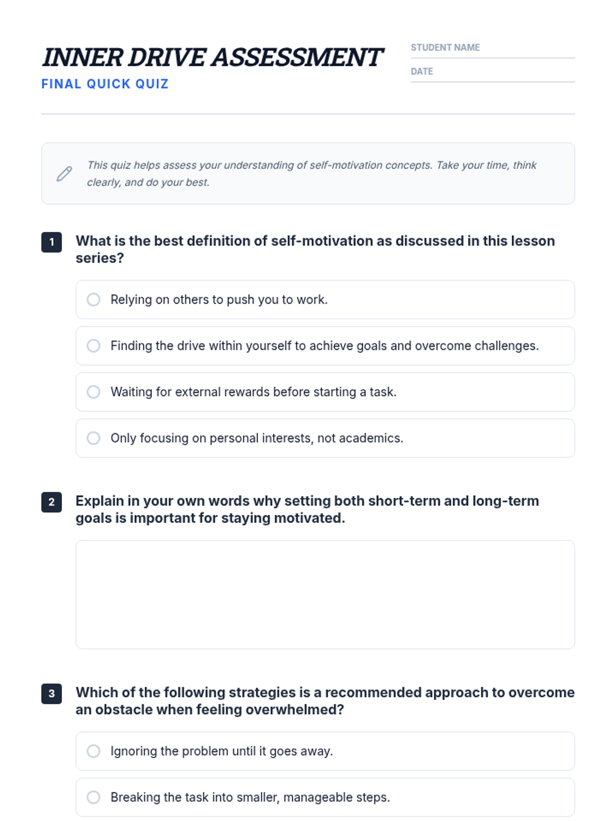 A 6-session series for 8th graders focused on developing self-motivation, setting academic goals, and building resilience to overcome challenges. Students move from understanding internal motivators to applying concrete strategies for success.
