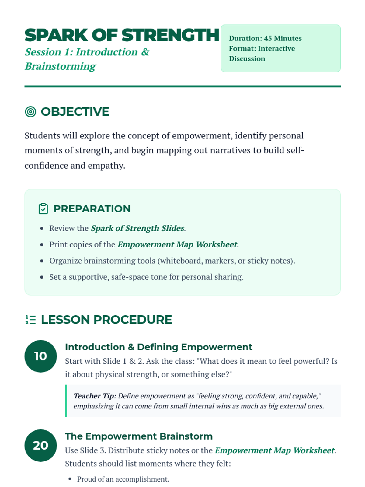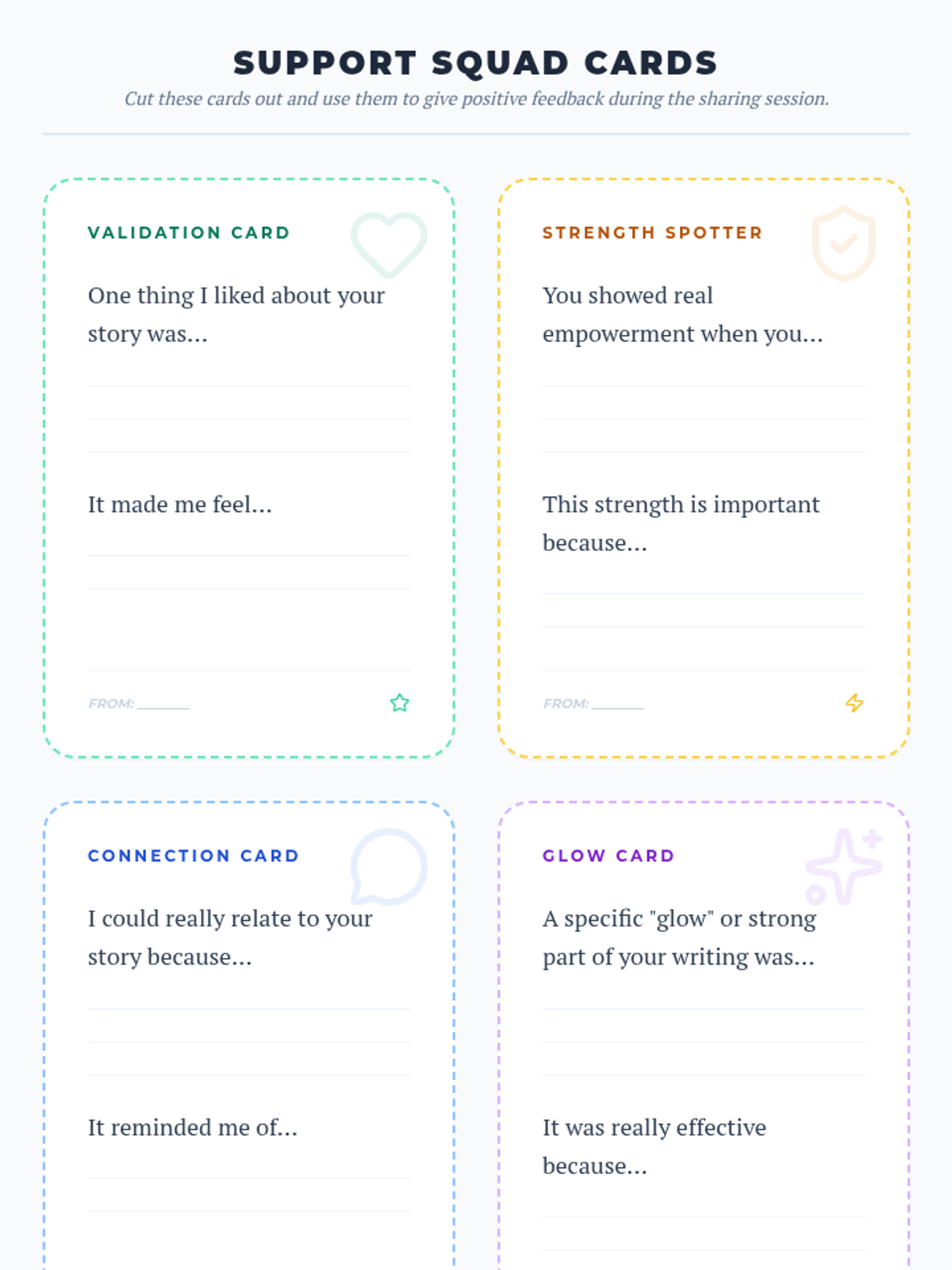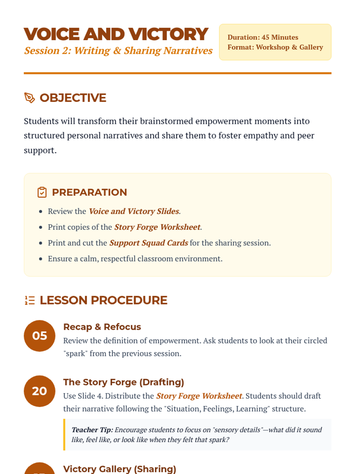 A two-session sequence for middle school students to explore personal empowerment through narrative writing, fostering self-confidence and peer empathy.