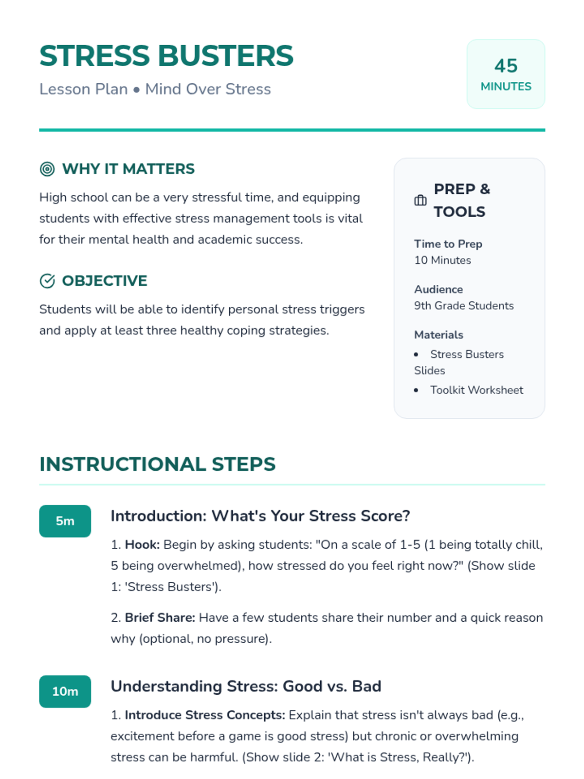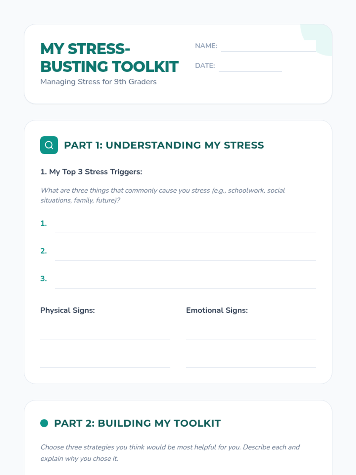 A 4-session small group counseling program for high school girls focused on identifying anxiety triggers, practicing mindfulness, and developing a personalized toolkit of coping strategies. The sequence emphasizes peer support, empowerment, and practical application within the school environment.