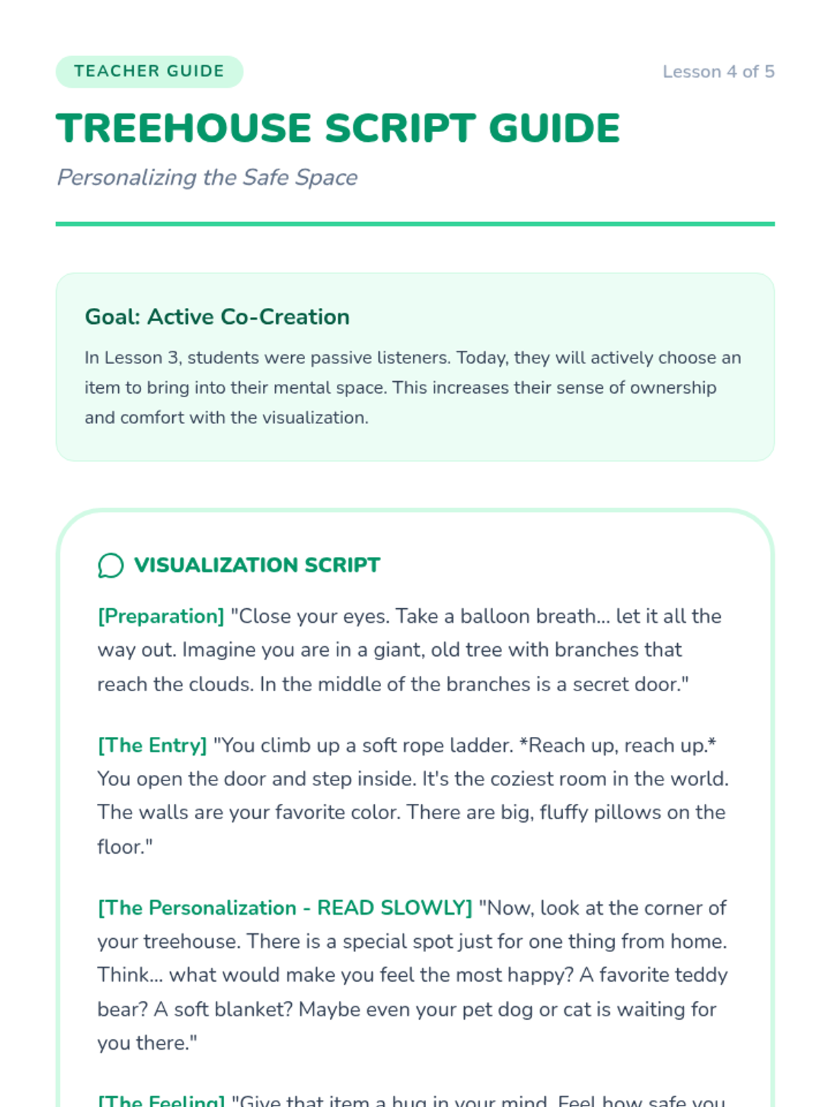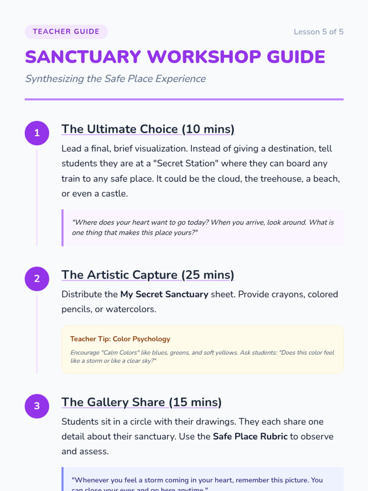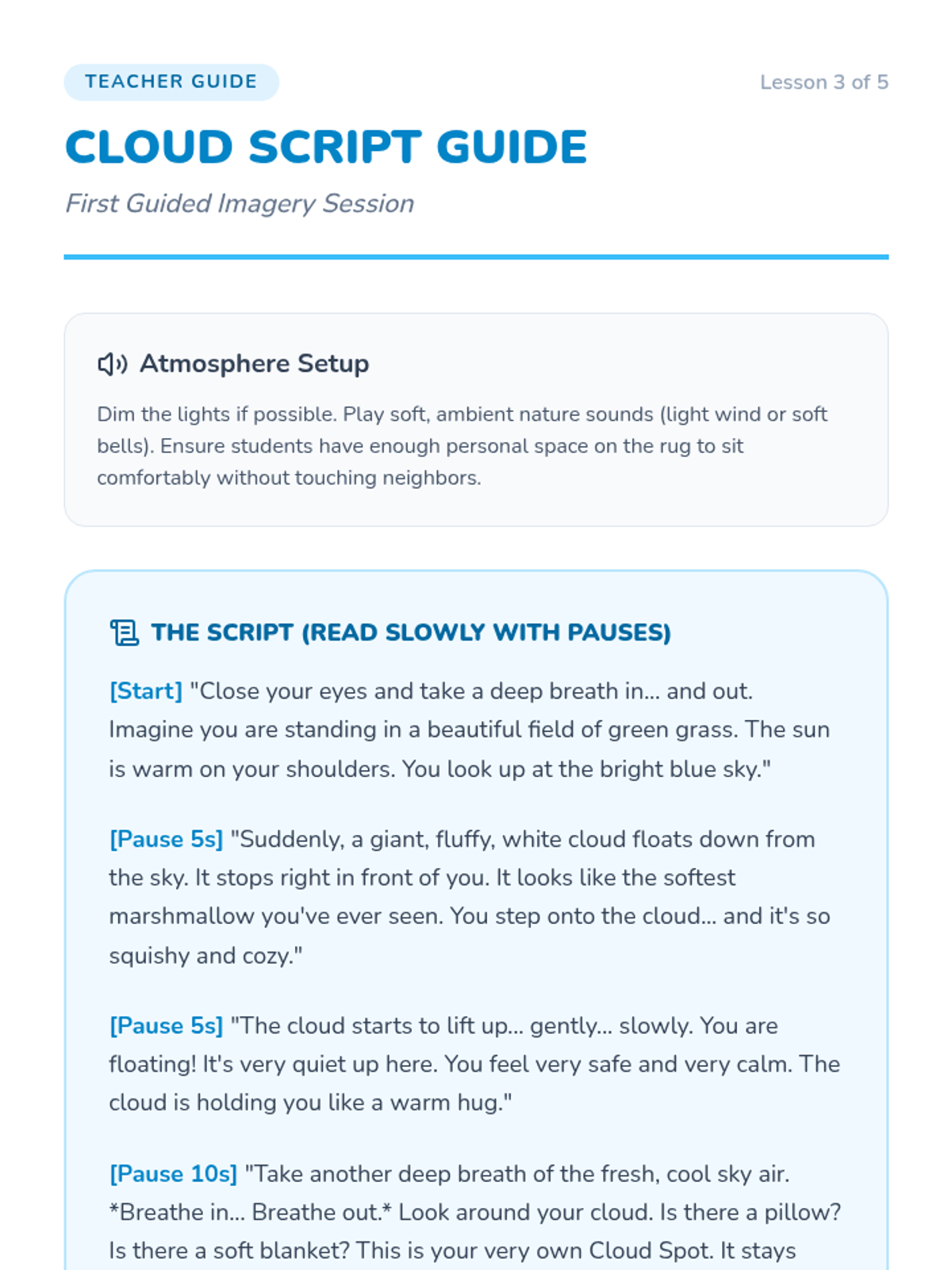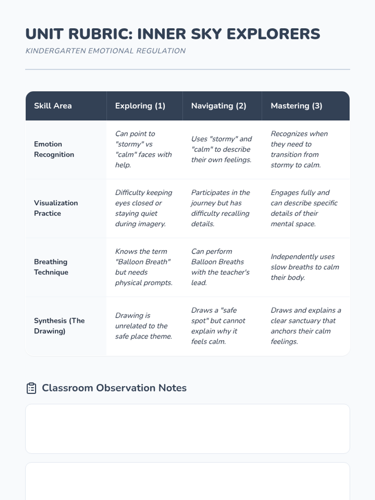 A 5-lesson unit for Kindergarteners to learn emotional regulation through weather-themed emotion recognition and guided imagery. Students progress from identifying 'stormy' versus 'calm' feelings to creating and illustrating their own mental safe places.