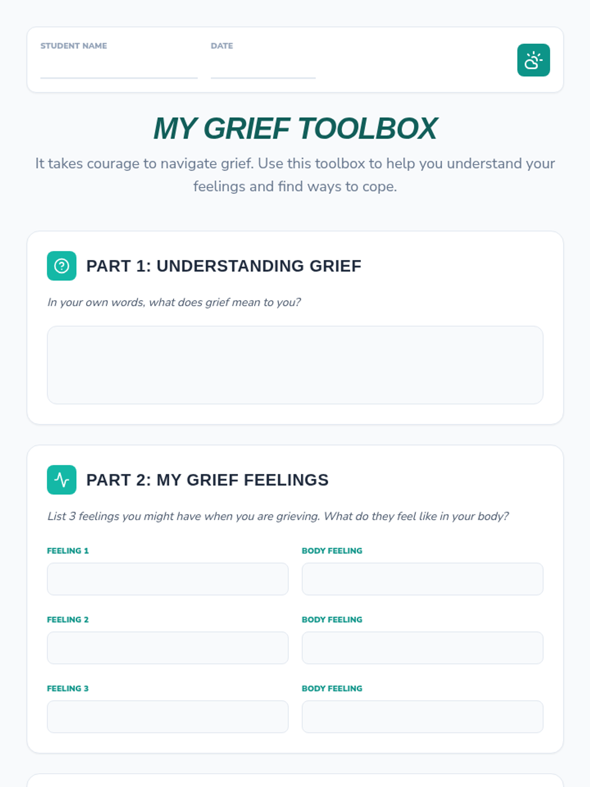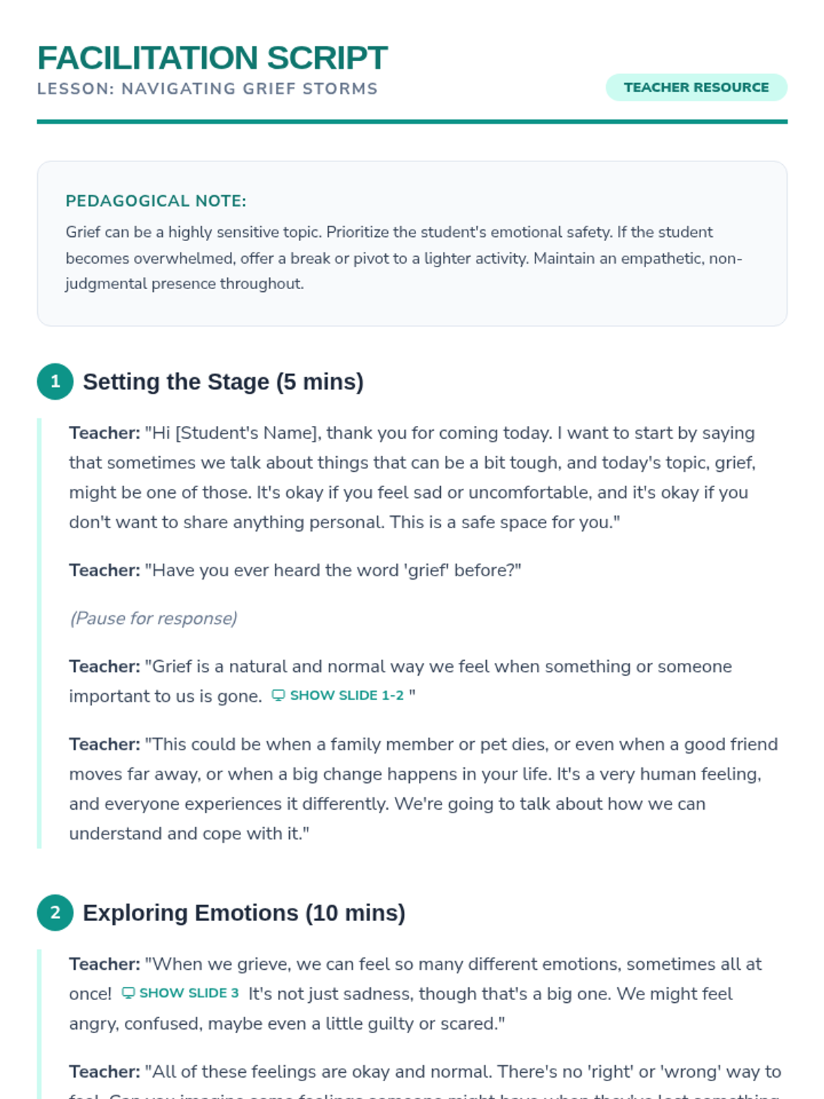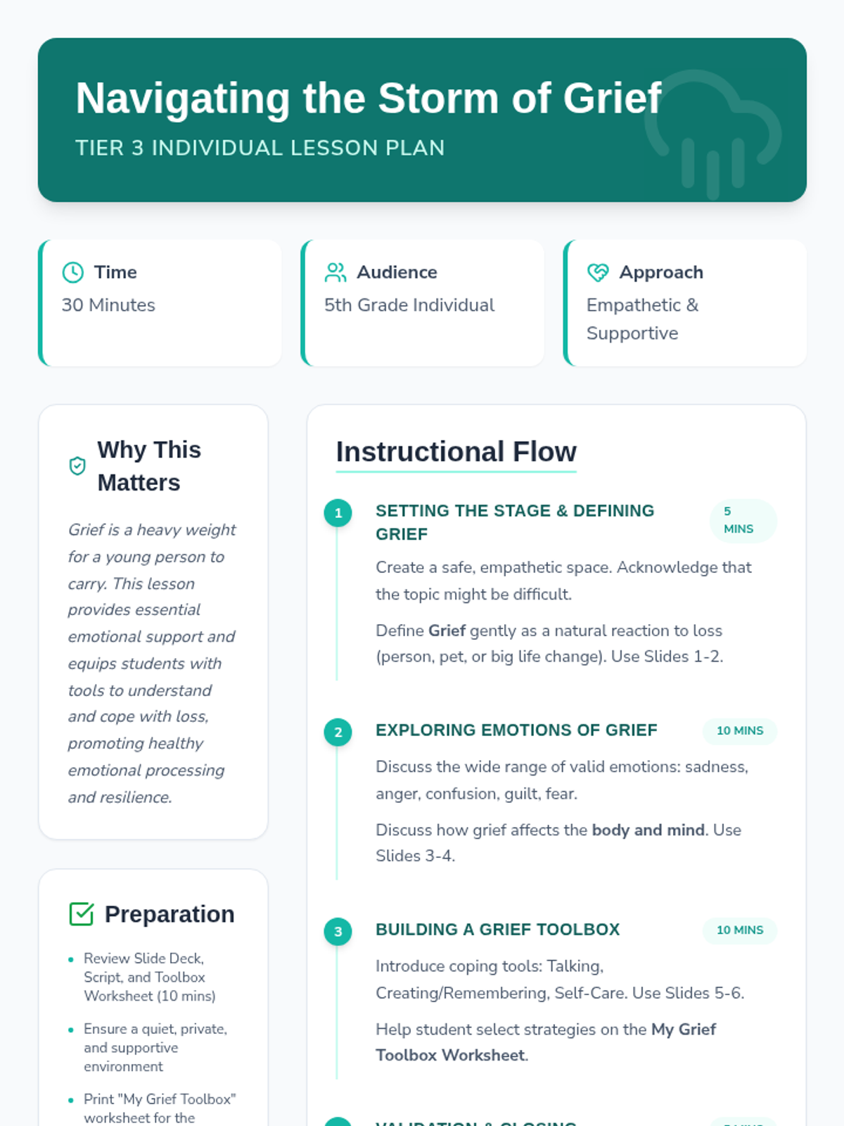 A comprehensive individual lesson sequence for 5th-grade students focusing on emotional intelligence, specifically self-regulation skills and navigating the complex emotions of grief.