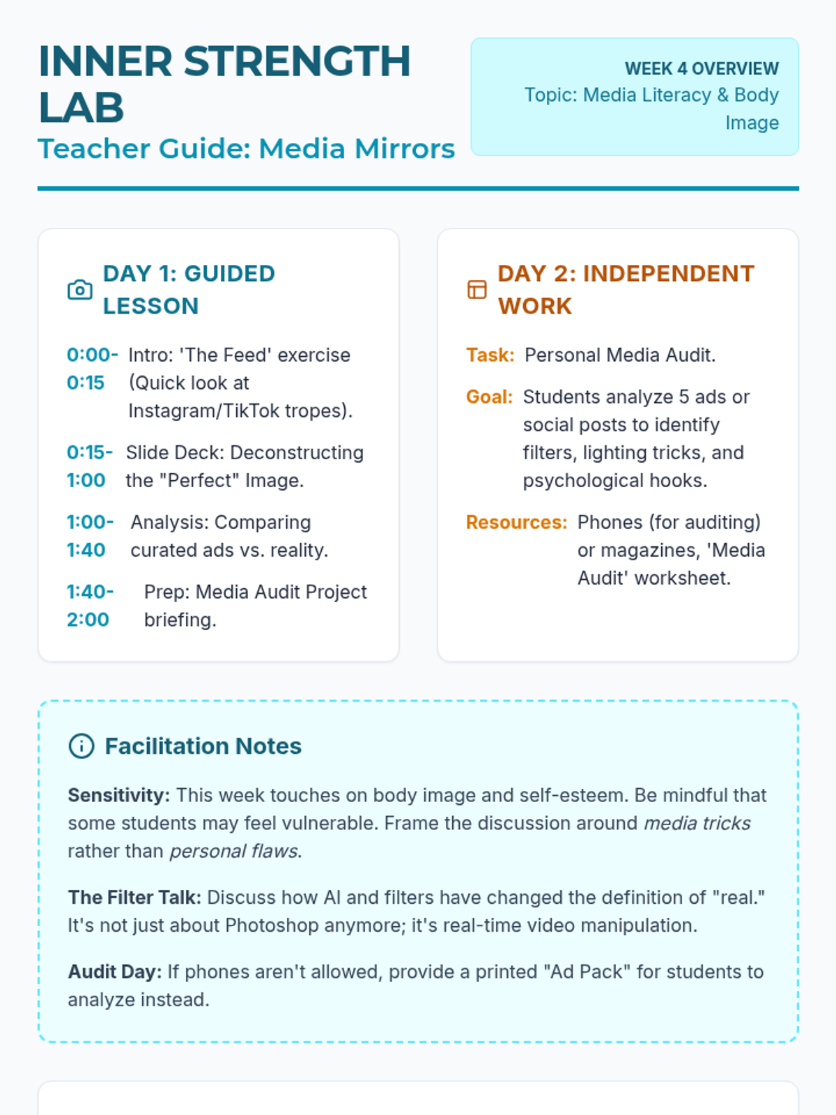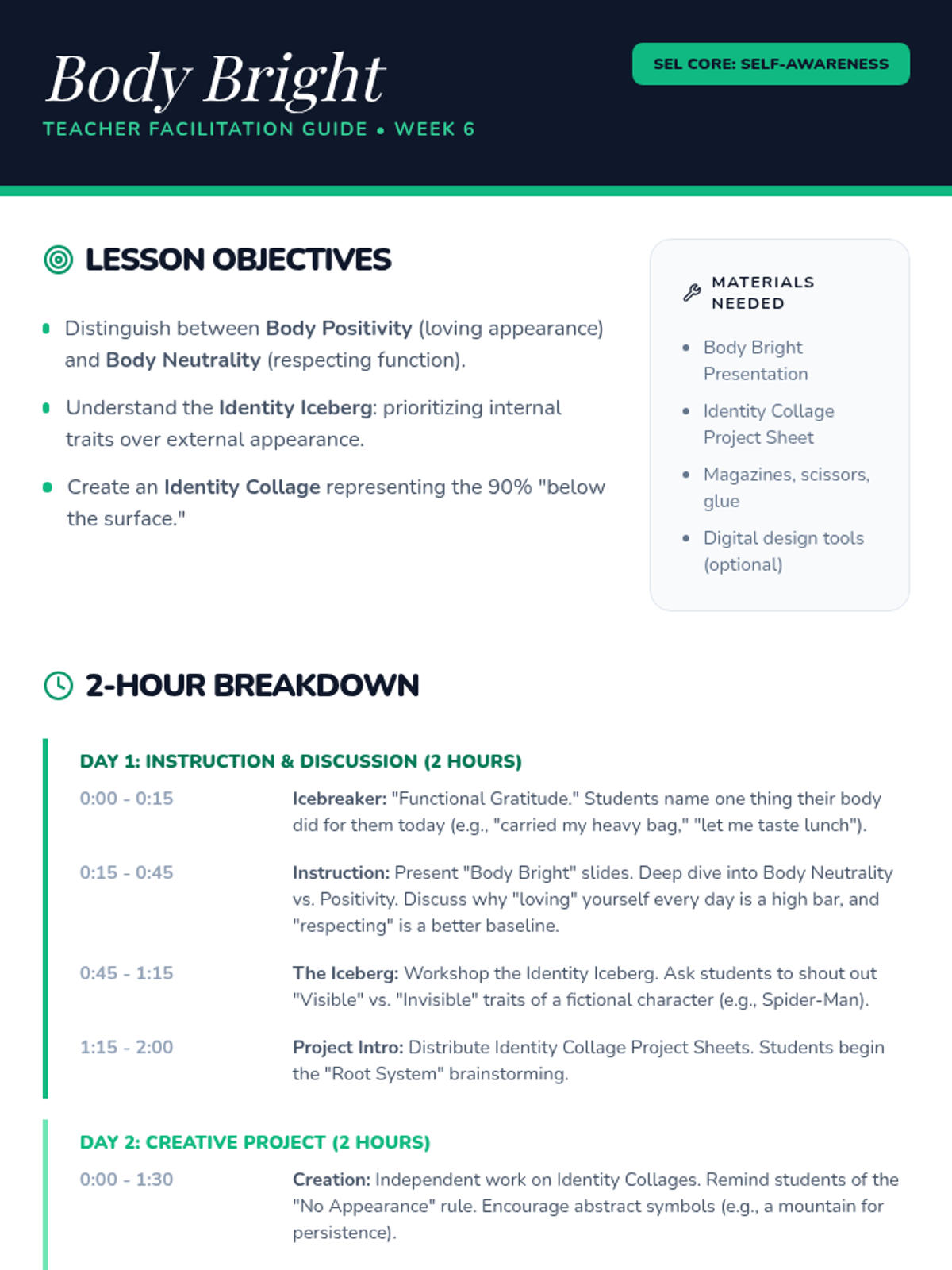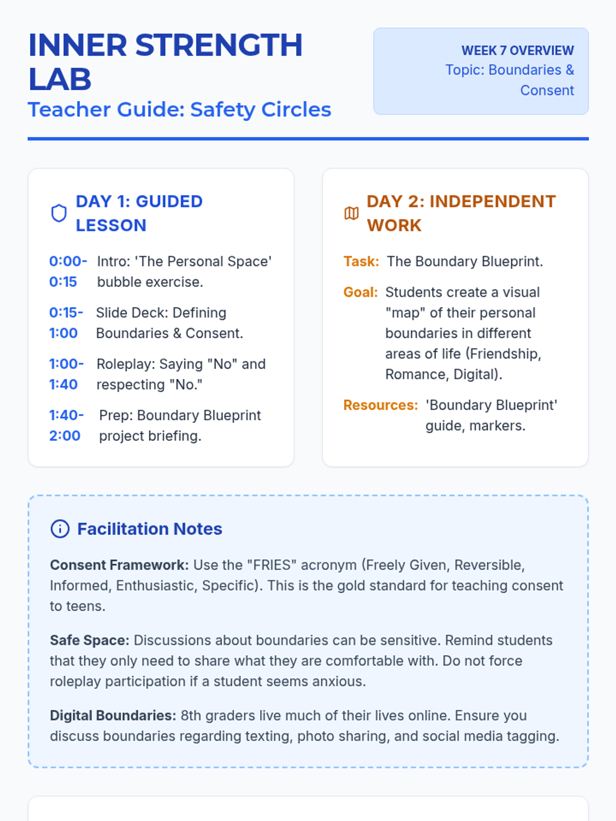 A comprehensive 9-week social-emotional learning curriculum for 8th graders focusing on anxiety, self-esteem, and healthy relationships. Designed for two 2-hour sessions per week, with structured instruction on Day 1 and independent creative or research projects on Day 2.
