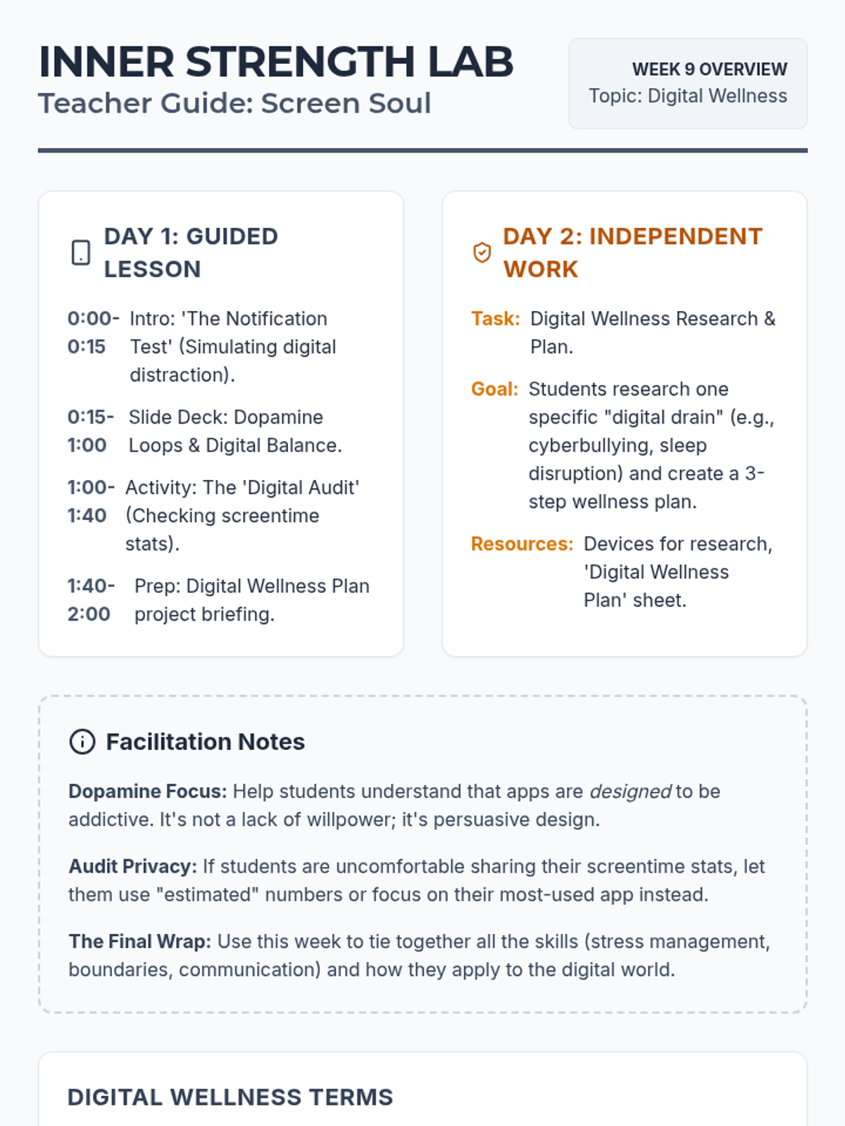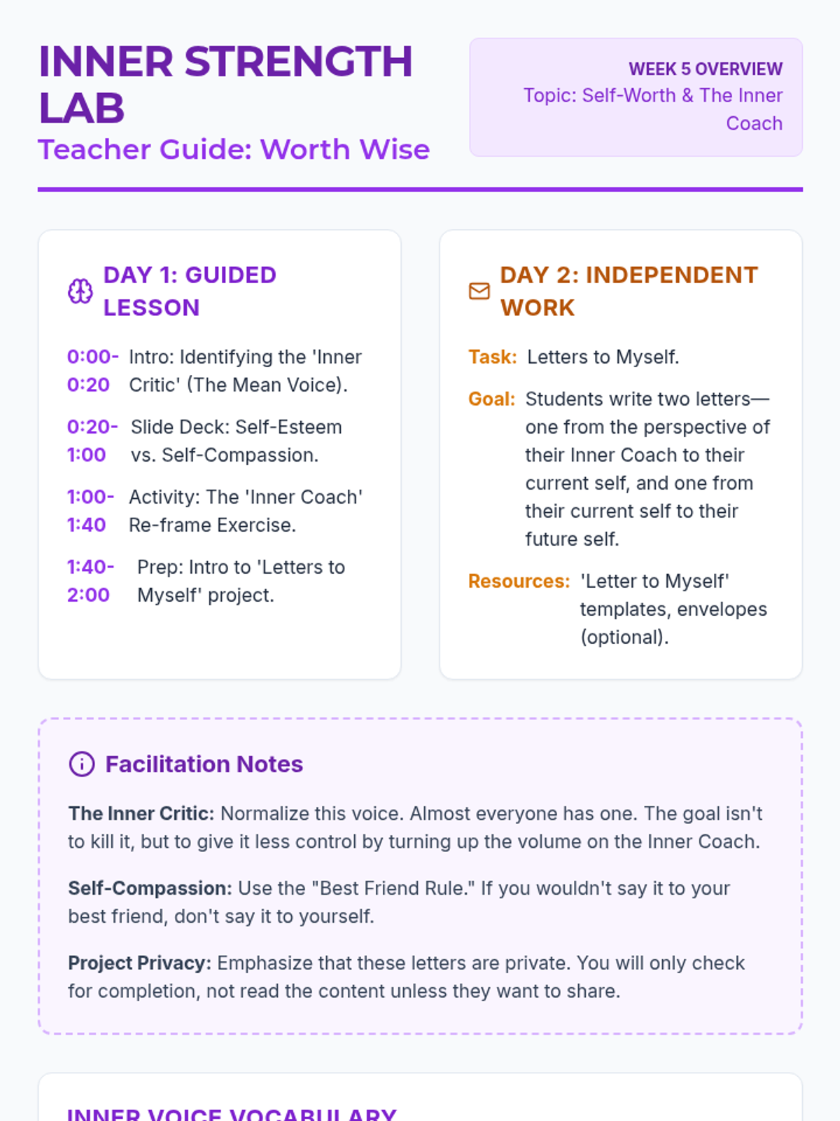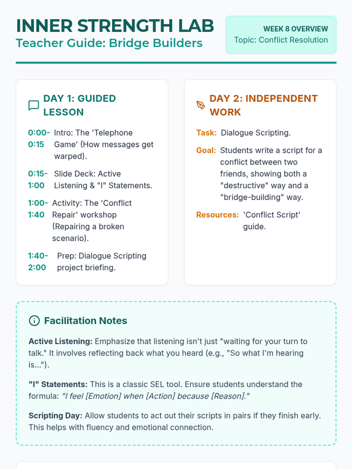 A comprehensive 9-week social-emotional learning curriculum for 8th graders focusing on anxiety, self-esteem, and healthy relationships. Designed for two 2-hour sessions per week, with structured instruction on Day 1 and independent creative or research projects on Day 2.