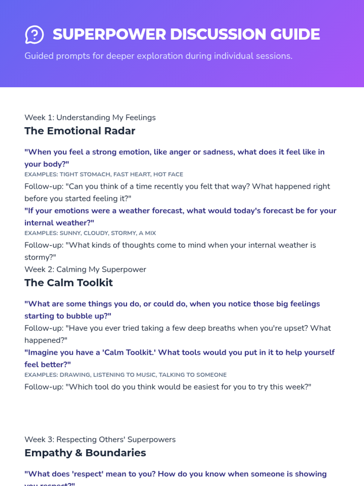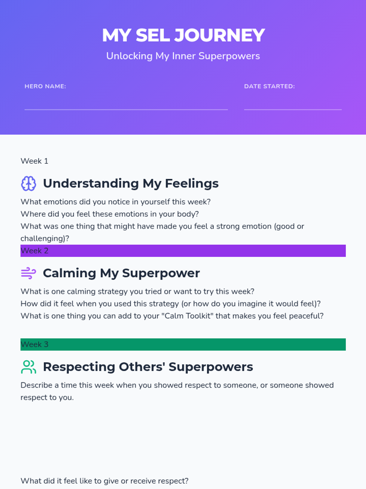 A 5-week individual SEL program for a 5th-grade girl, focusing on self-regulation, respect, self-esteem, and positive decision-making through the lens of 'Inner Superpowers'.