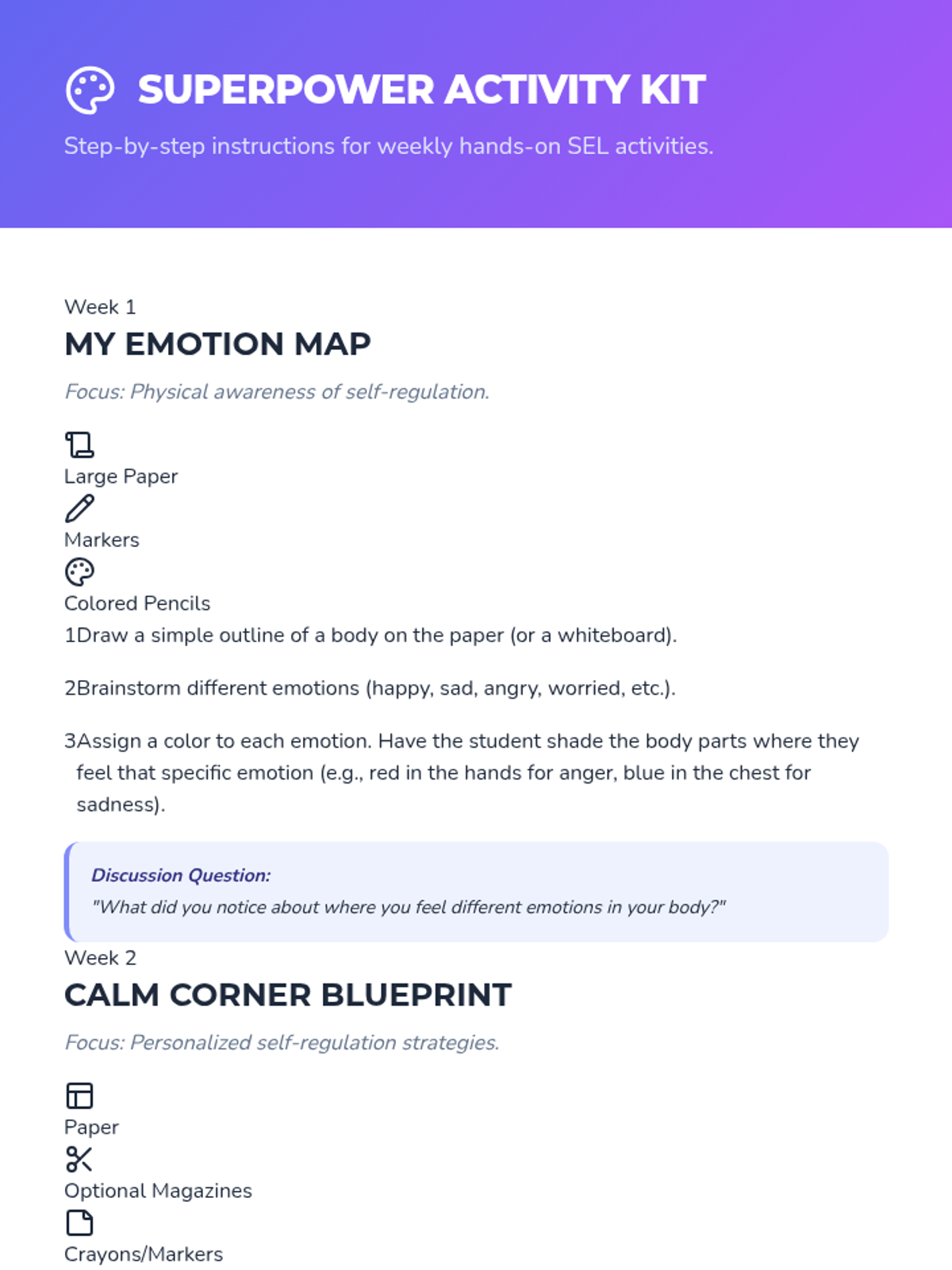 A multi-day social-emotional learning sequence that teaches students how to identify, manage, and communicate difficult emotions like anger and conflict using the metaphor of an 'Emotional Backpack'. Designed with high-visual support for EAL and neurodivergent learners.