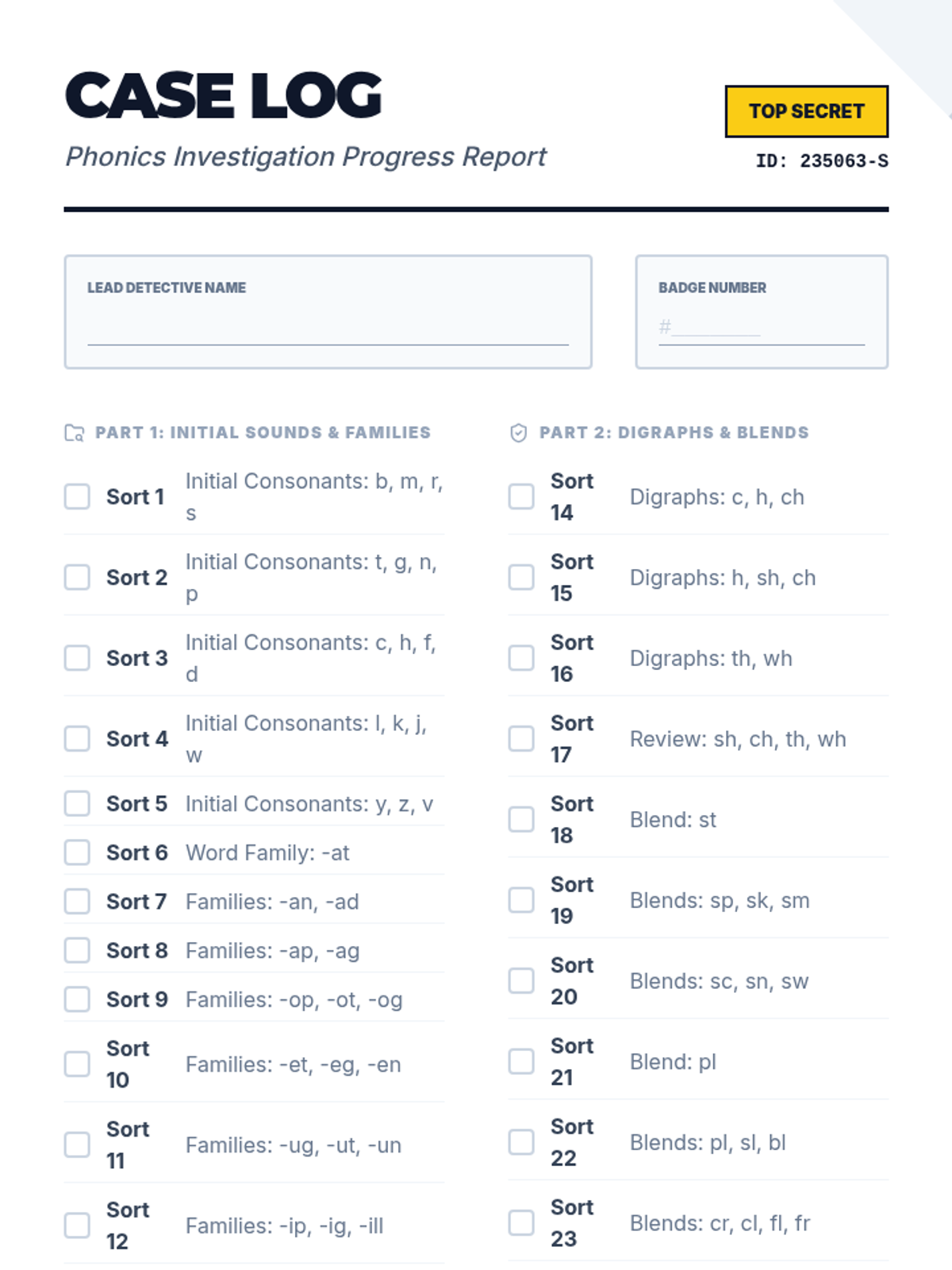 A comprehensive 5-day phonics curriculum where students become 'Phonics Detectives' to solve mysteries involving CVC words, blends, digraphs, vowel teams, and multi-syllabic words. Includes teacher guides, slides, student case files, and hands-on center activities.