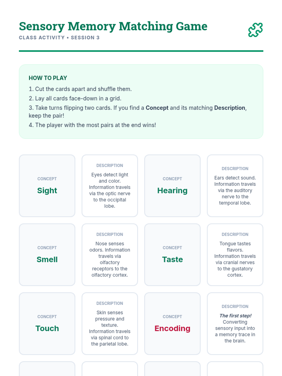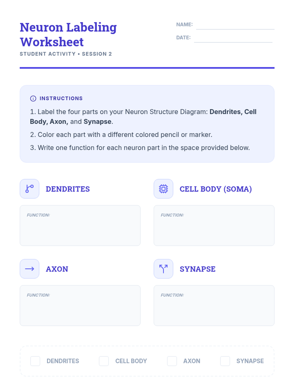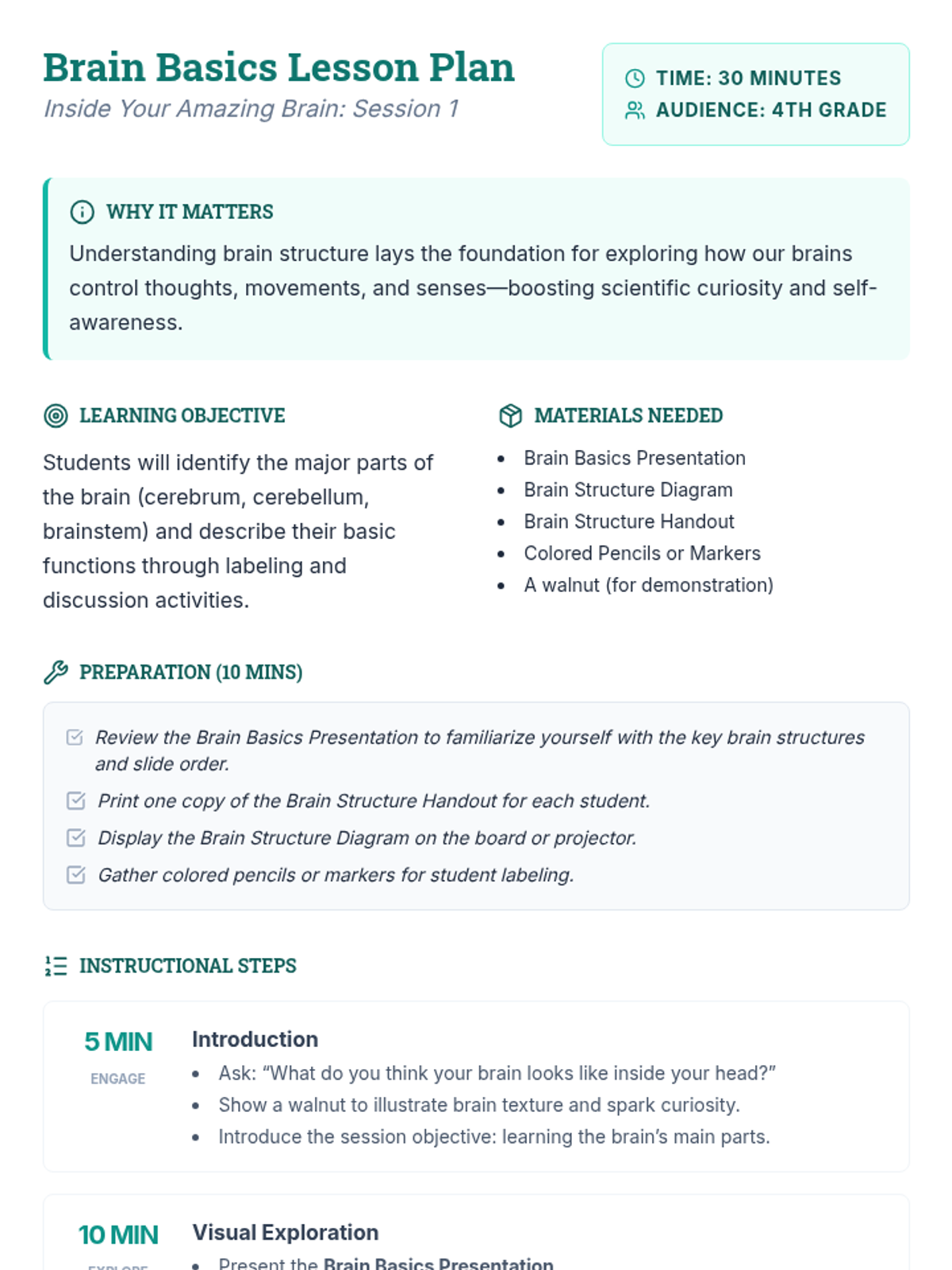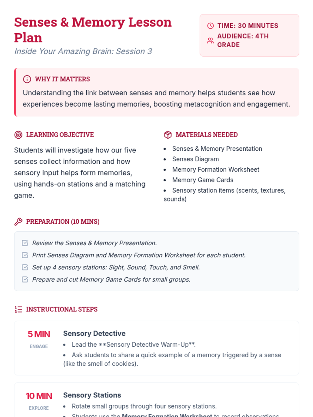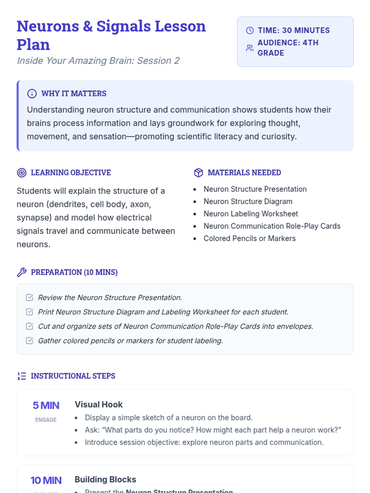 A three-session introductory neuroscience unit for 4th graders exploring brain anatomy, neuron communication, and the relationship between senses and memory.
