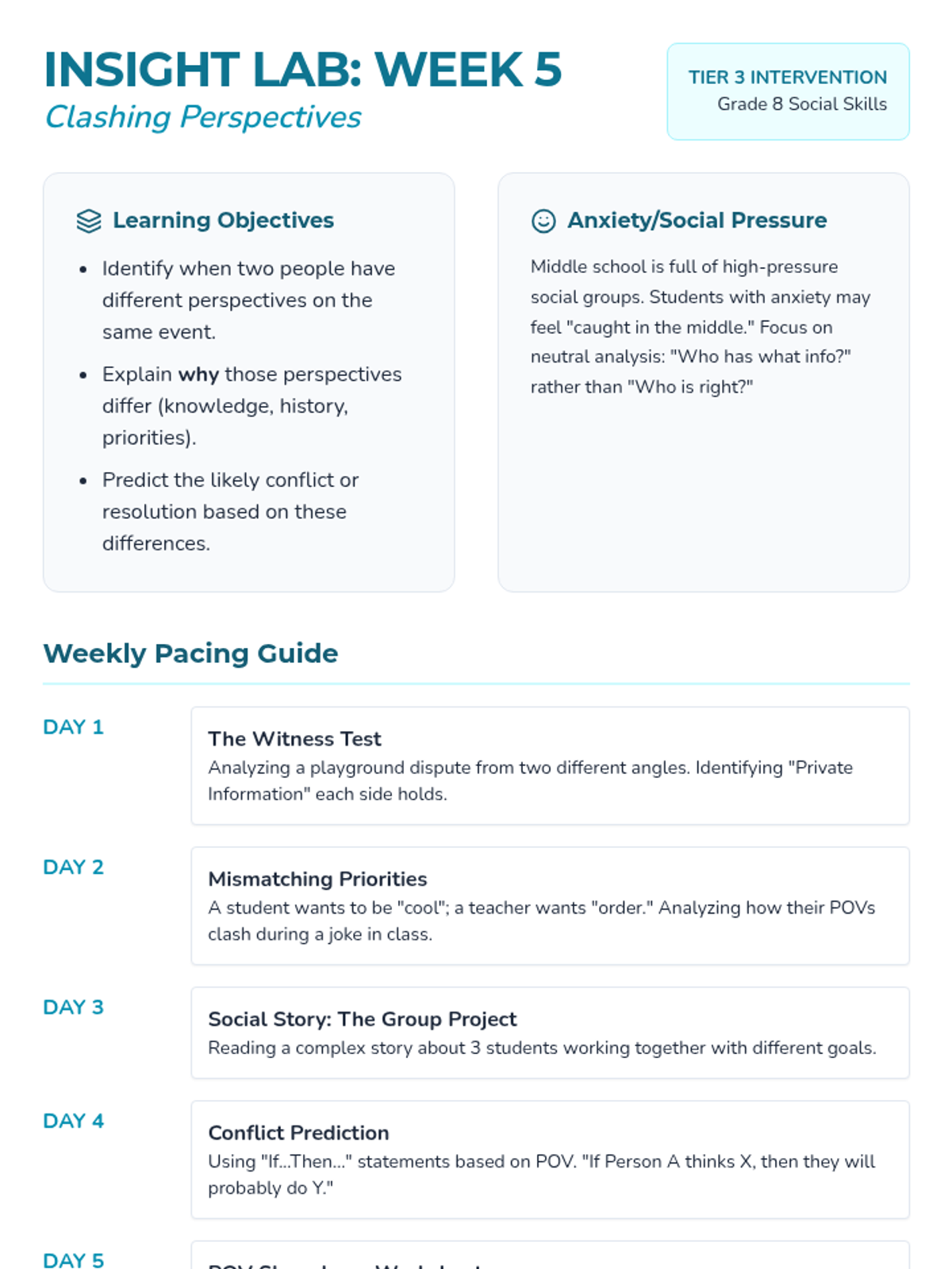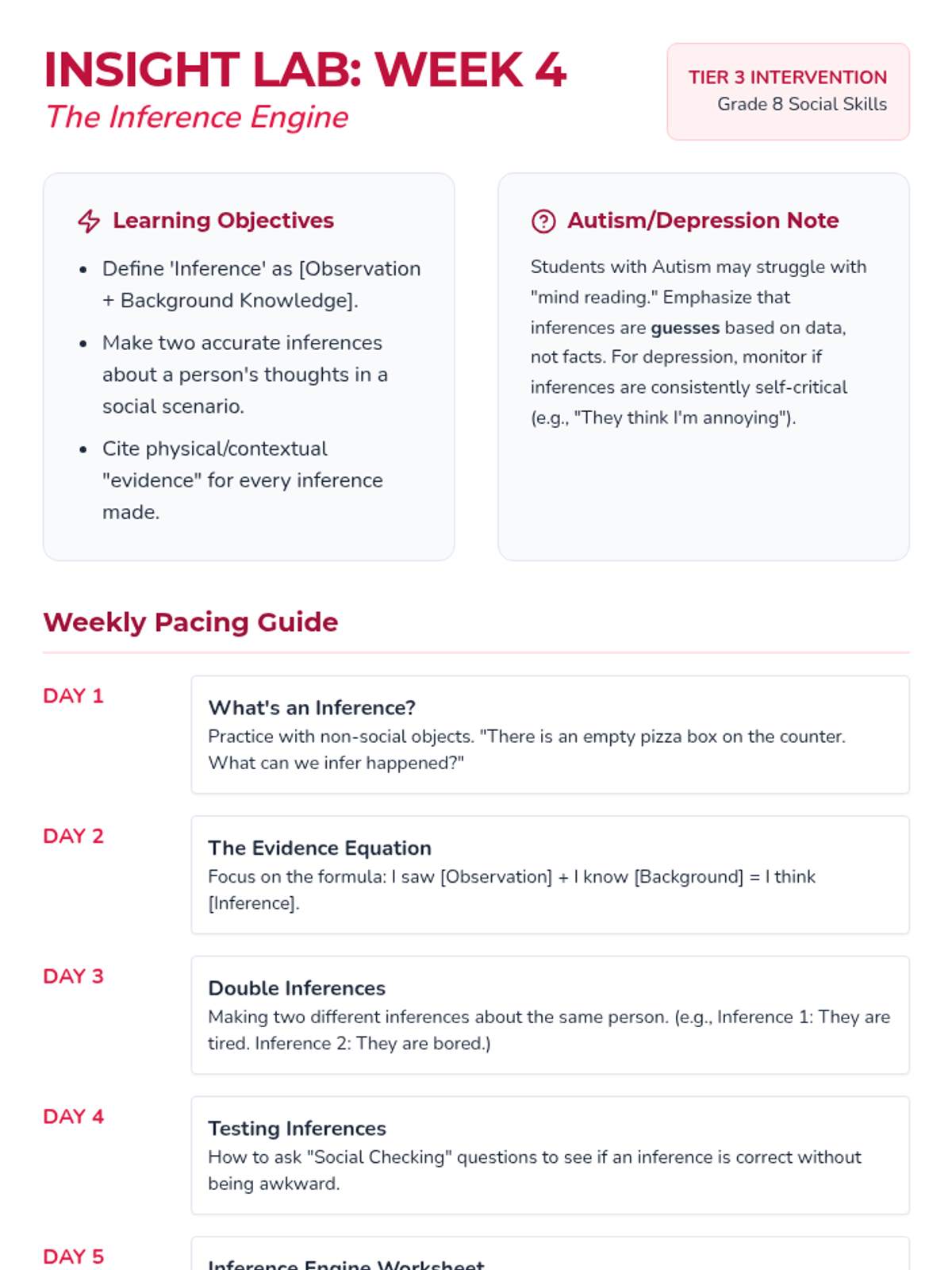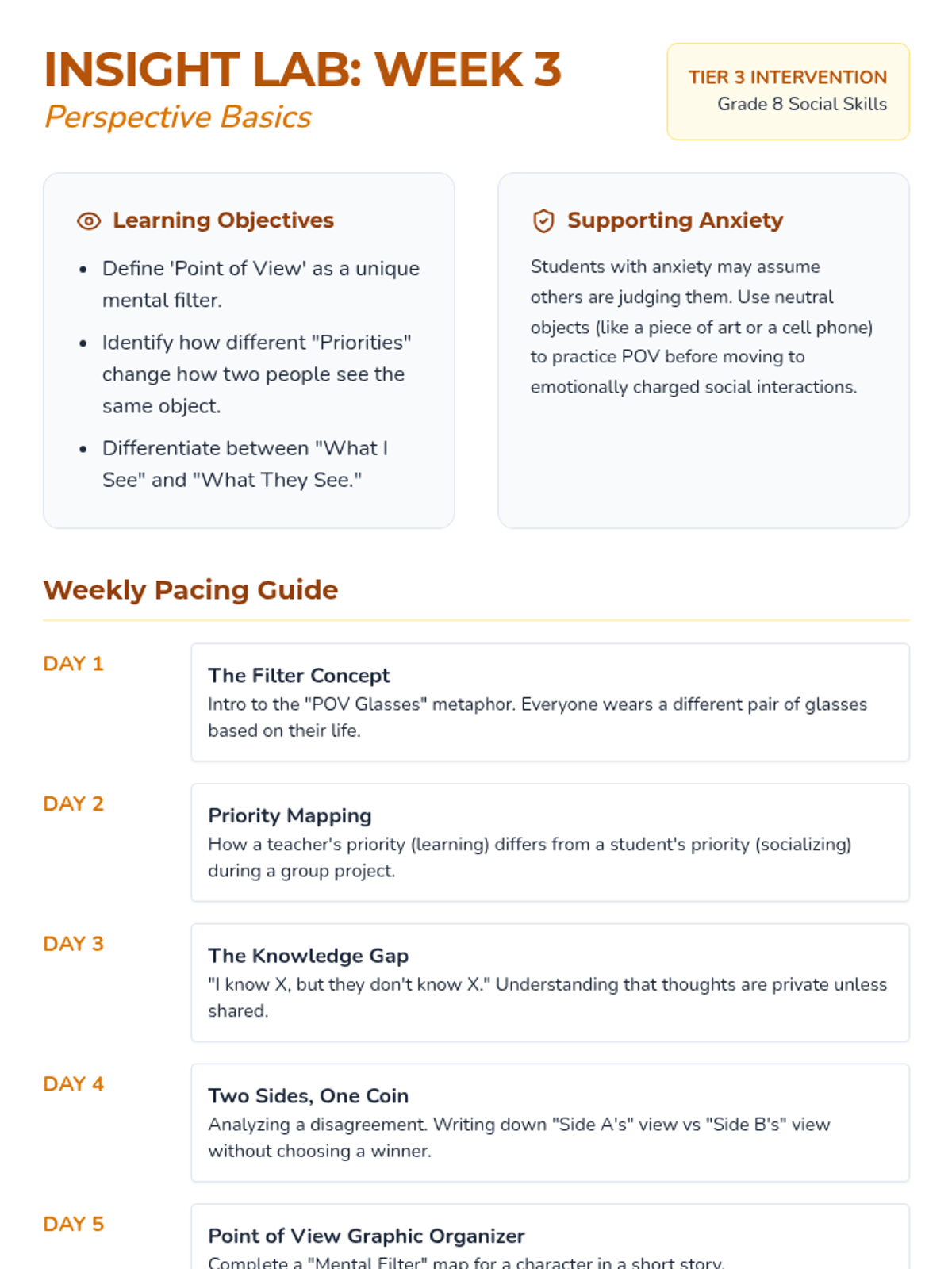 A 6-week Tier 3 intervention program for 8th-grade students to master emotional recognition and perspective-taking through intensive, evidence-based practices.
