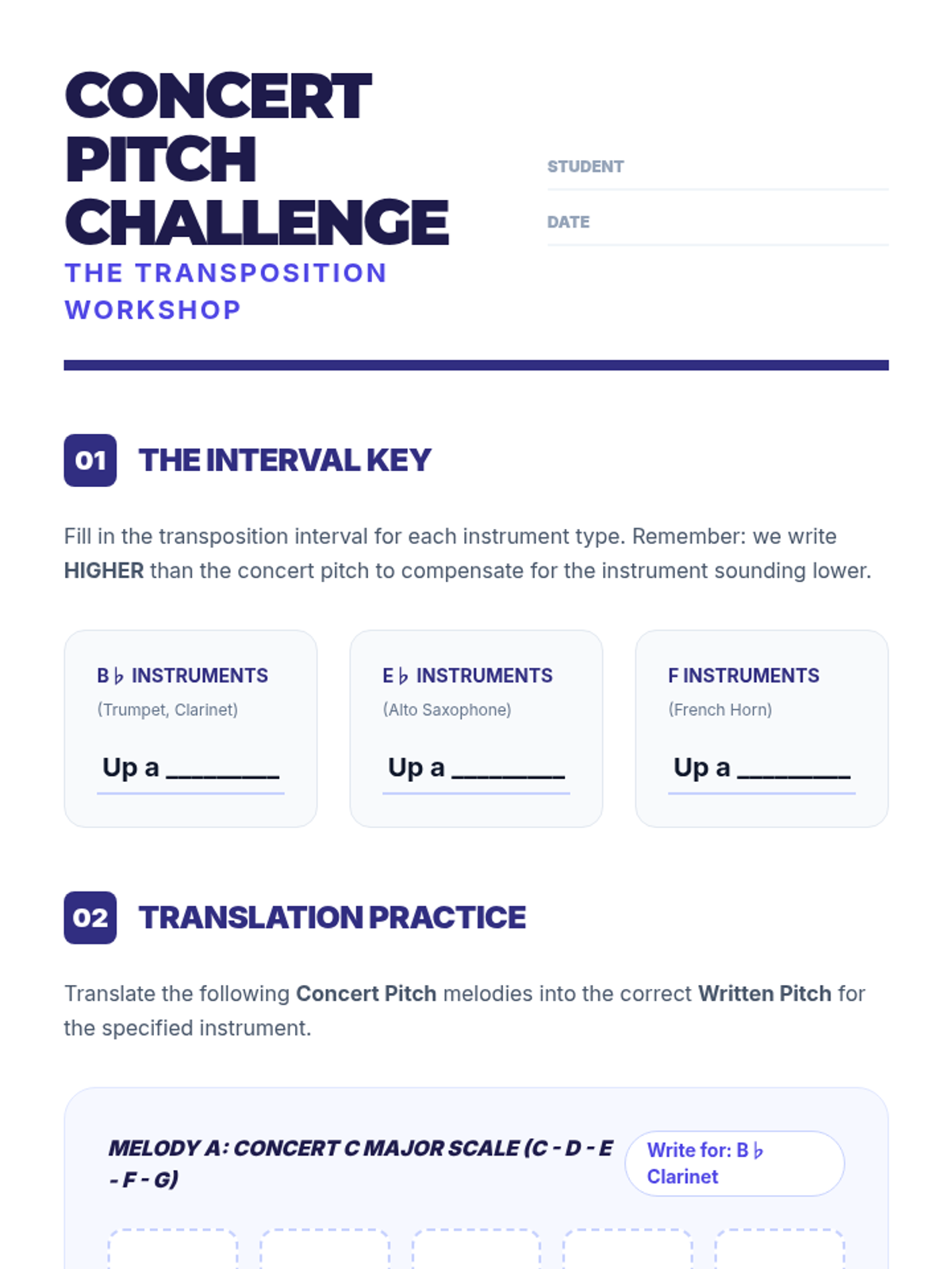 An 8-week intensive for band students to level up their music literacy, moving from basic note identification to fluently reading complex scores. Students will master ledger lines, key signatures, navigation markings, and ensemble sight-reading through a "Music Mission Control" theme.