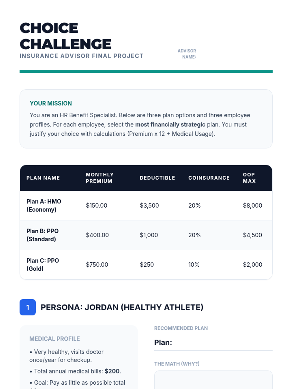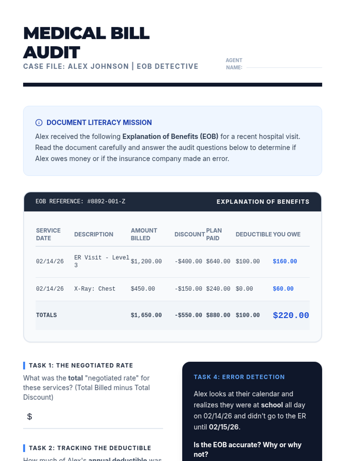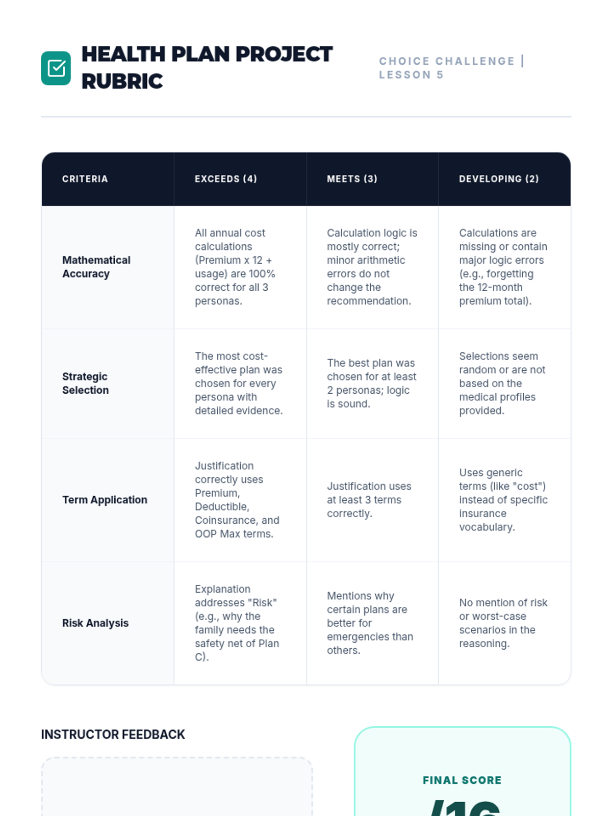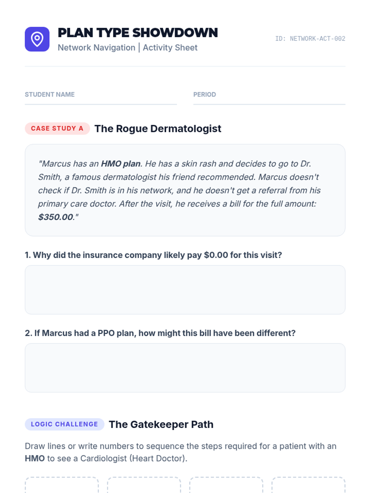 A comprehensive unit on health insurance for 9th-grade students, covering essential terminology, provider networks, document literacy, and strategic plan selection. Students learn to navigate the financial complexities of the US healthcare system to make informed choices.