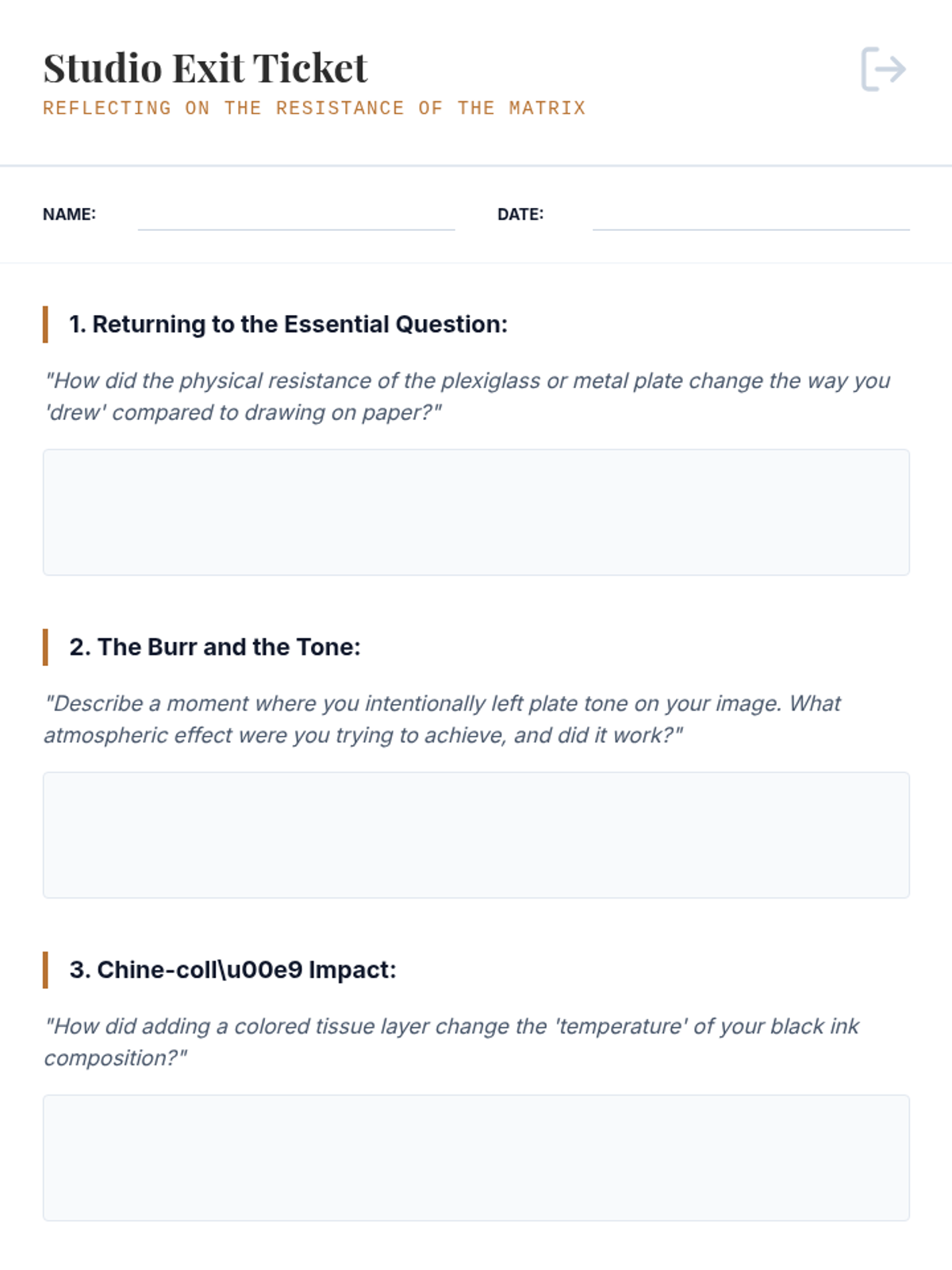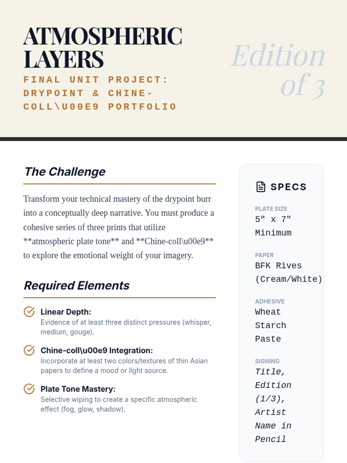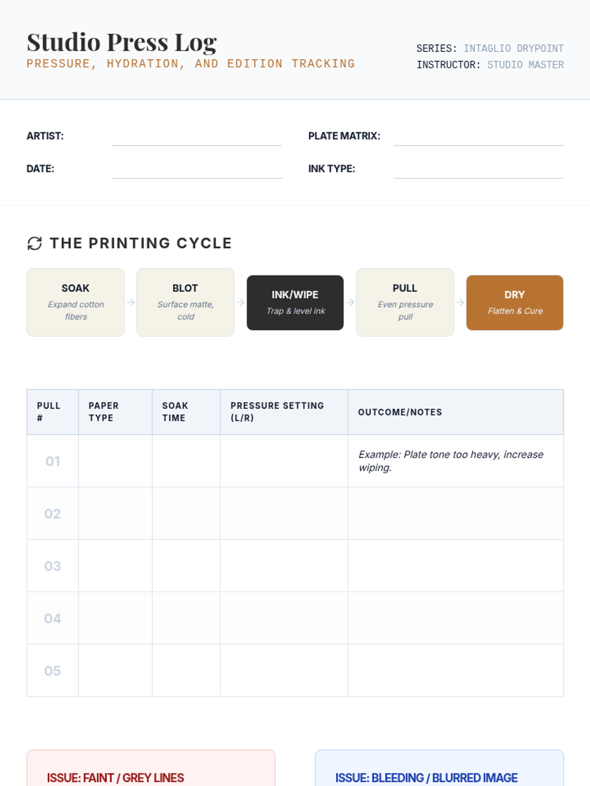 A comprehensive 11th-grade unit on the mechanics of intaglio printmaking, focusing on drypoint techniques, plate preparation, the chemistry of wiping, and chine-coll\u00e9 integration. Students master the relationship between physical pressure and visual atmosphere.