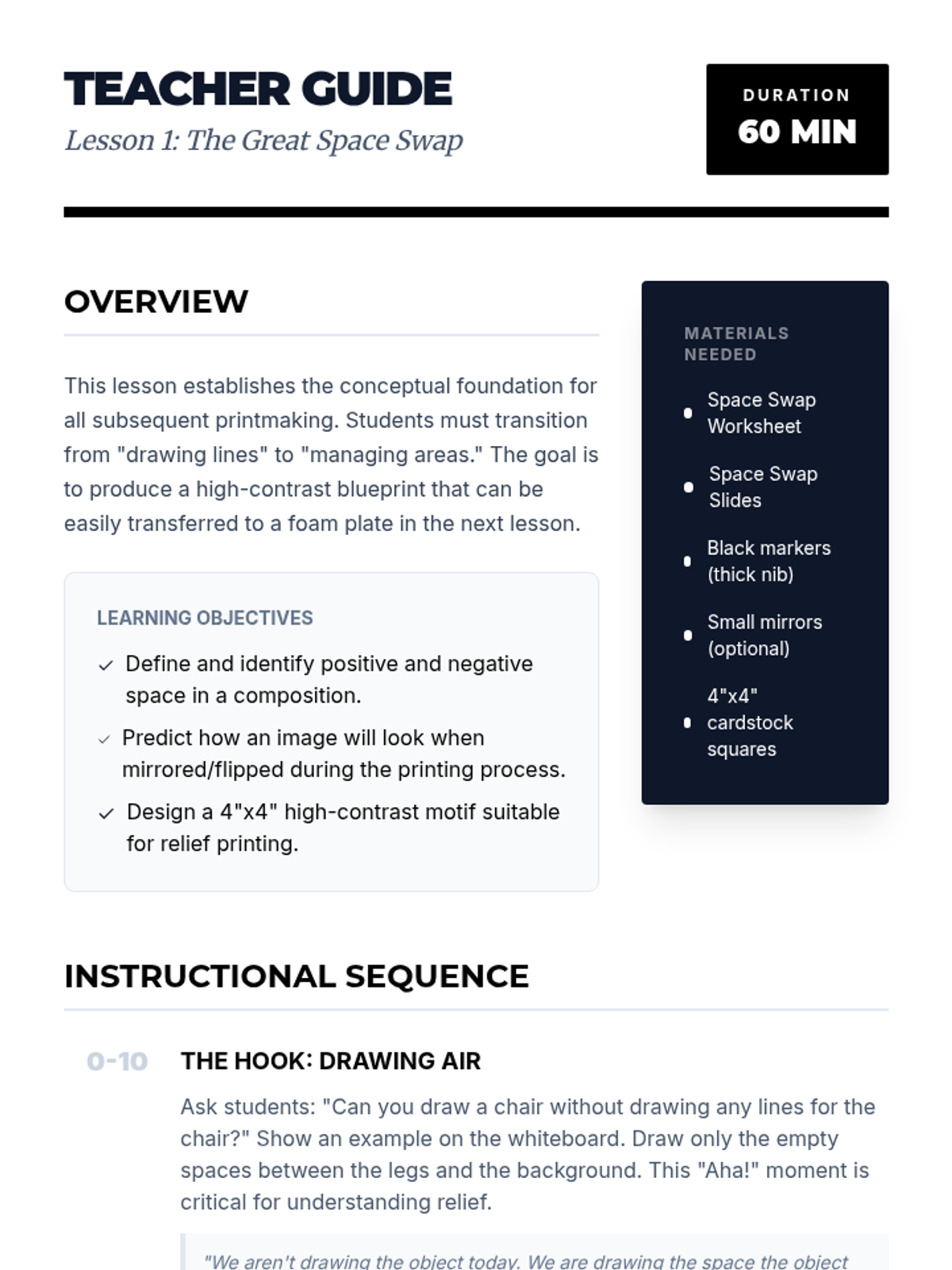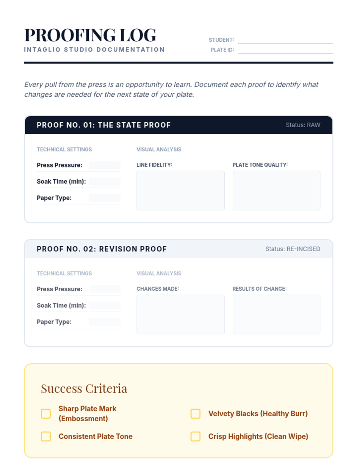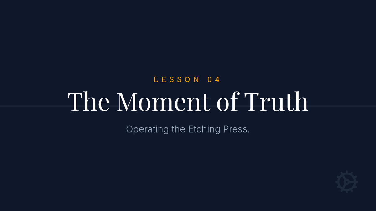 A comprehensive 12th-grade unit on intaglio drypoint printing, covering historical context, plate preparation, incising techniques, inking/wiping, press operation, and chine-collé integration. Students move from raw plate preparation to pulling professional-grade prints.