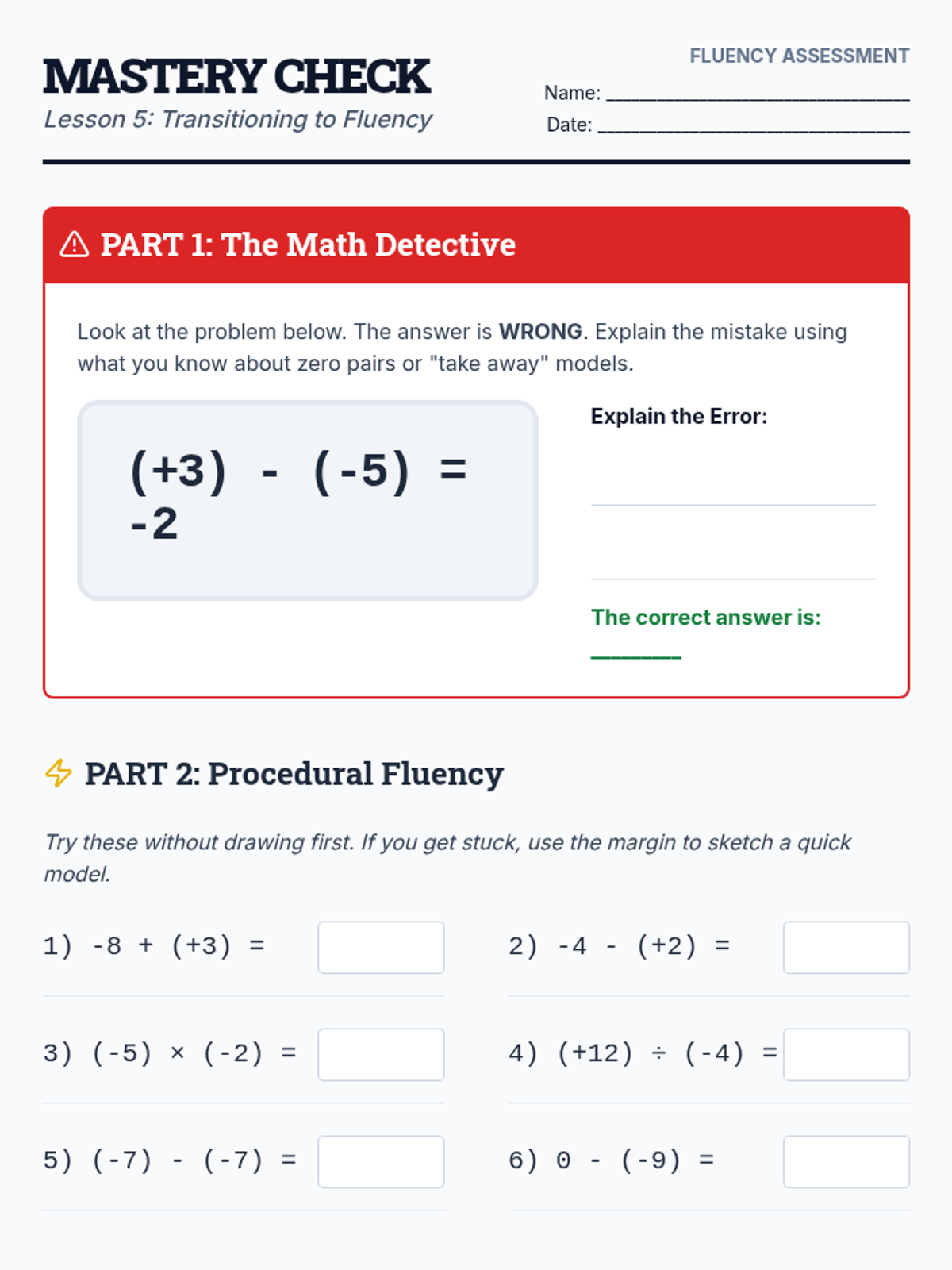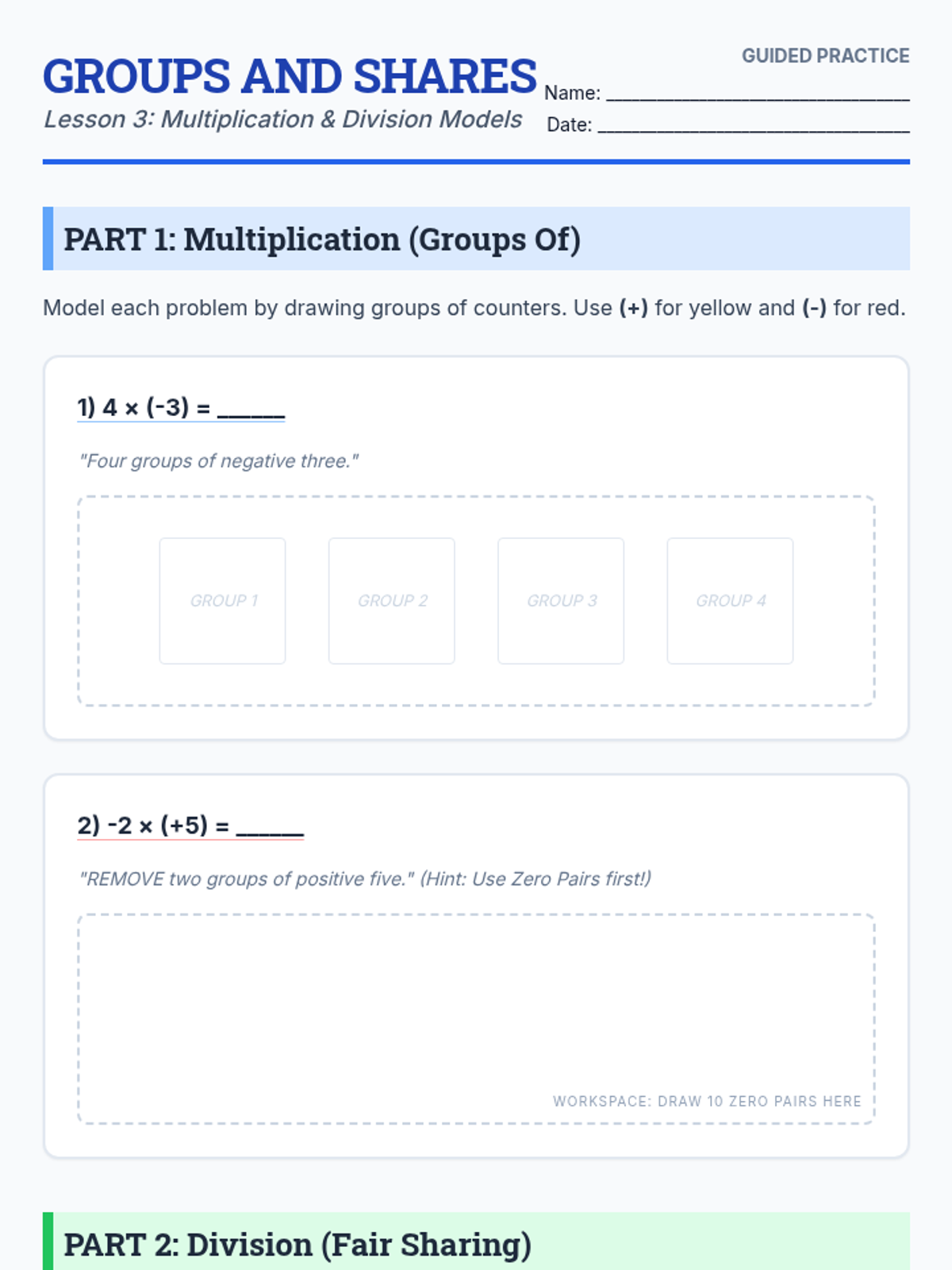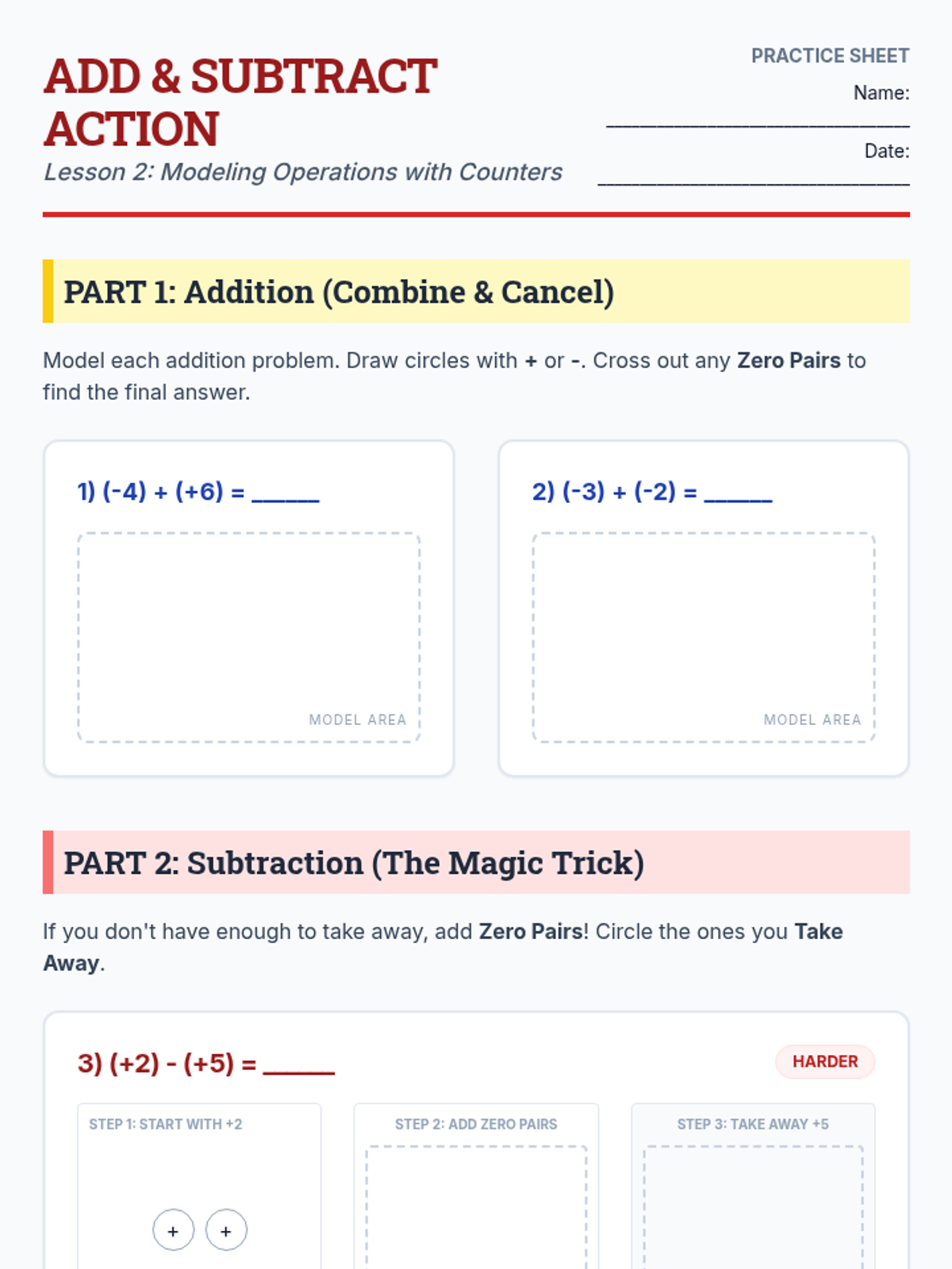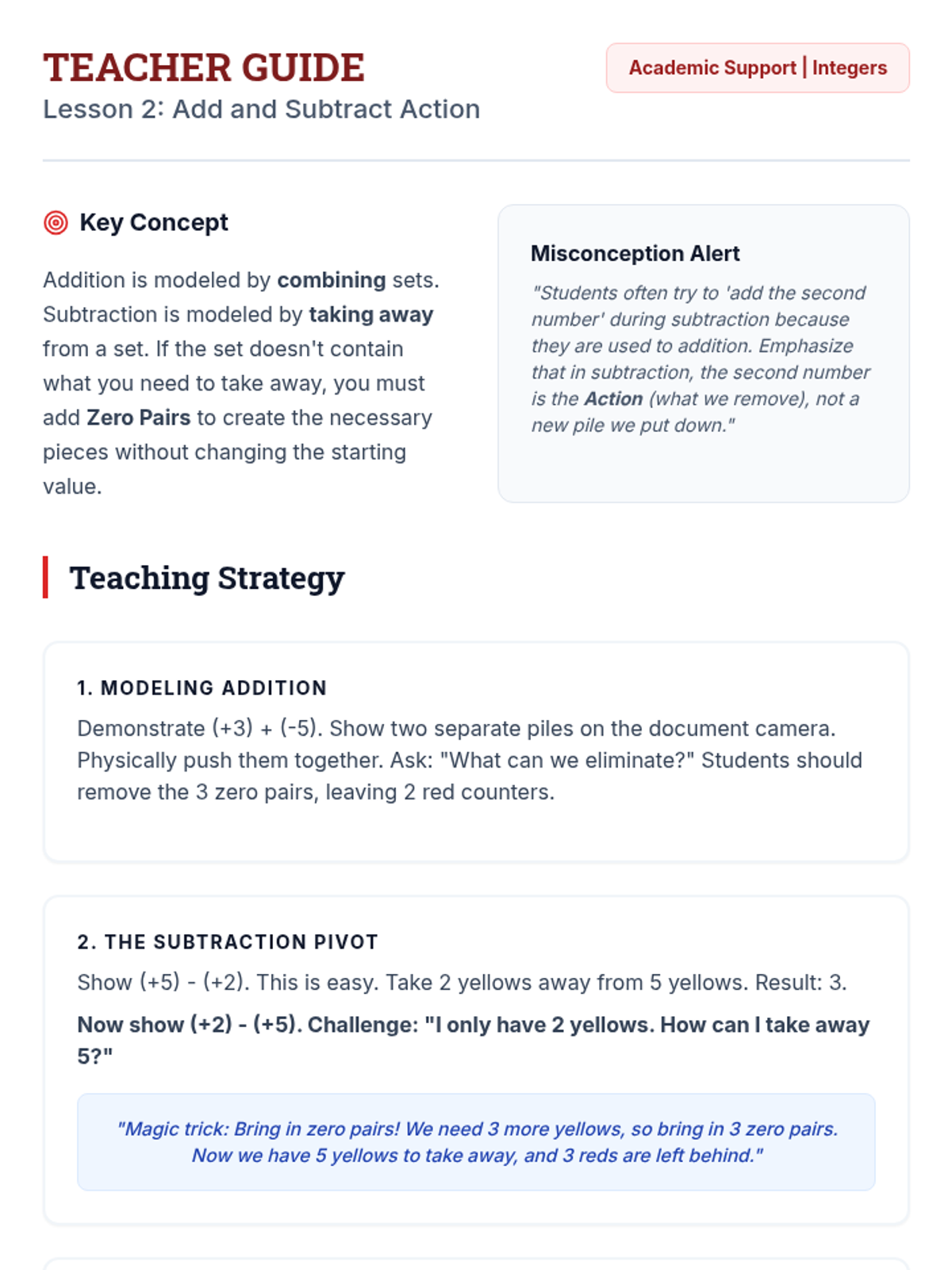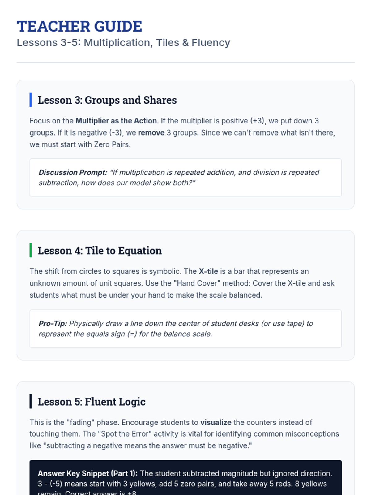 A scaffolded sequence for 10th-grade academic support, focusing on using two-color counters and algebra tiles to master integer operations and transition to algebraic reasoning. This sequence moves from concrete manipulation to representational drawing and finally to abstract procedural fluency.