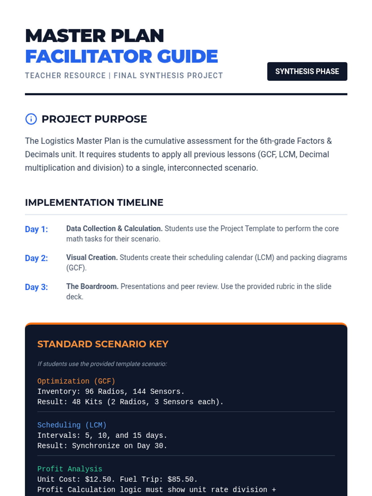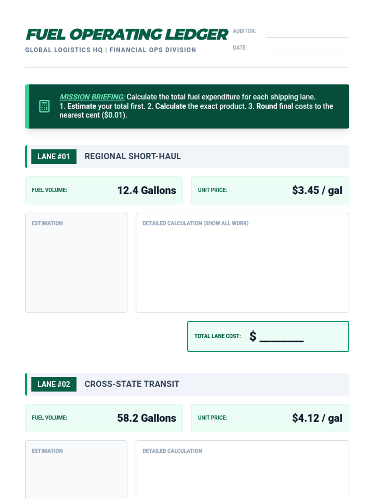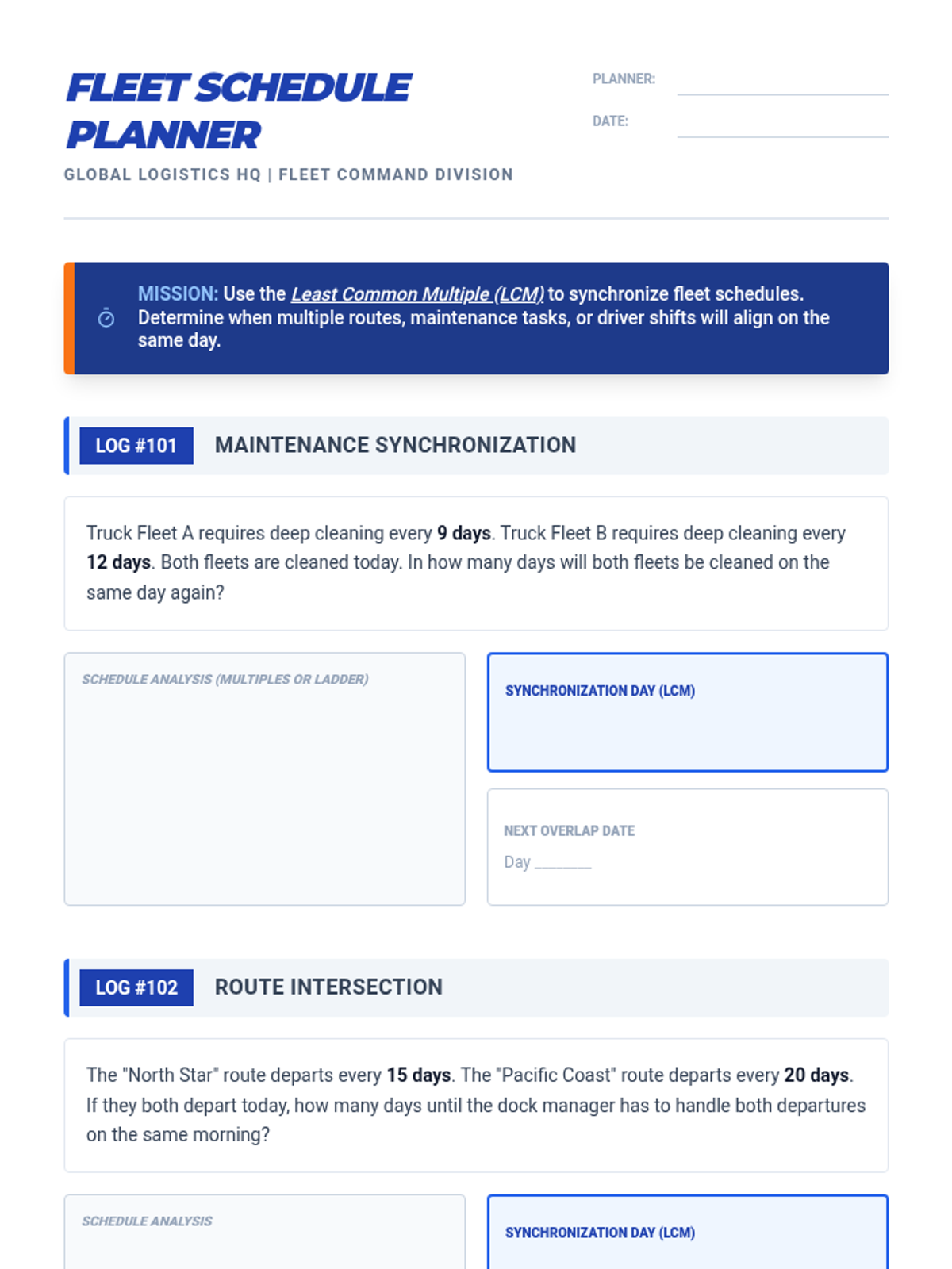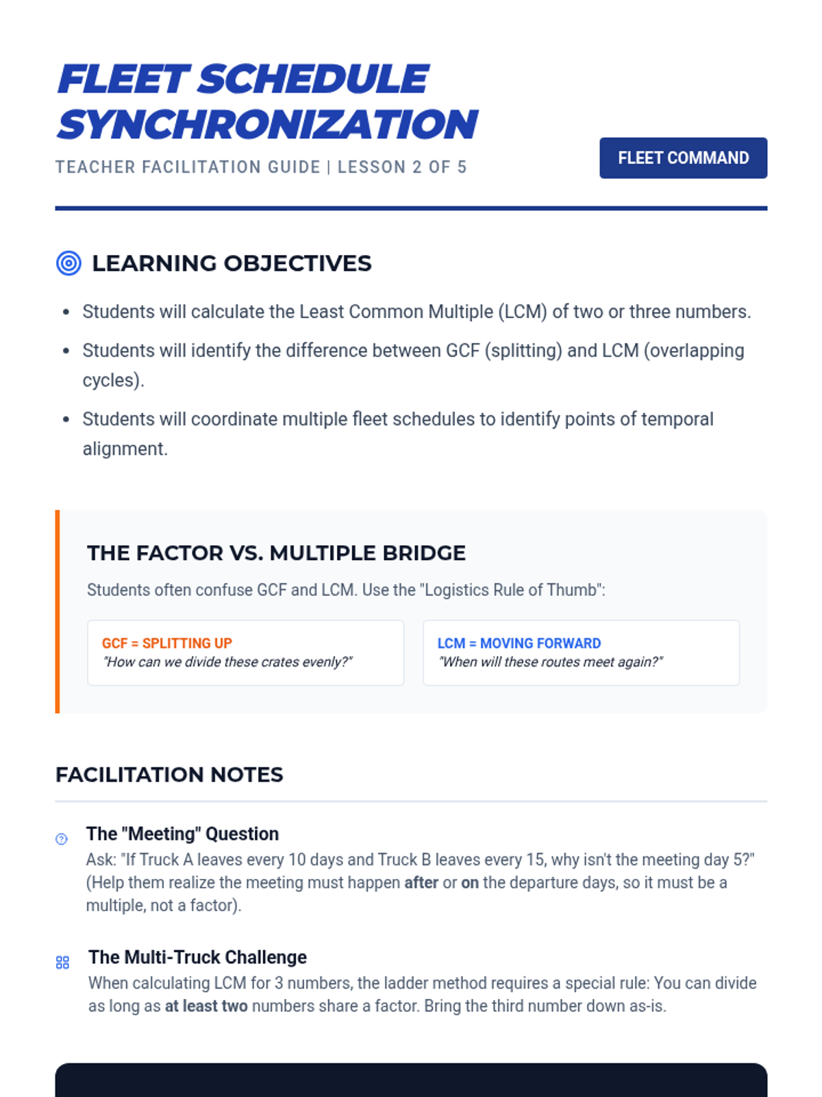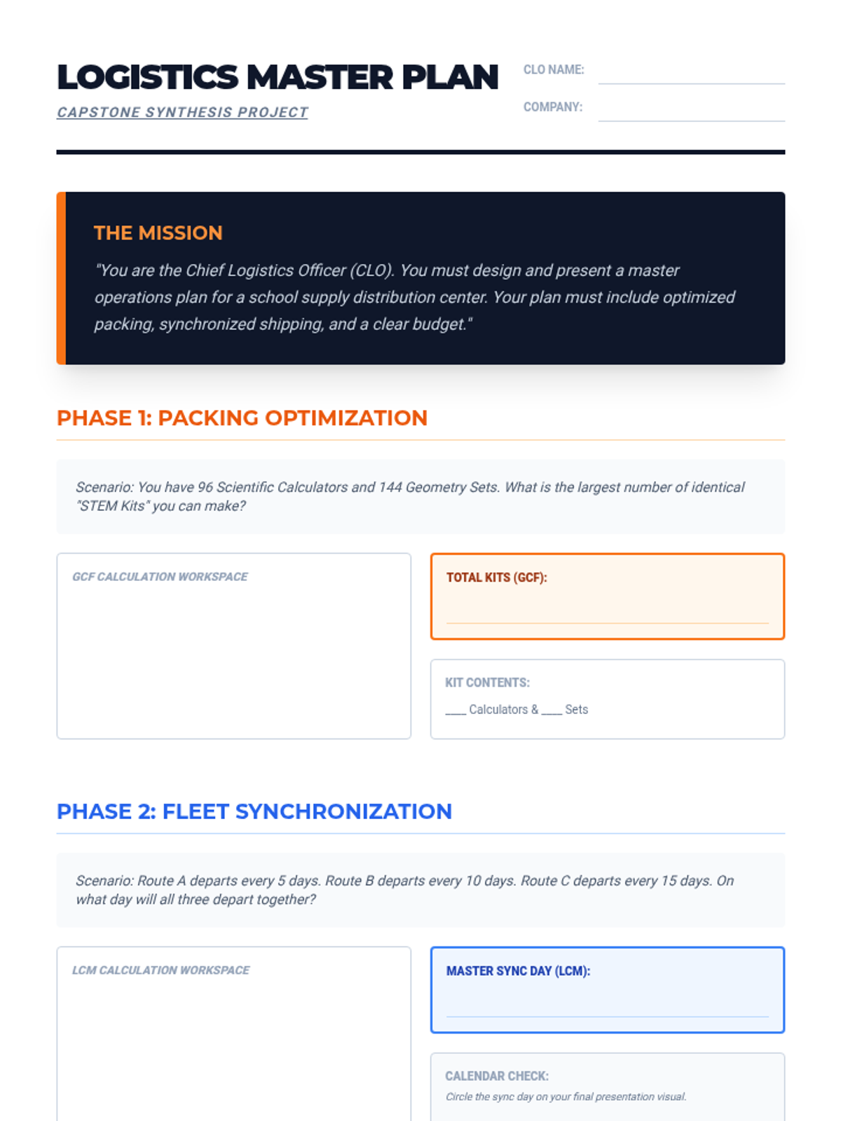 A 6th-grade math unit that applies GCF, LCM, and decimal operations to real-world logistics and supply chain management. Students act as logistics managers, optimizing cargo loads, scheduling fleet departures, and calculating operating costs and profit margins.
