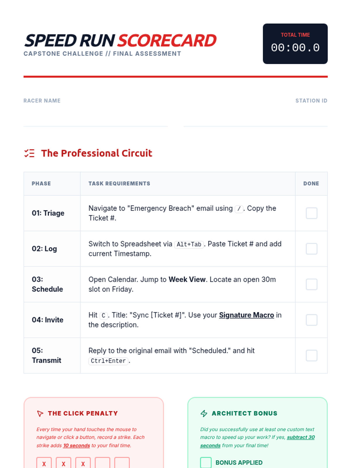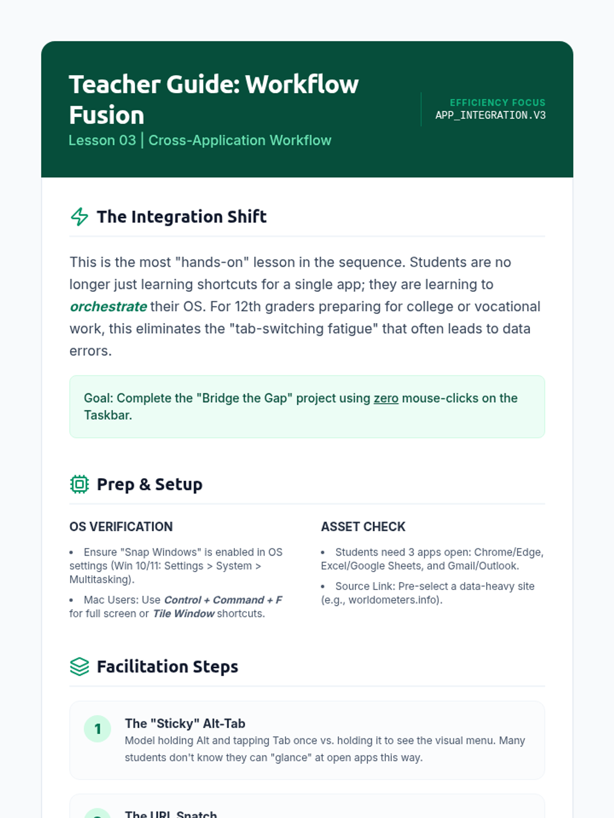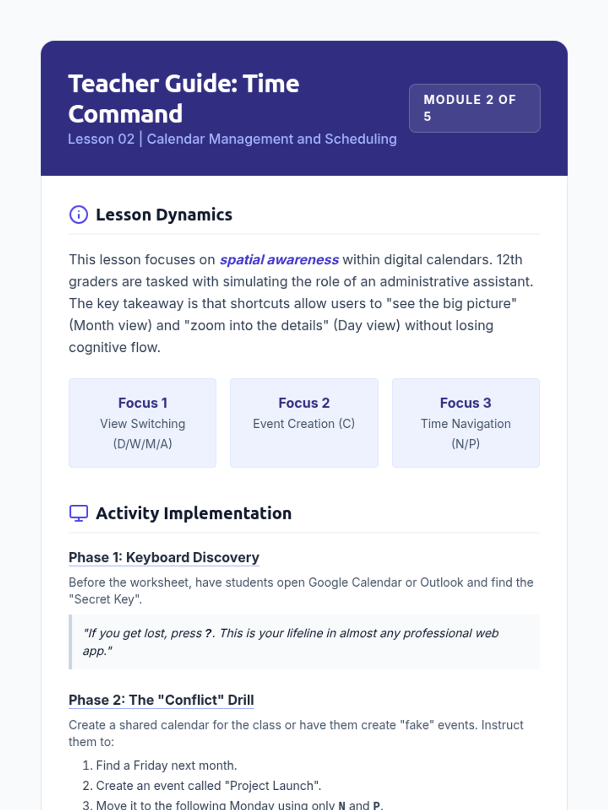 An advanced sequence for 12th-grade students focused on integrating keyboard shortcuts into professional communication and workflow. Students master email, calendar management, and cross-application data transfer using assistive technology and efficiency strategies.