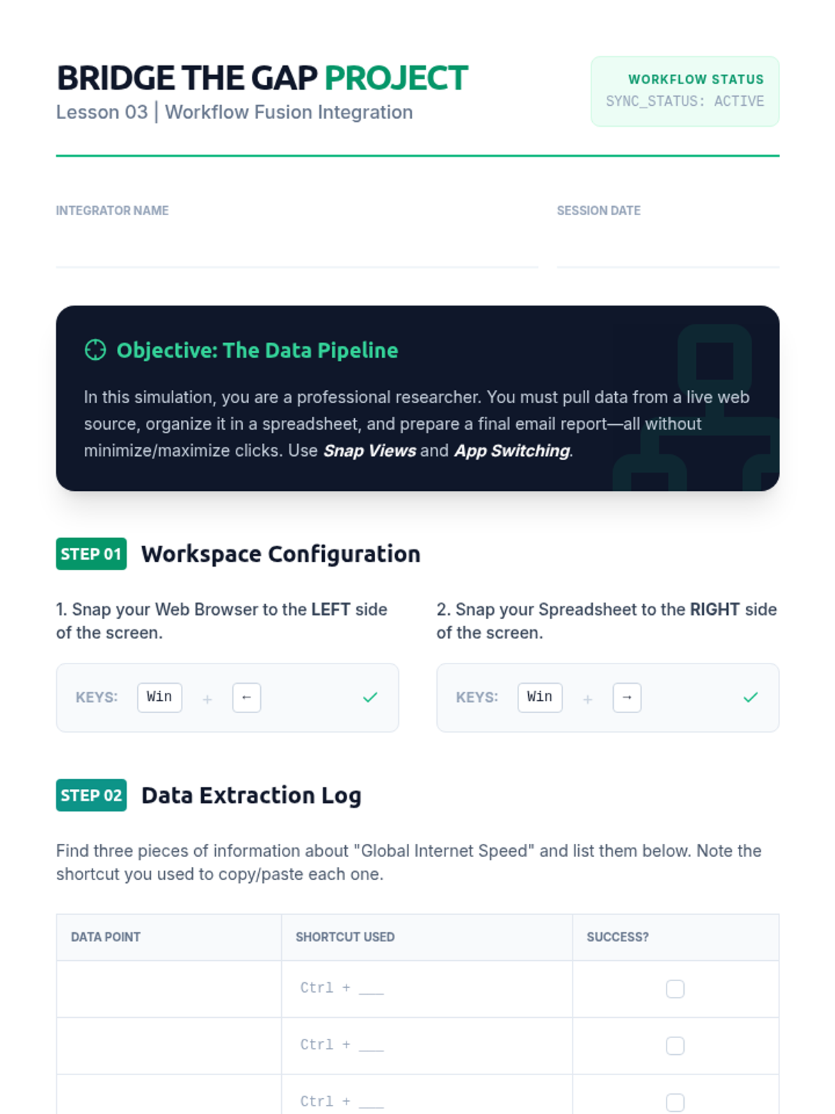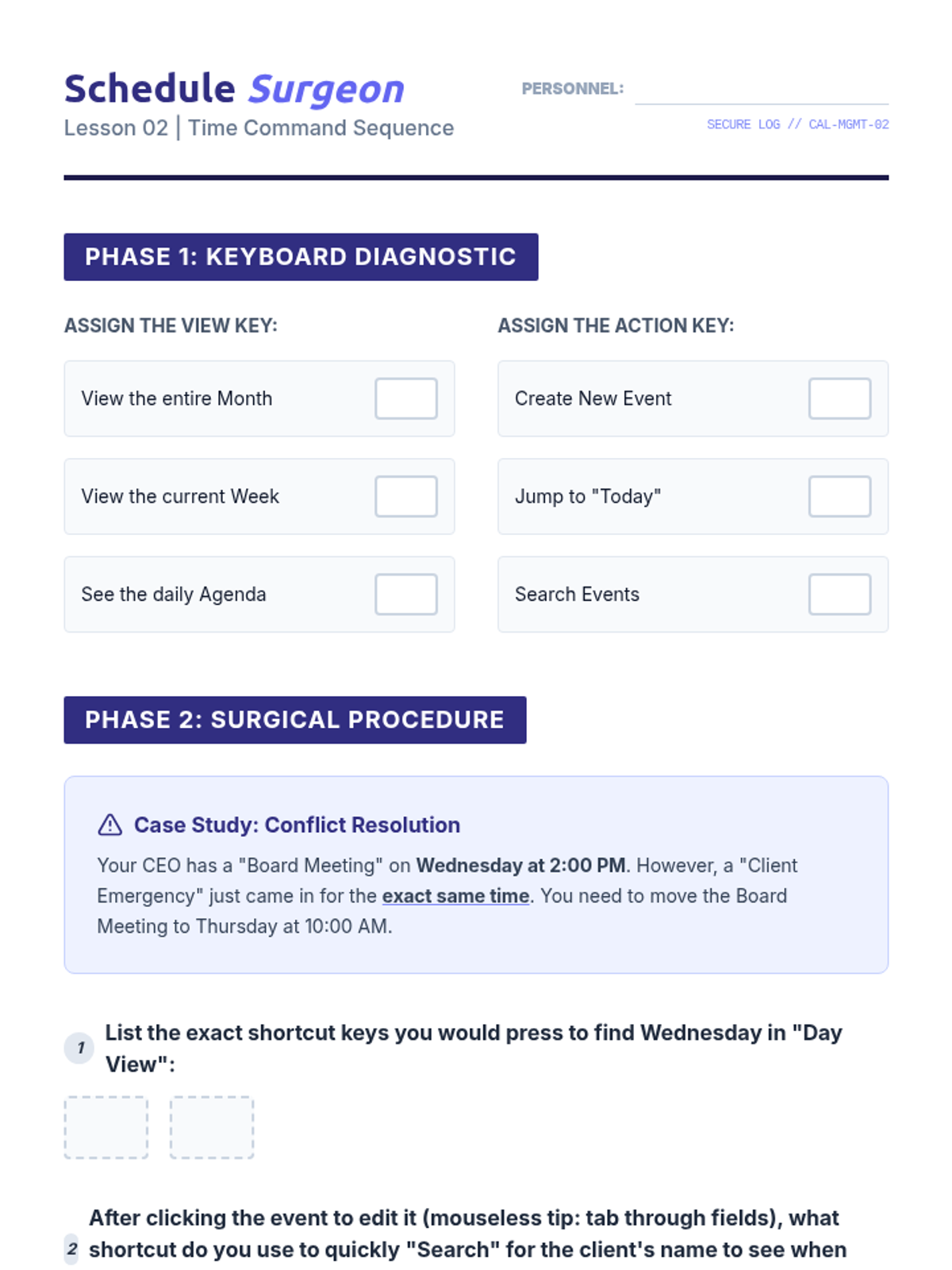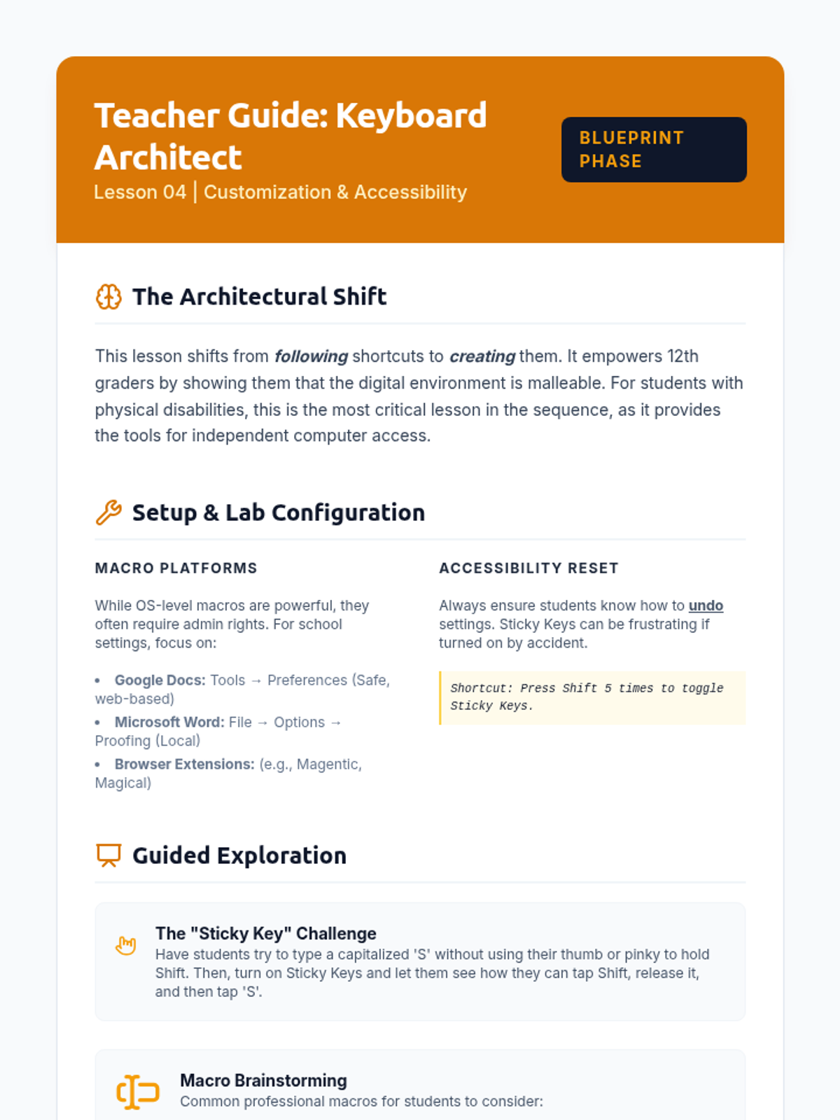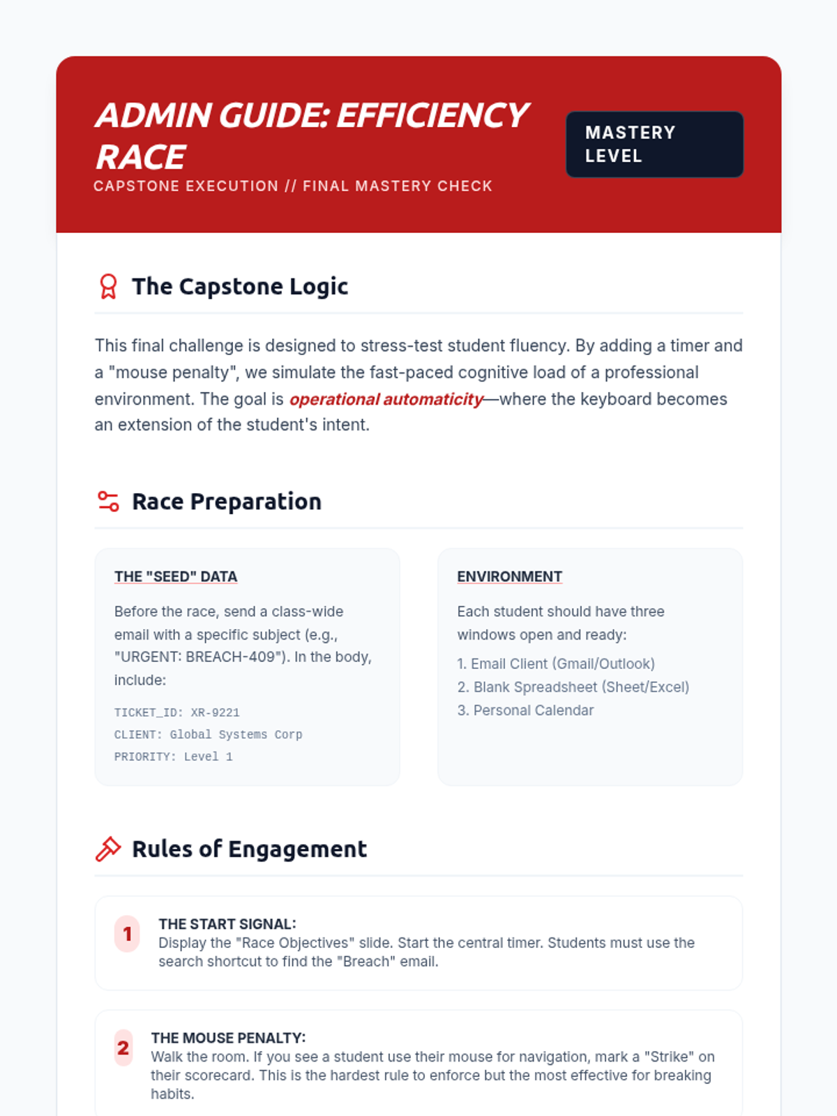 An advanced sequence for 12th-grade students focused on integrating keyboard shortcuts into professional communication and workflow. Students master email, calendar management, and cross-application data transfer using assistive technology and efficiency strategies.