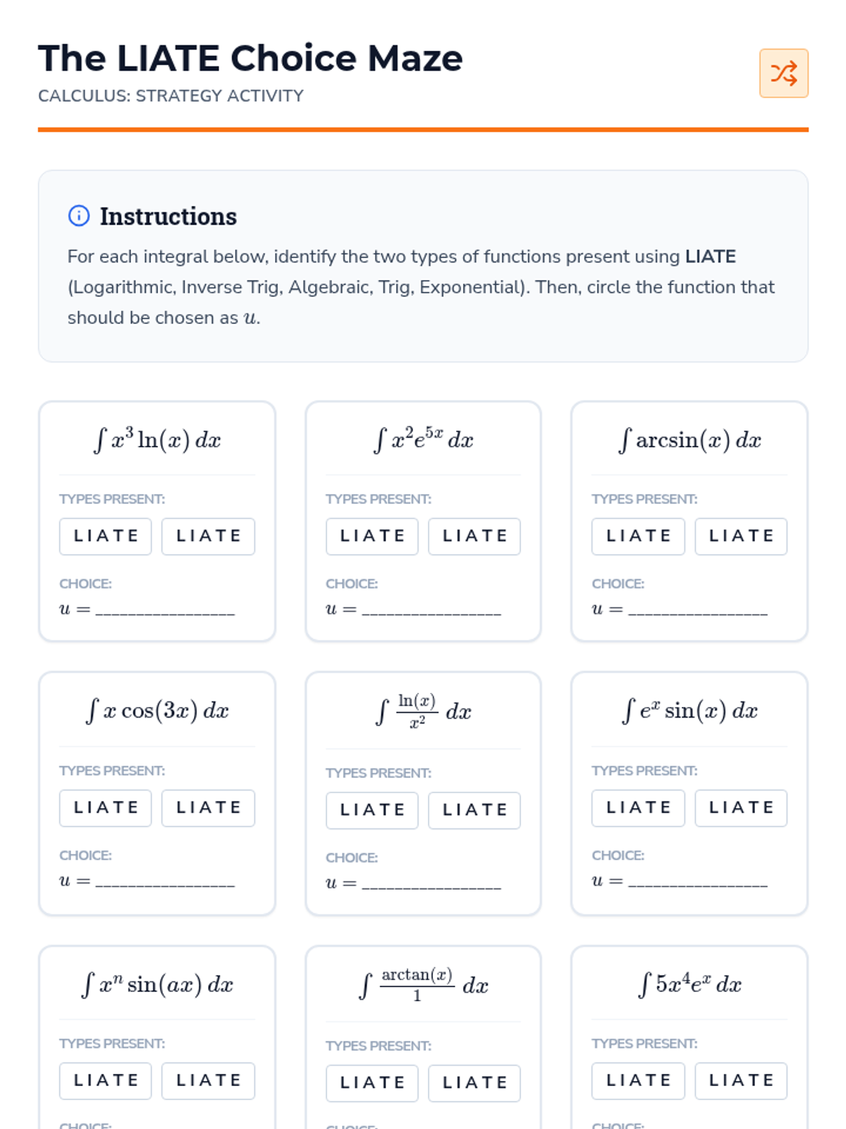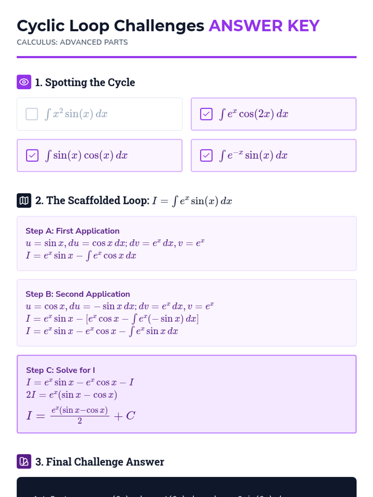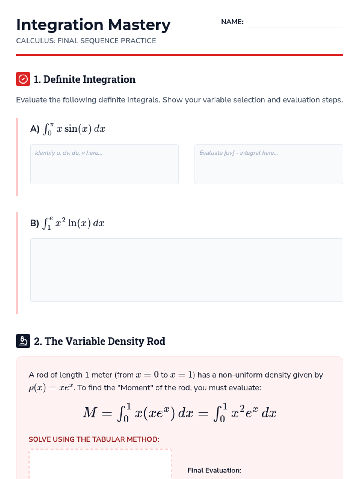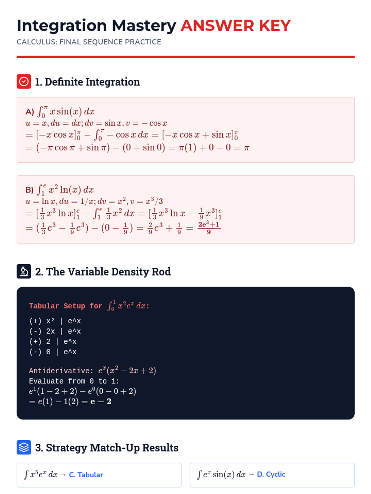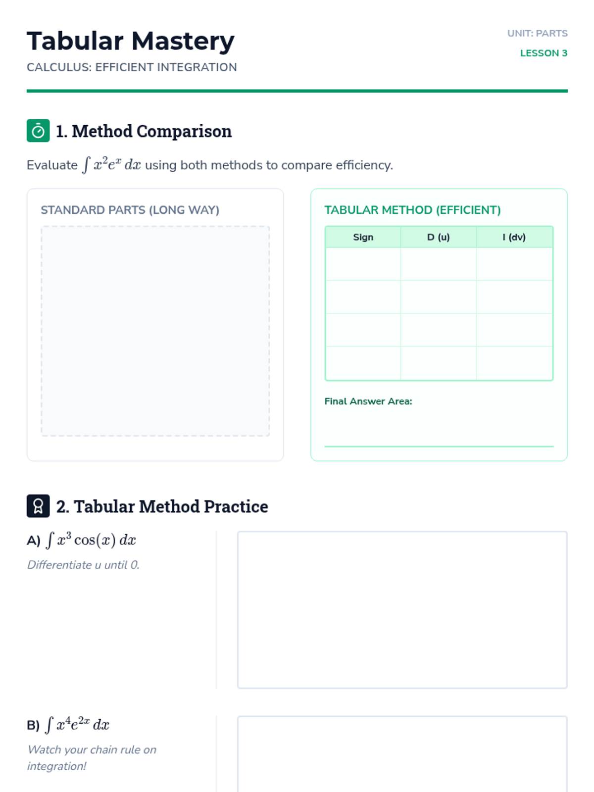 This sequence introduces Integration by Parts as the inverse of the Product Rule, equipping students to handle products of unrelated functions. Through inquiry, students derive the formula, apply the LIATE heuristic, master the Tabular Method for repeated integration, and solve cyclic integrals.