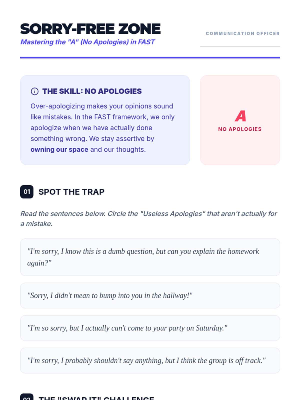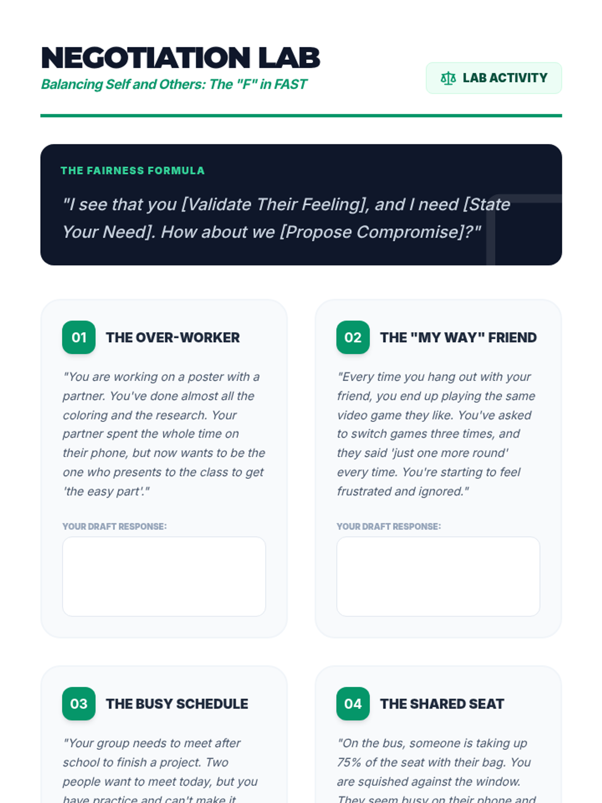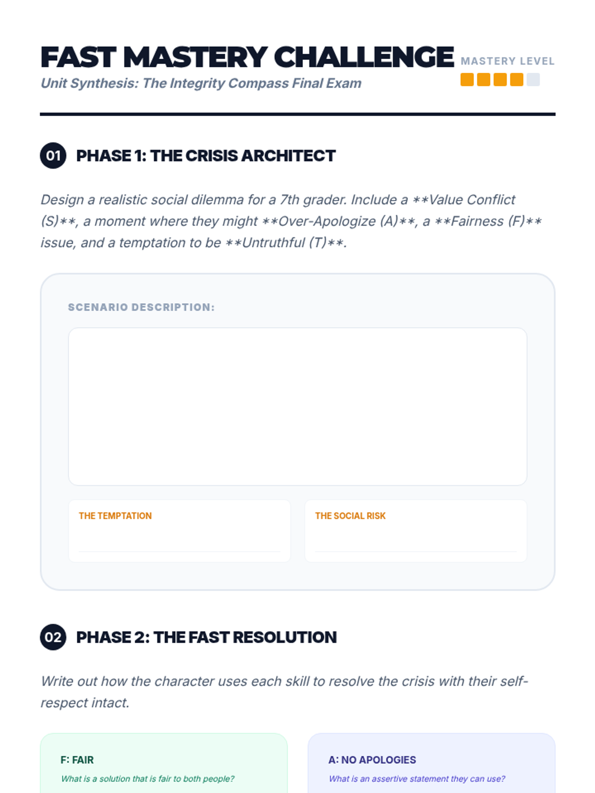 A counseling and life skills sequence for 7th graders focusing on the FAST acronym (Fair, No Apologies, Stick to Values, Truthful) to build self-respect and navigate social dilemmas with integrity.