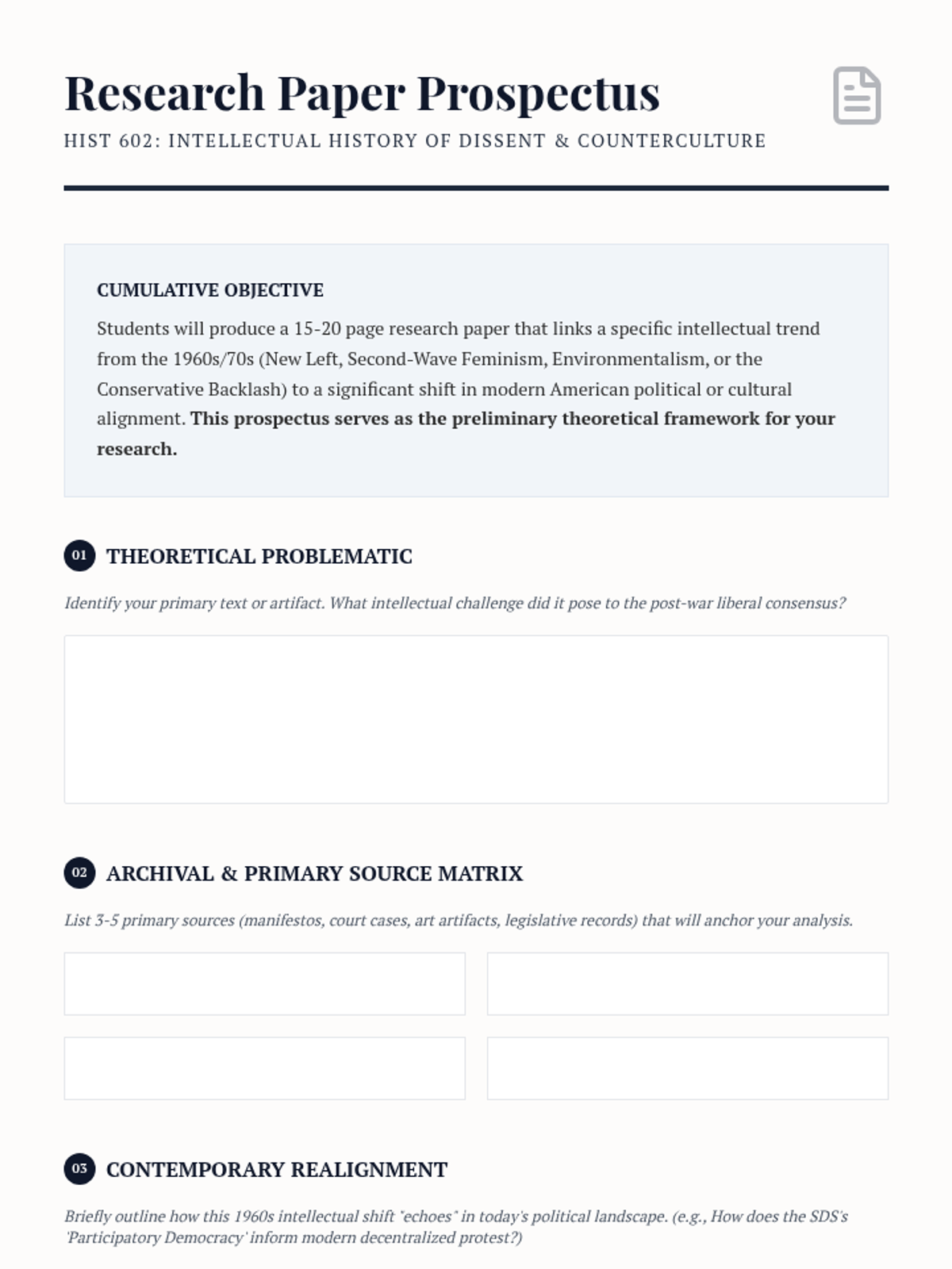 A graduate-level exploration of the theoretical and intellectual foundations of 1960s and 70s dissent, focusing on the New Left, feminism, environmentalism, and the subsequent conservative reaction. Students analyze foundational texts and cultural artifacts to understand the redefinition of American identity and modern political alignments.