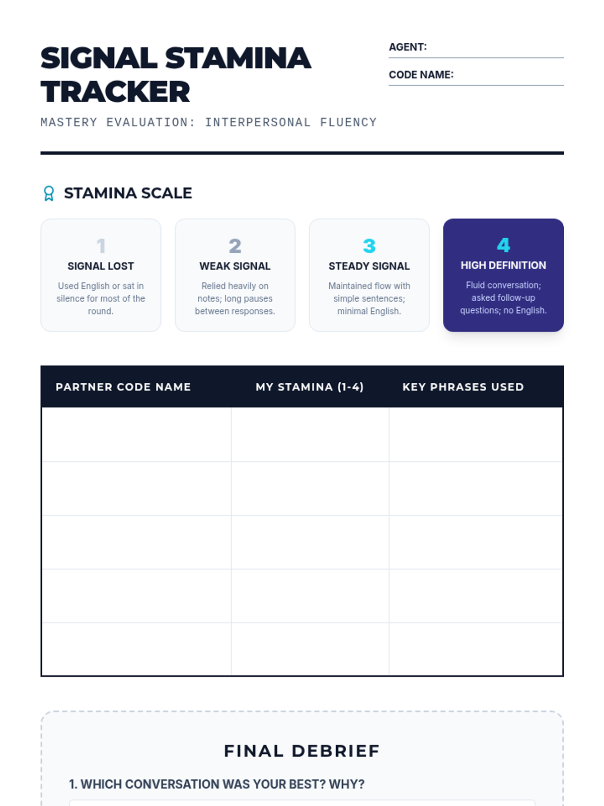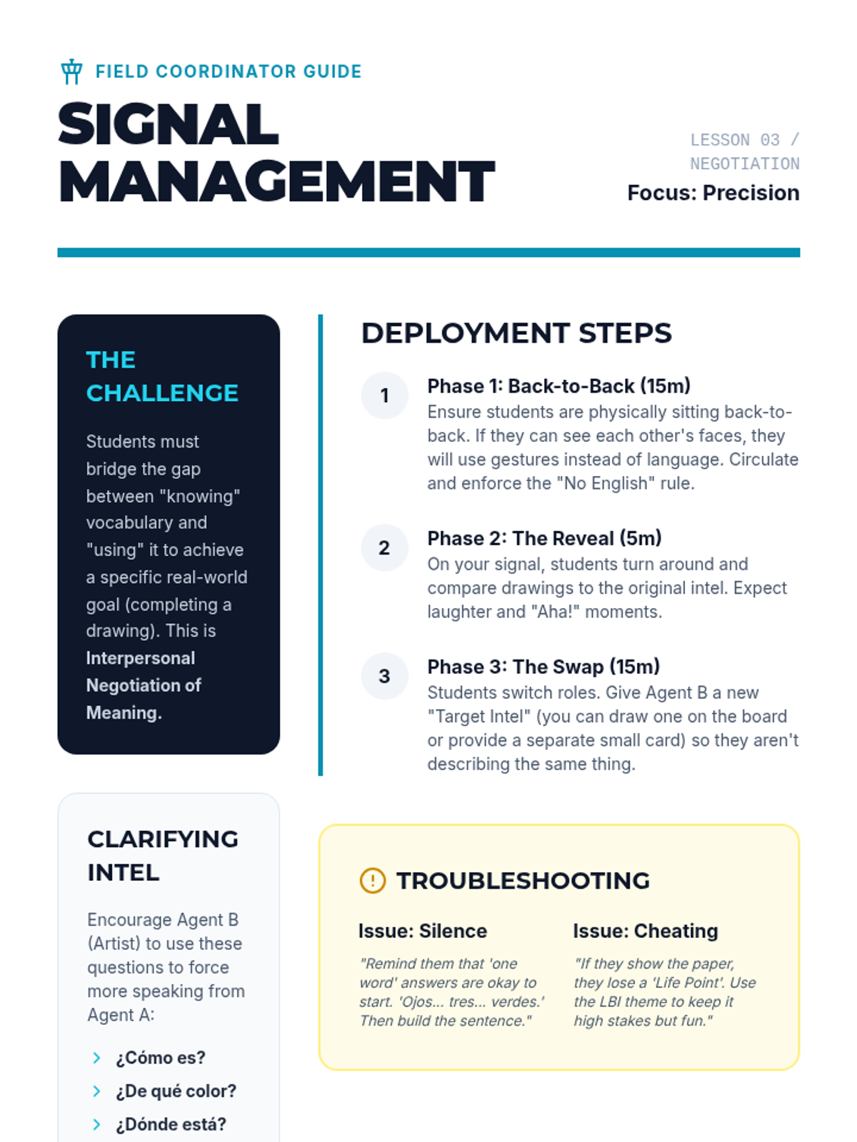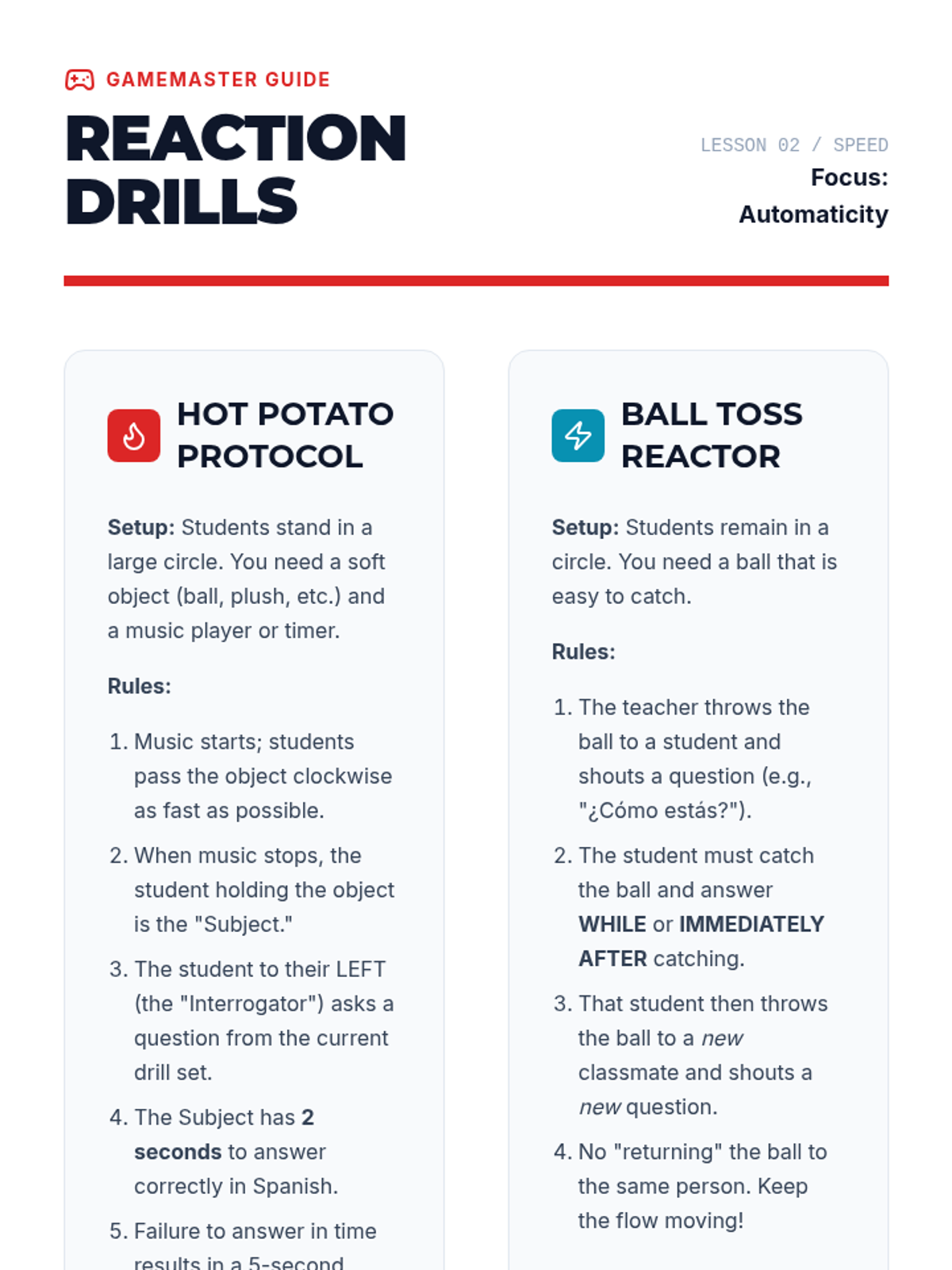 A gamified introductory Spanish sequence for 8th graders focusing on conversational automaticity and rapid response. Students progress from identifying patterns to maintaining unscripted conversations through high-repetition games and interactive challenges.