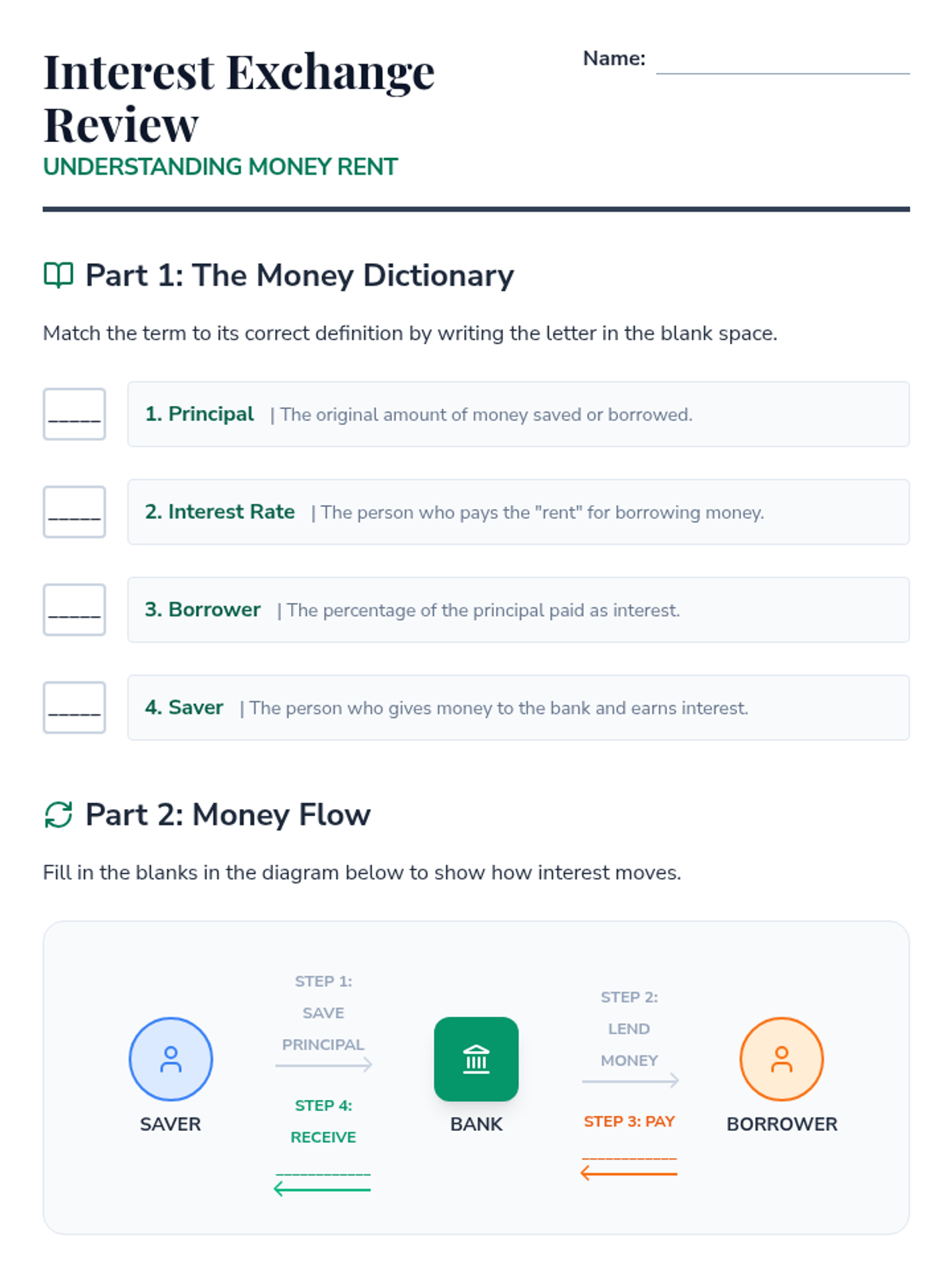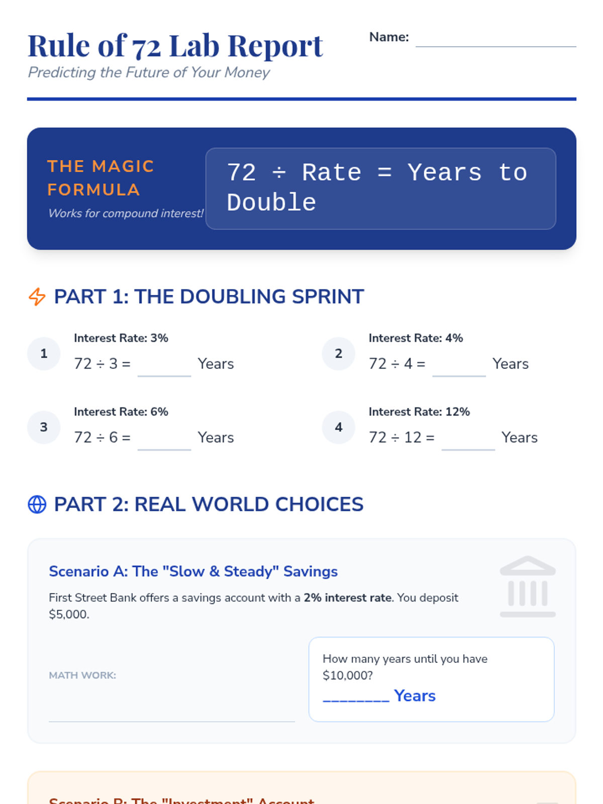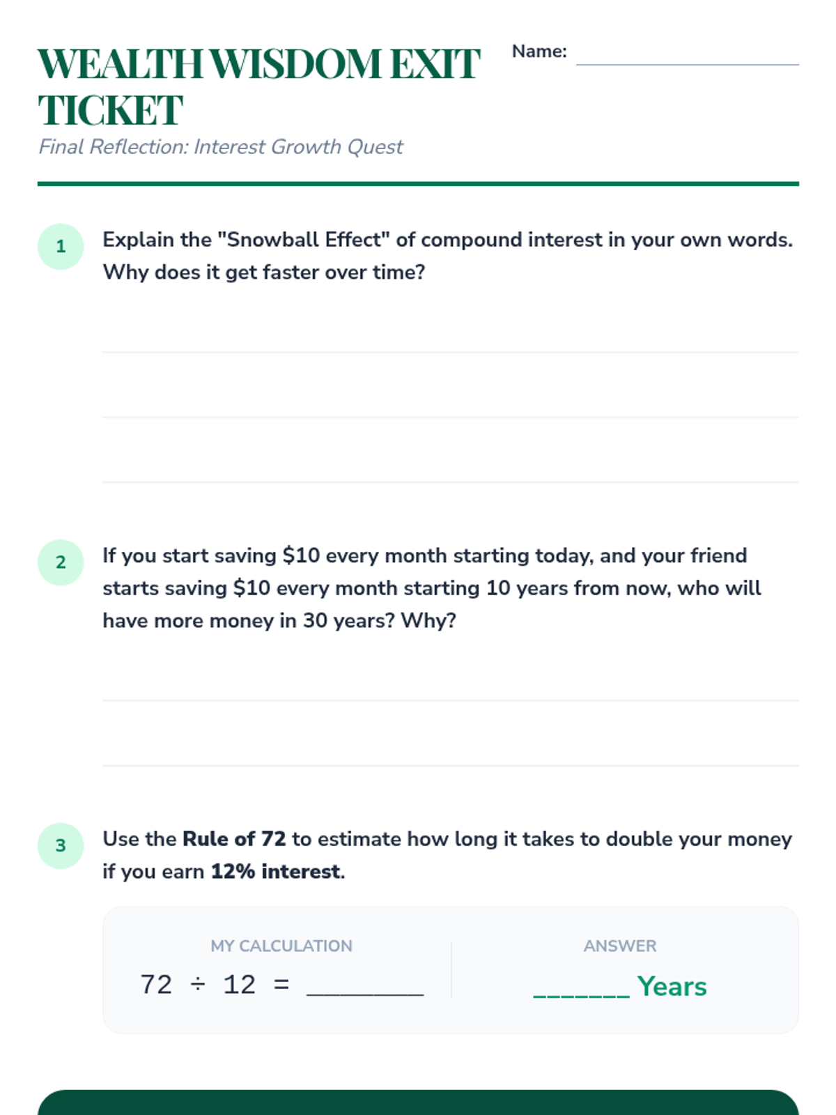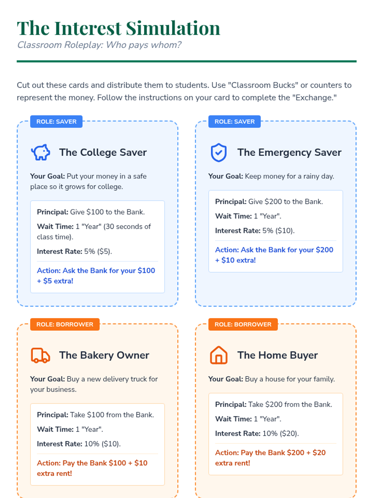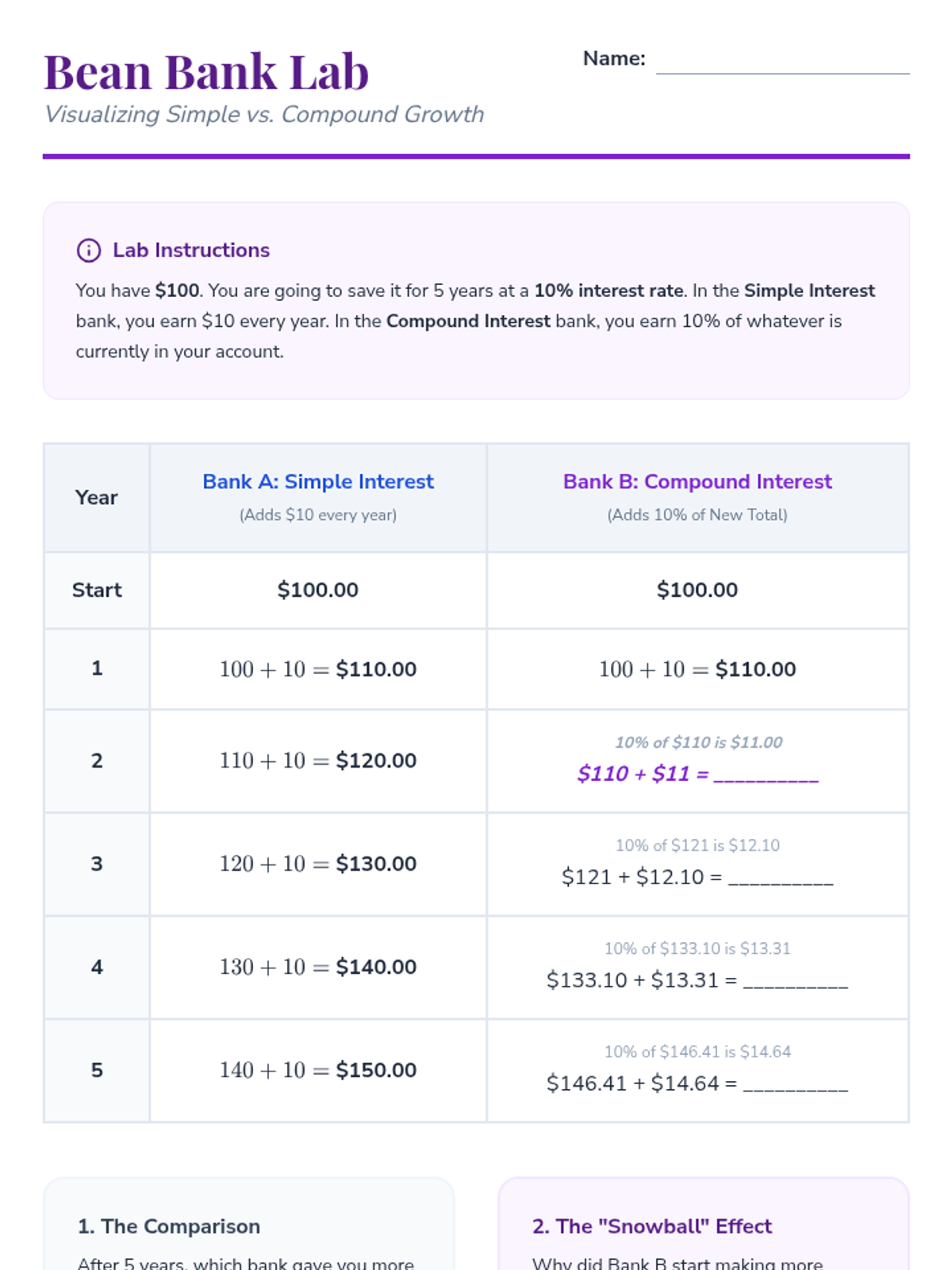 A 5th-grade financial literacy sequence that teaches students the power of saving, the mechanics of interest, and the exponential growth of compound interest through hands-on simulations and mathematical reasoning.