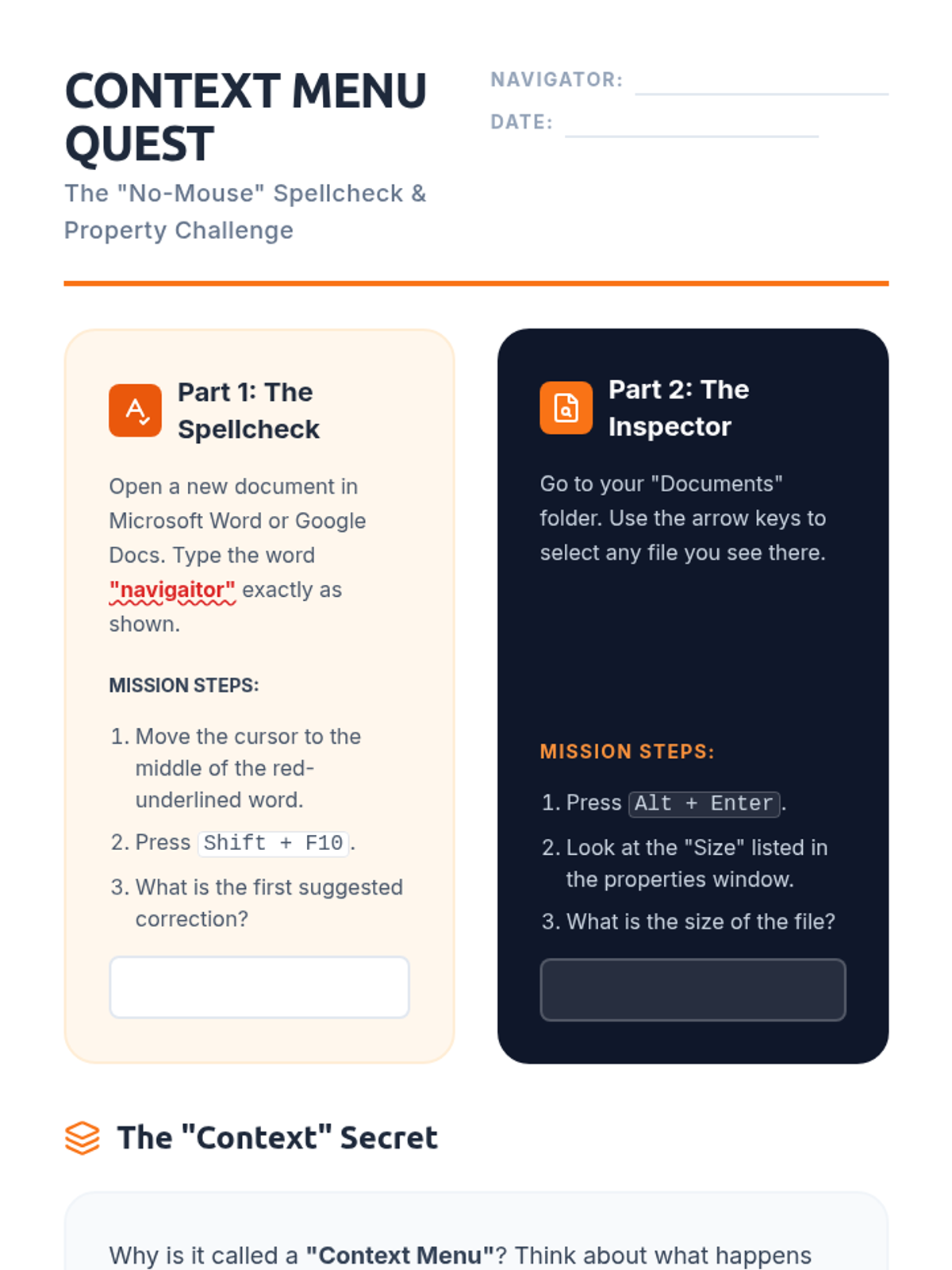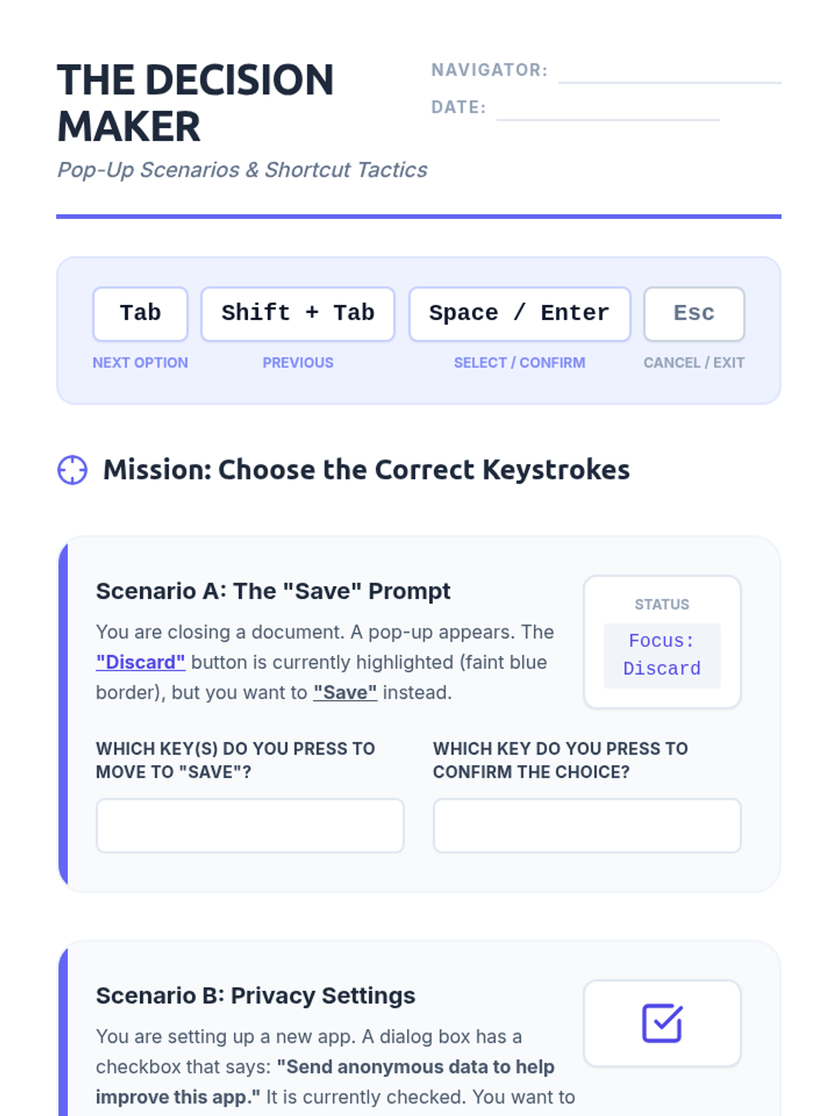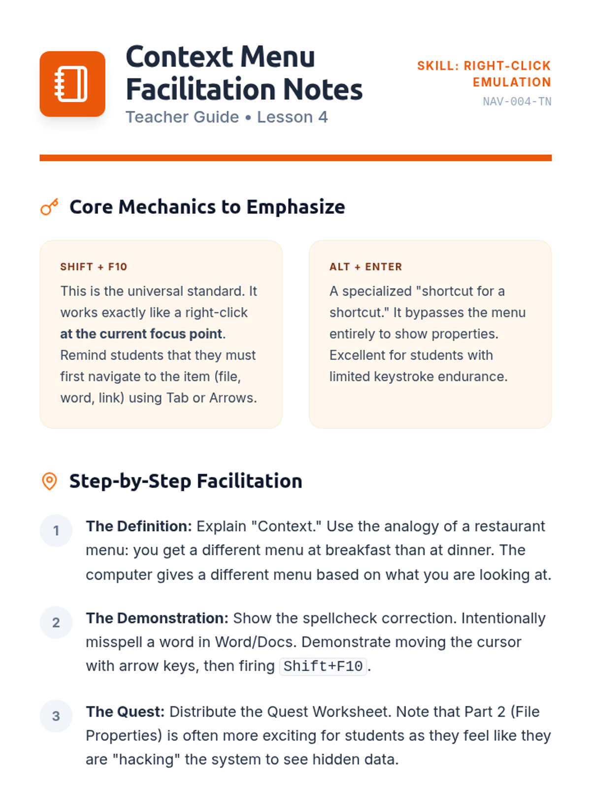A comprehensive sequence for 6th-grade students focusing on keyboard navigation of digital interfaces, including menus, dialog boxes, and forms, specifically designed for assistive technology awareness and skill-building.
