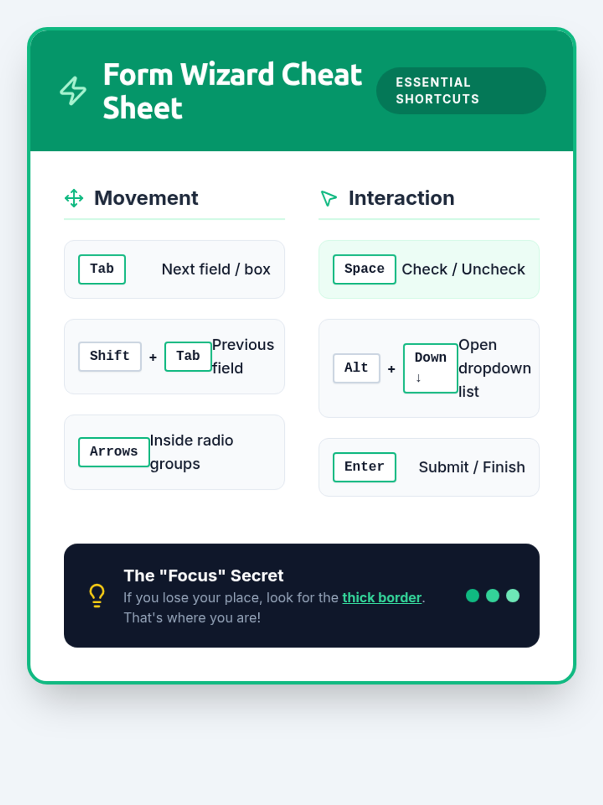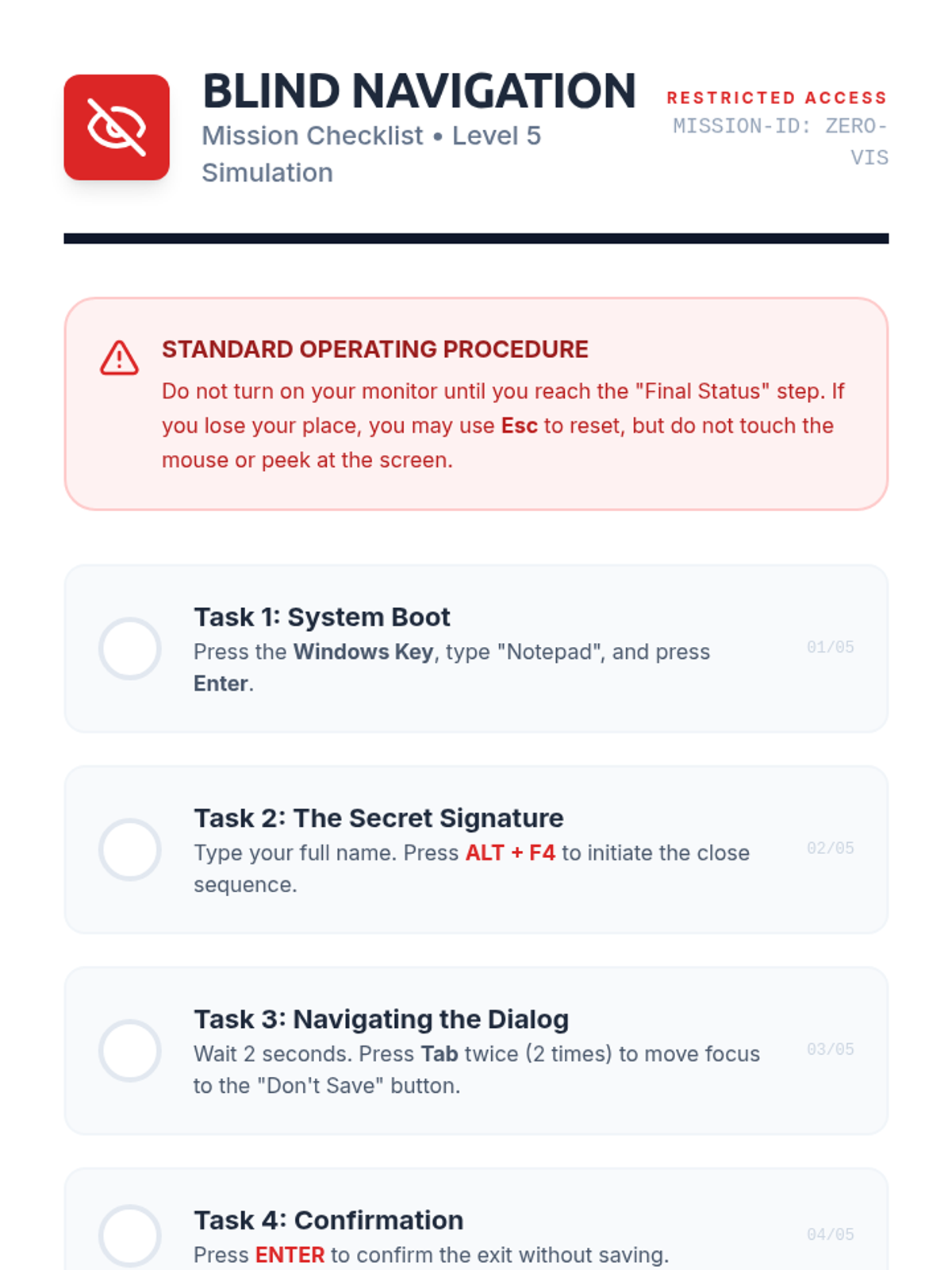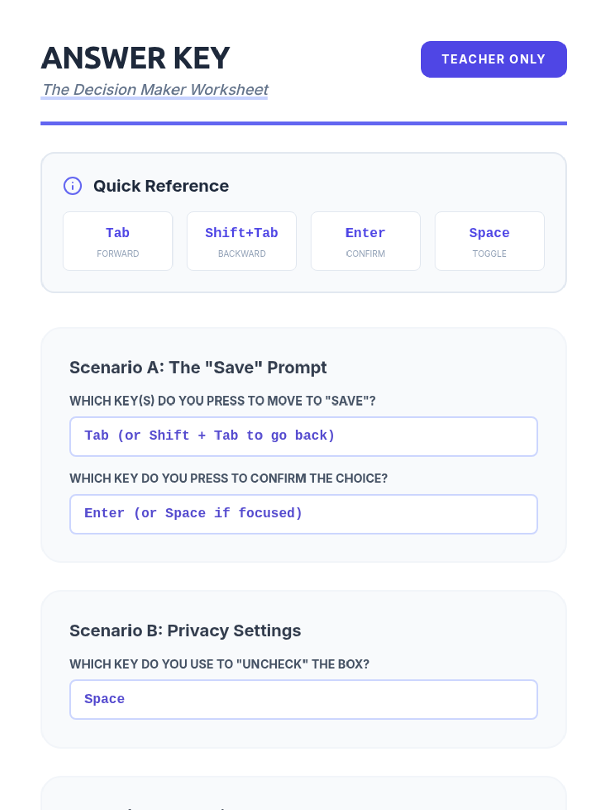 A comprehensive sequence for 6th-grade students focusing on keyboard navigation of digital interfaces, including menus, dialog boxes, and forms, specifically designed for assistive technology awareness and skill-building.