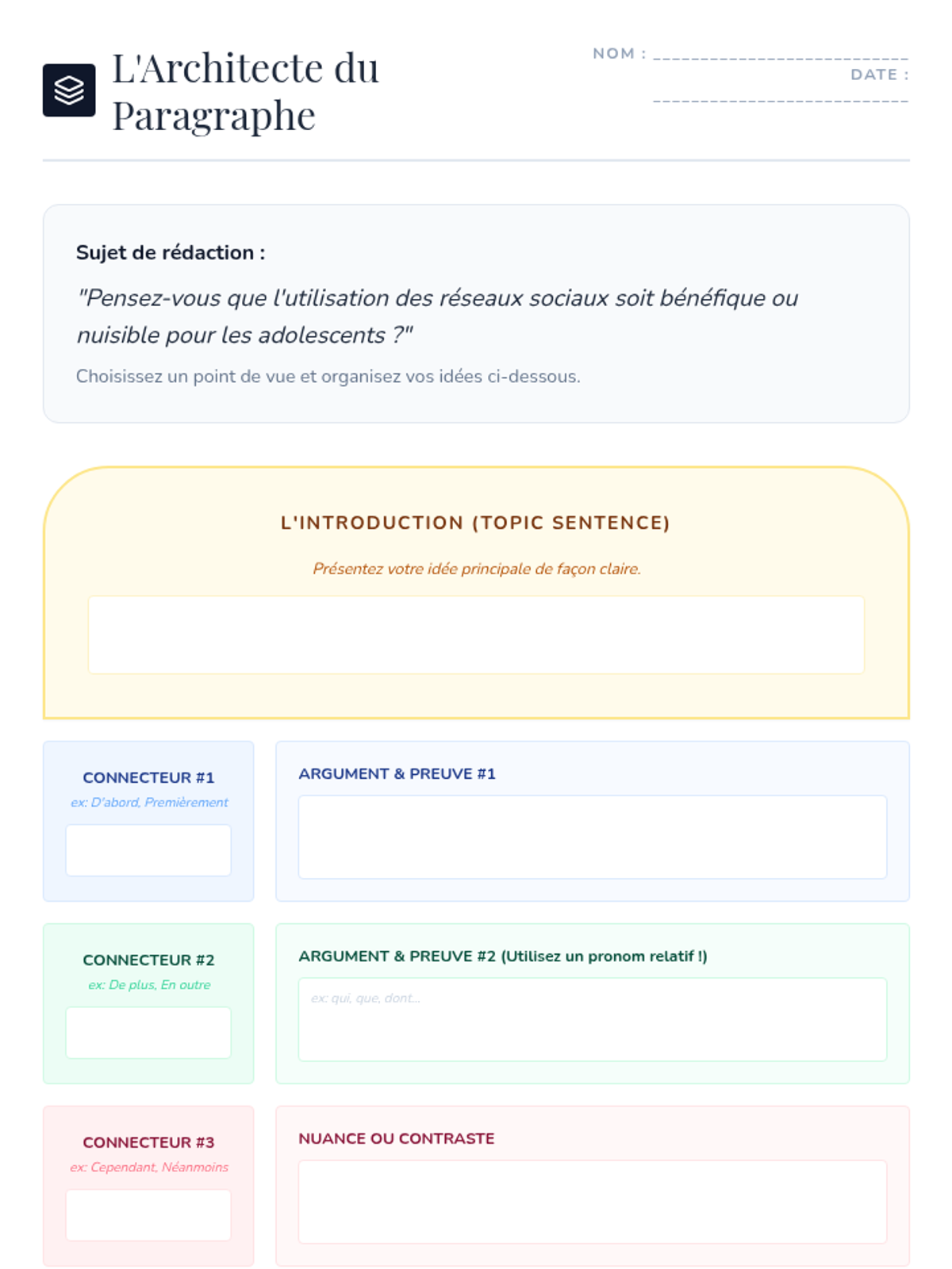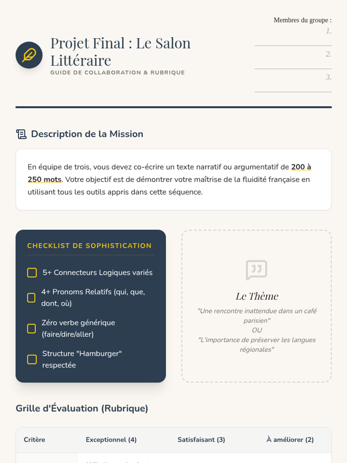 A 10th Grade Intermediate French sequence focusing on improving writing fluency and sophistication through advanced logical connectors, precise synonyms, relative pronouns, and paragraph structure. Students move from 'choppy' basic sentences to cohesive, elegant French prose.