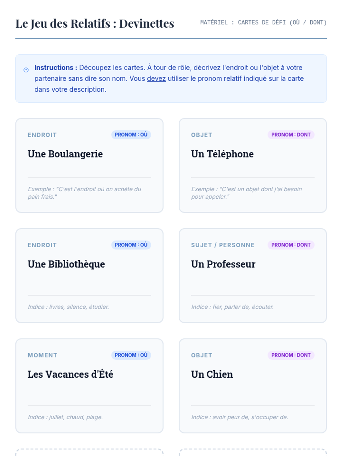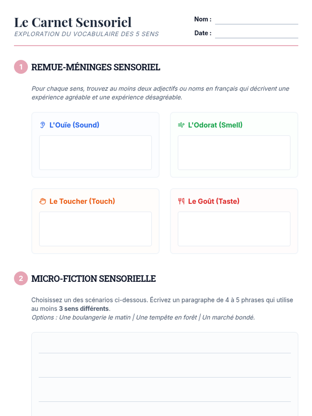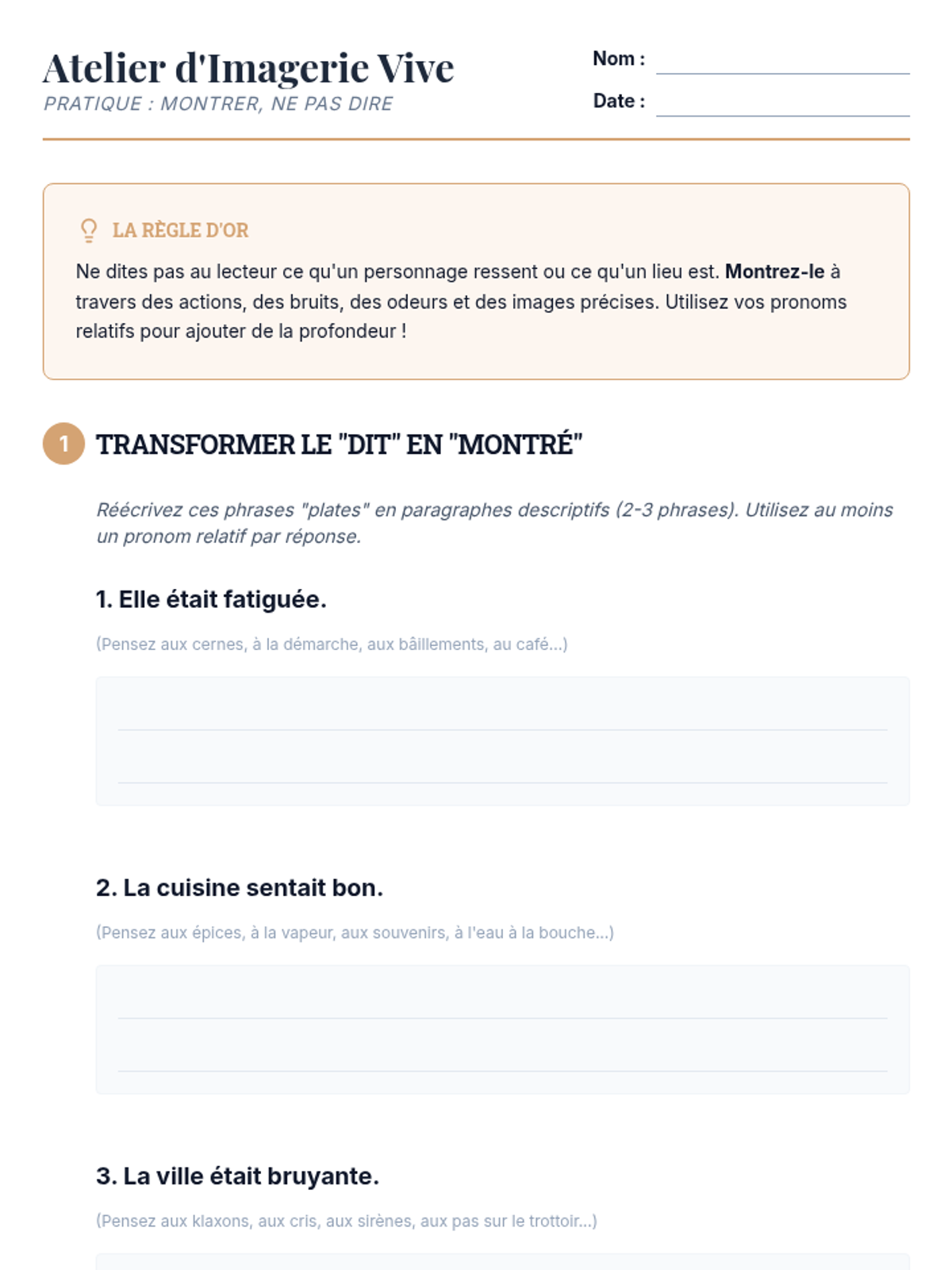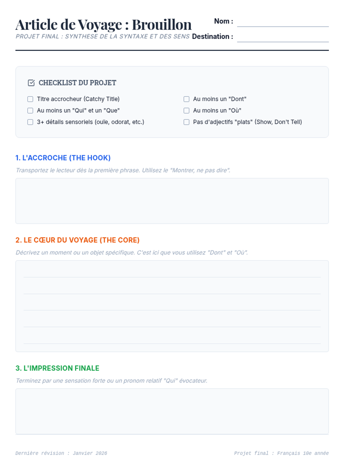 A comprehensive French writing sequence for 10th graders focusing on complex syntax (relative pronouns) and vivid descriptive techniques to move beyond basic sentence structures.