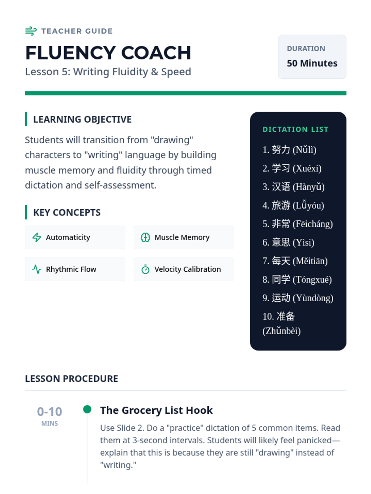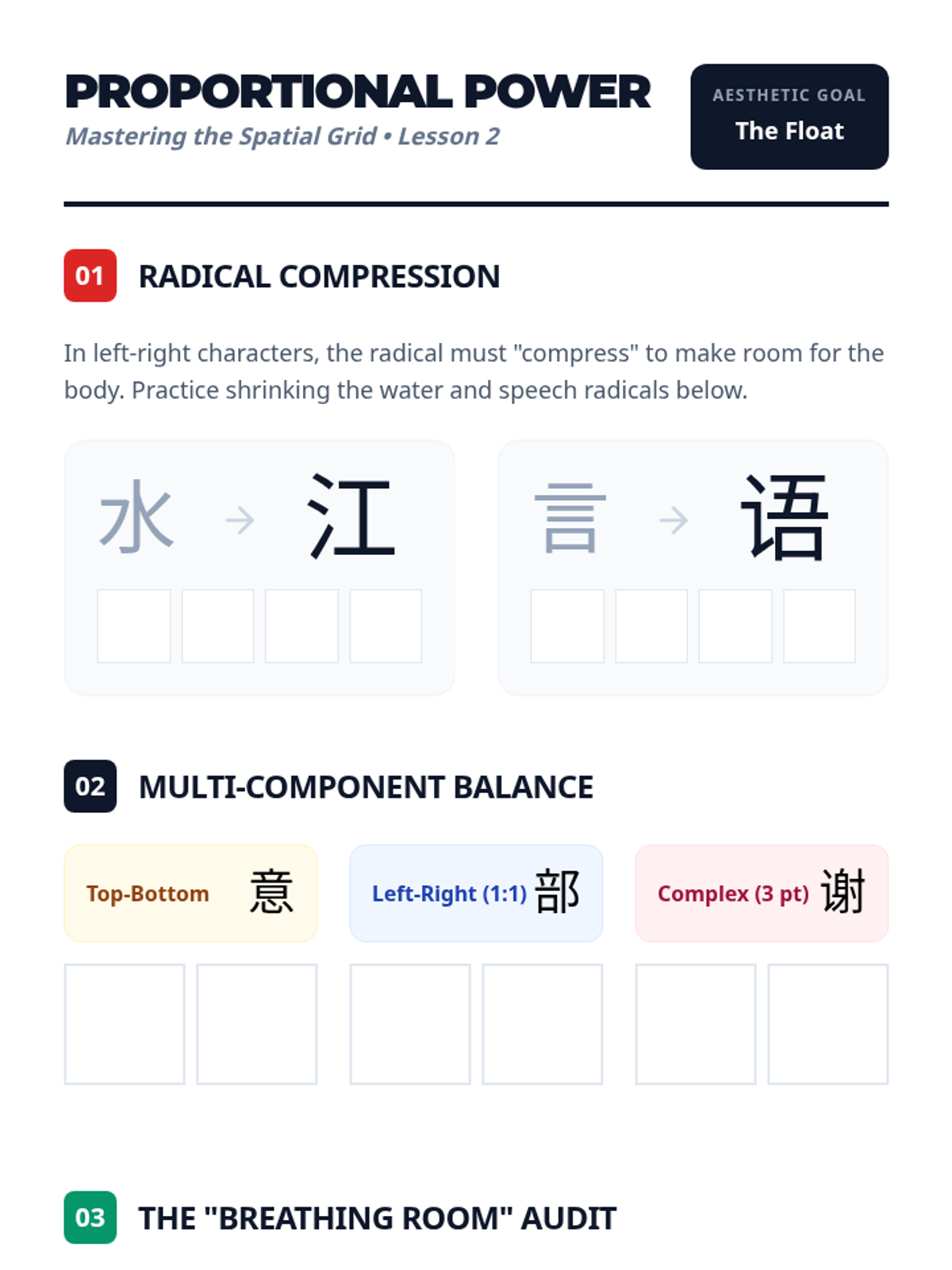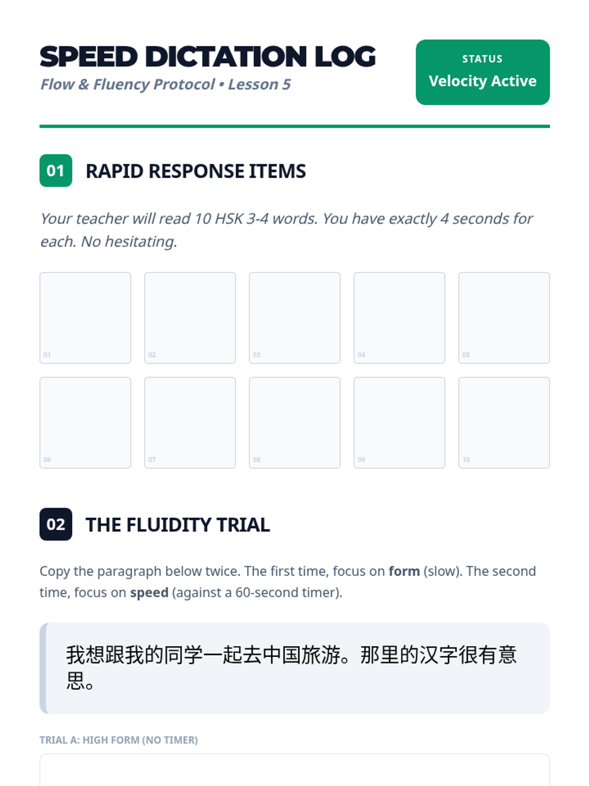 This workshop-style sequence focuses on the physical mechanics and aesthetics of writing intermediate Mandarin characters. Students move from basic stroke order rules to mastering complex HSK 3-4 character structures, digital handwriting recognition, and writing fluidity.