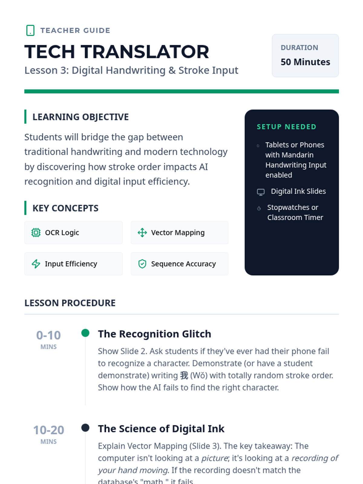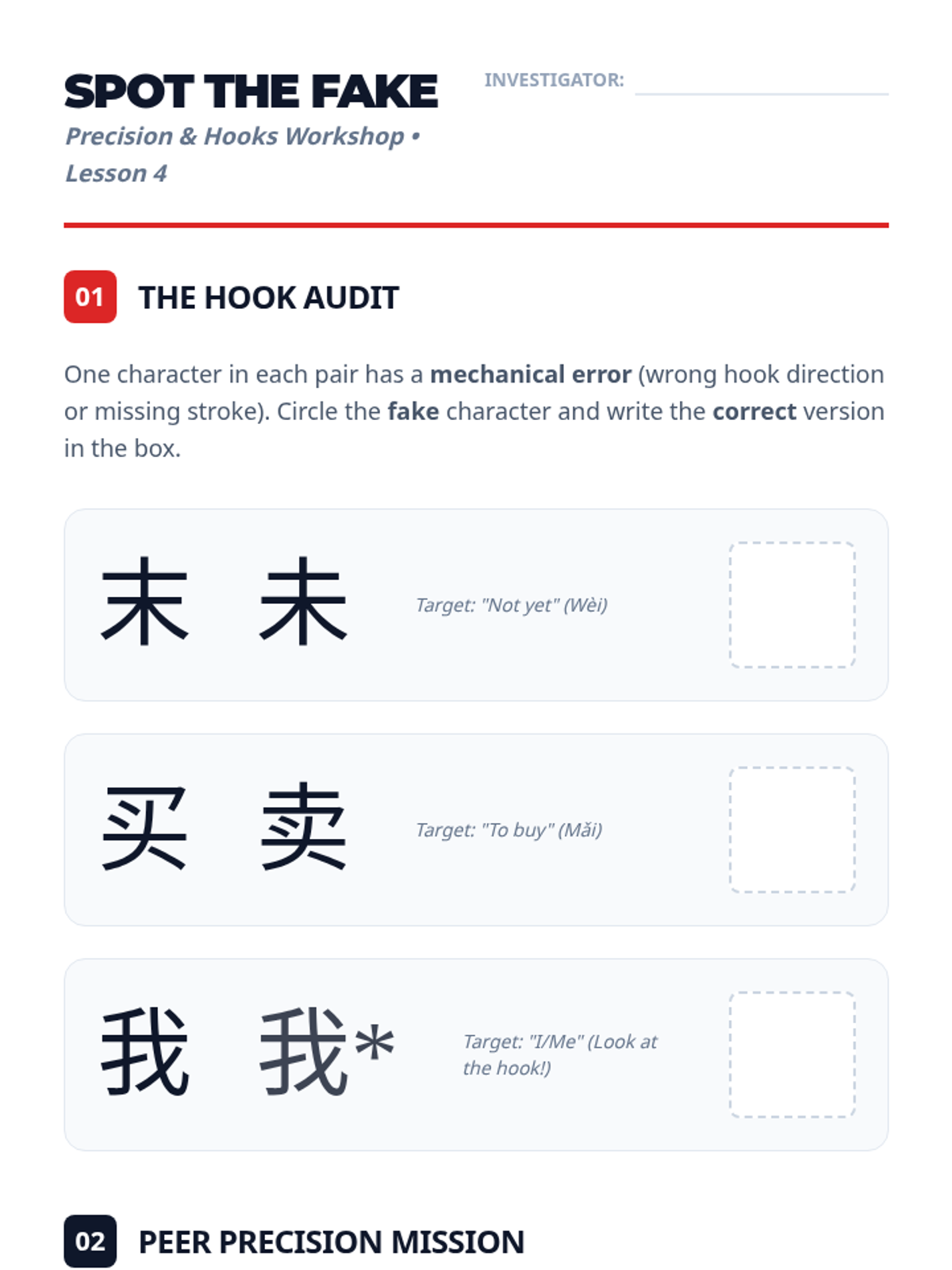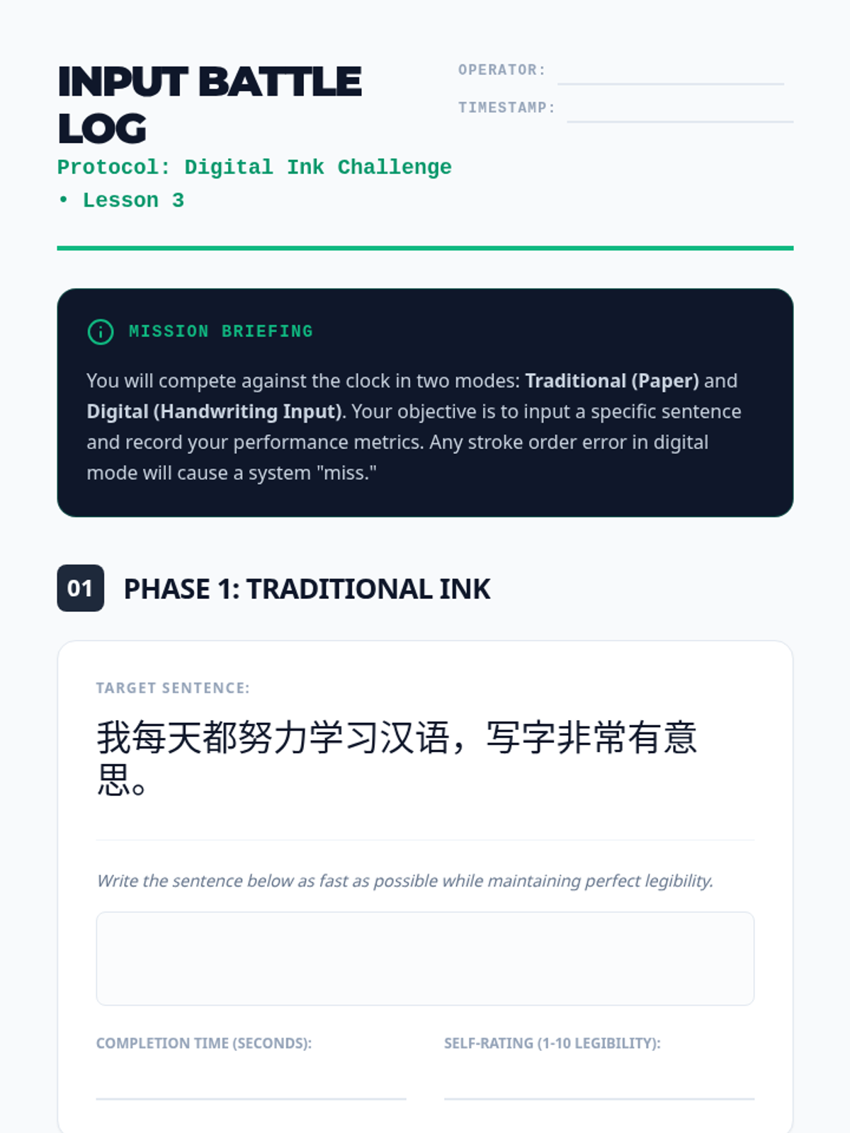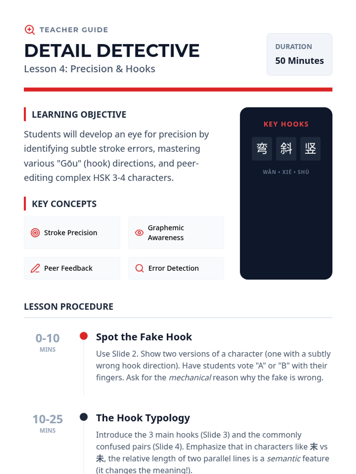 This workshop-style sequence focuses on the physical mechanics and aesthetics of writing intermediate Mandarin characters. Students move from basic stroke order rules to mastering complex HSK 3-4 character structures, digital handwriting recognition, and writing fluidity.