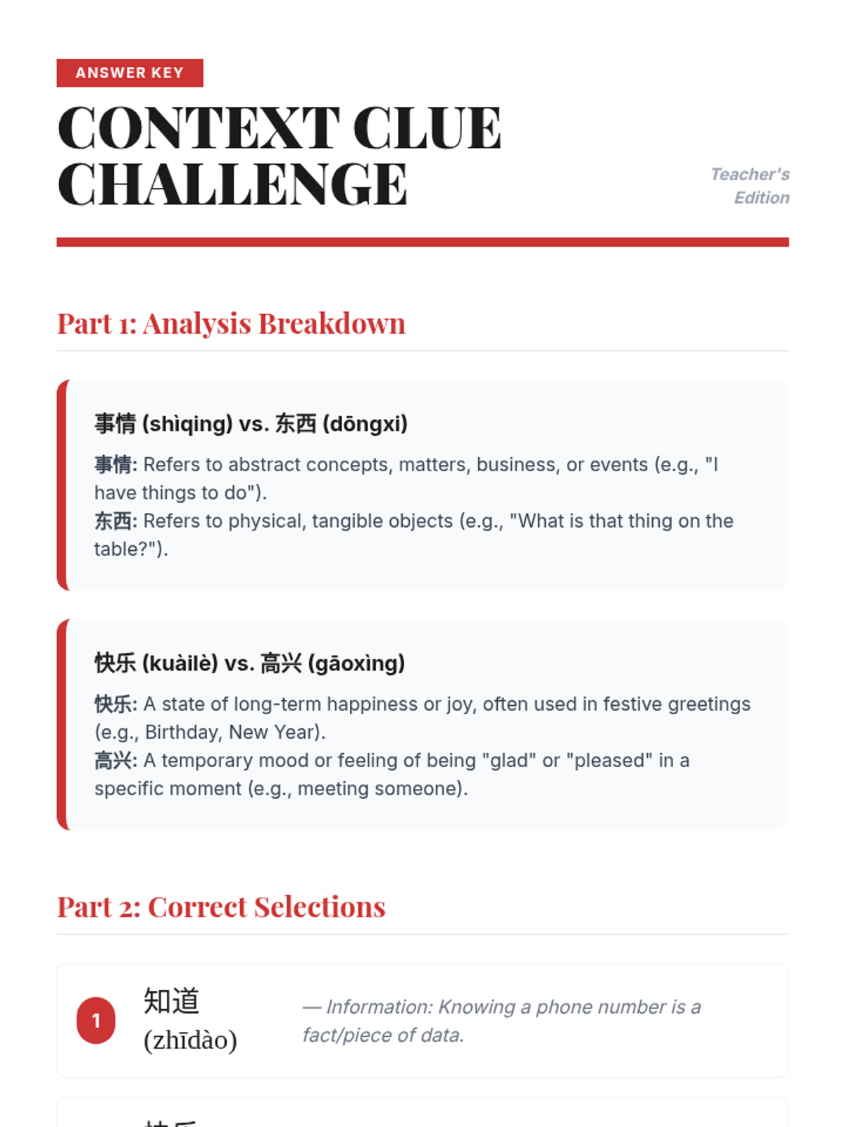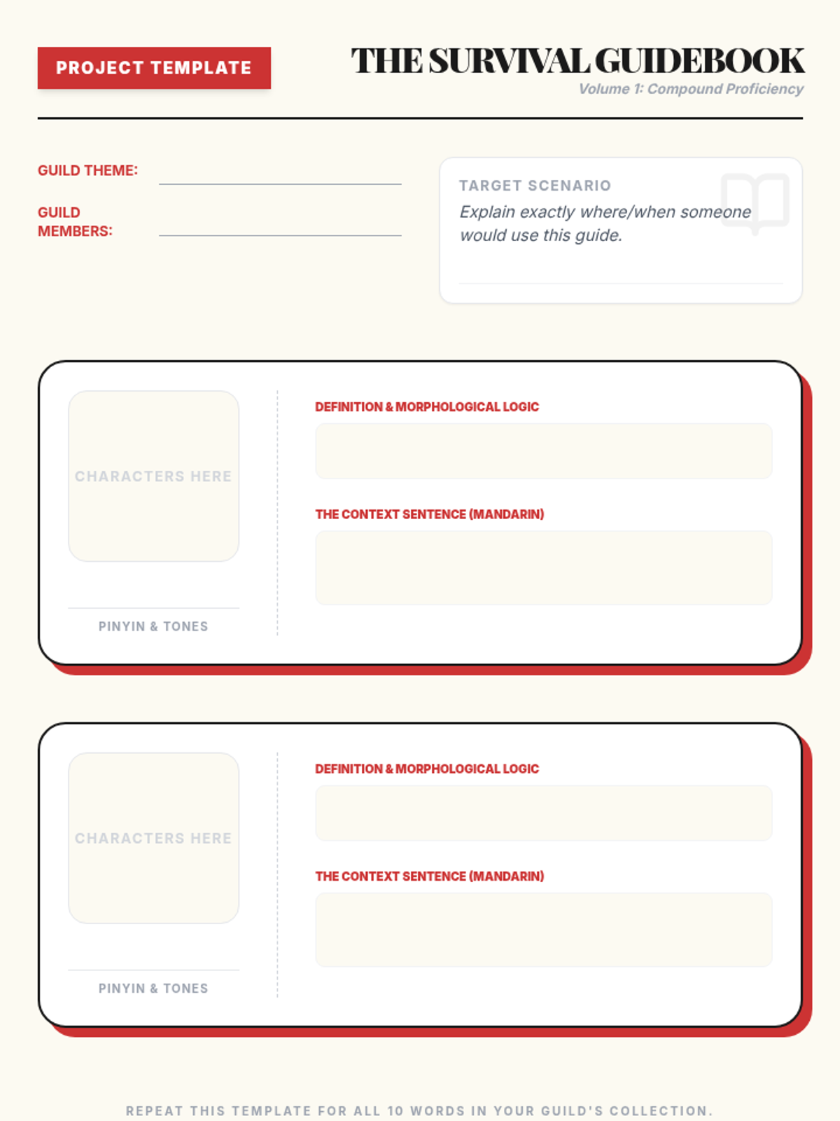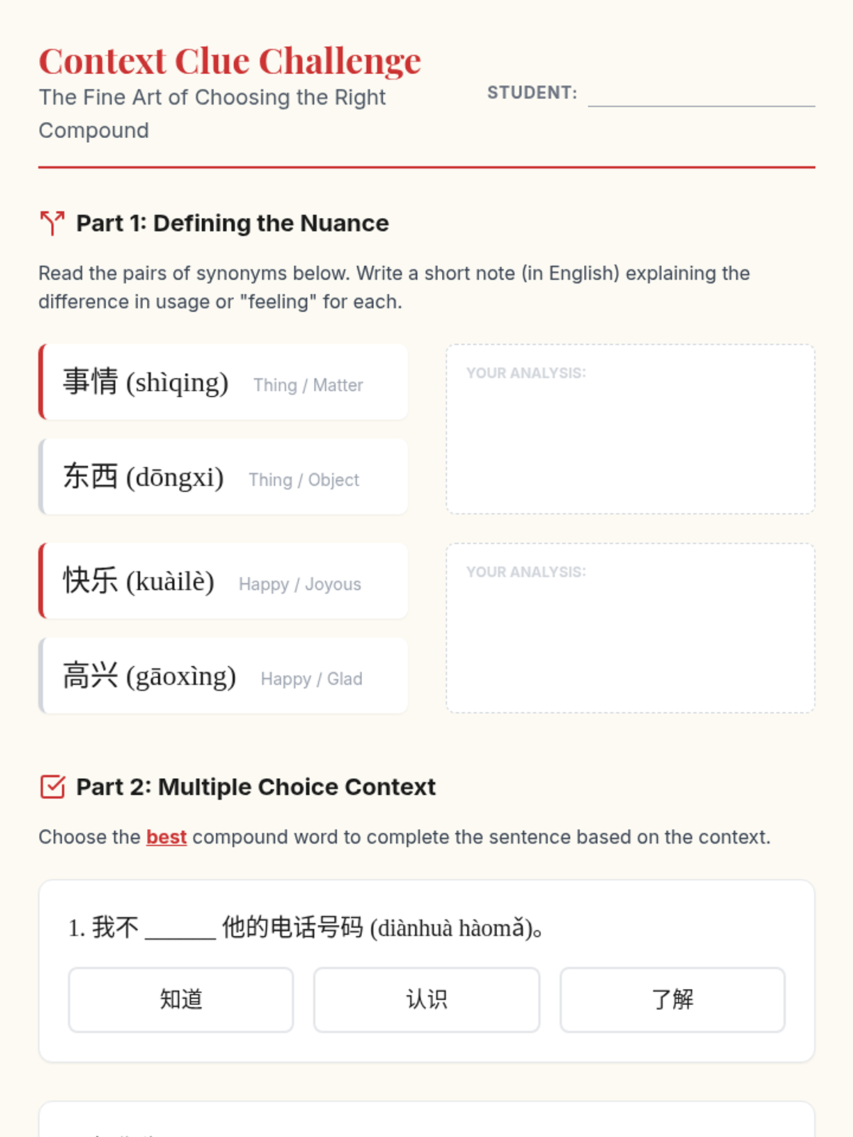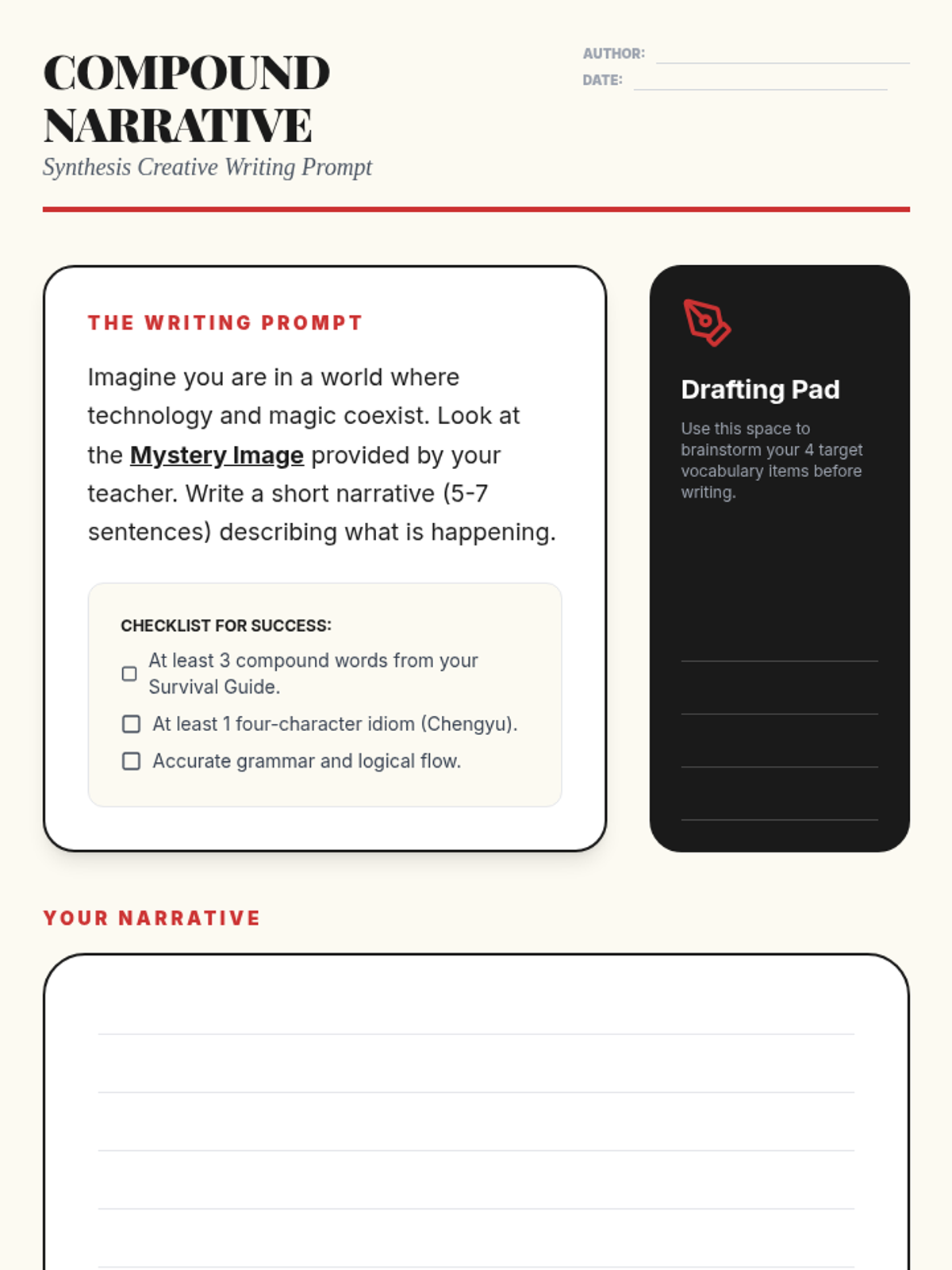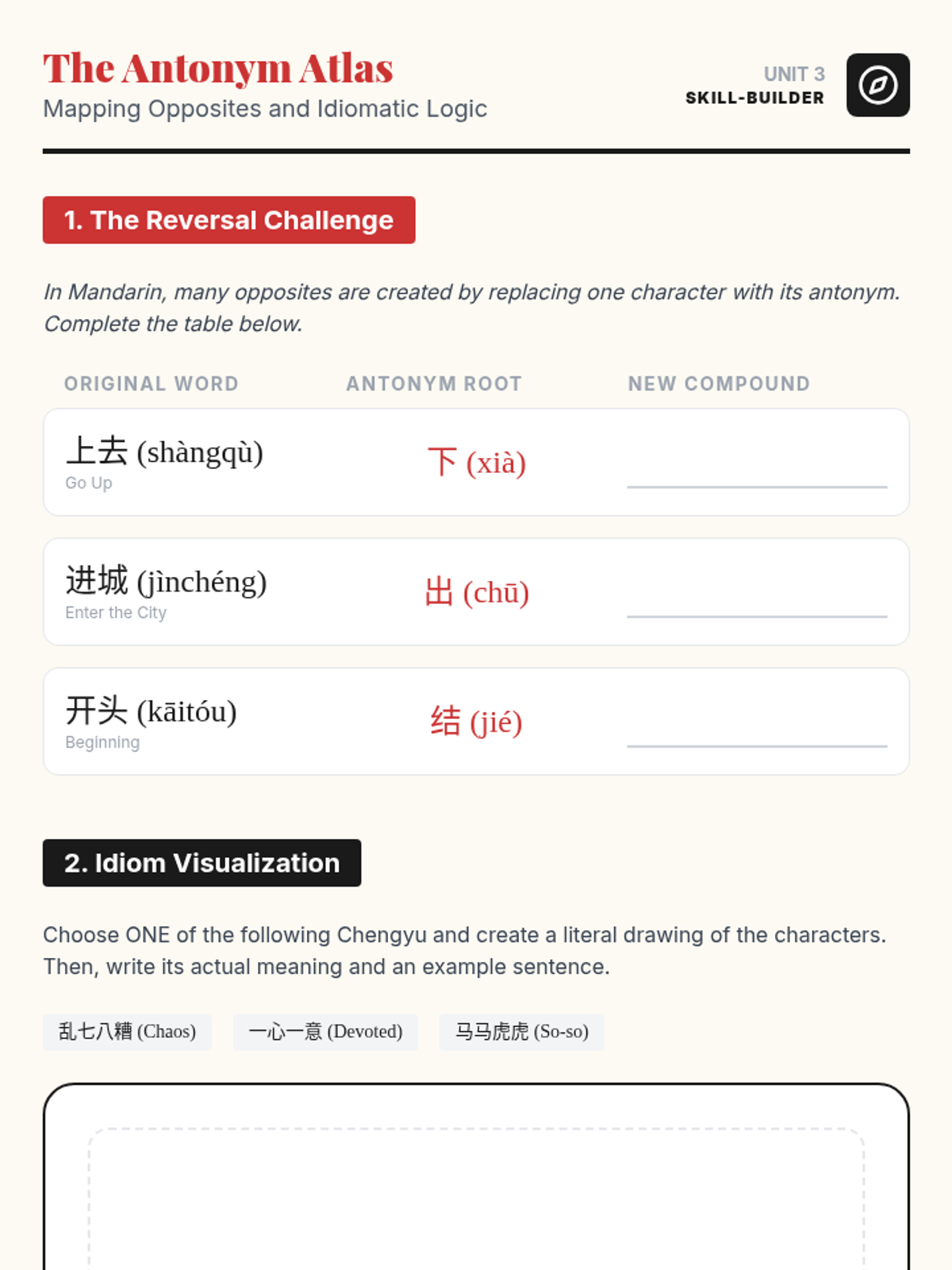 A project-based sequence for 8th-grade Mandarin students focusing on the morphology of compound words (cíyǔ) and their contextual usage. Students explore root characters, differentiate synonyms, learn idioms, and create a thematic glossary.