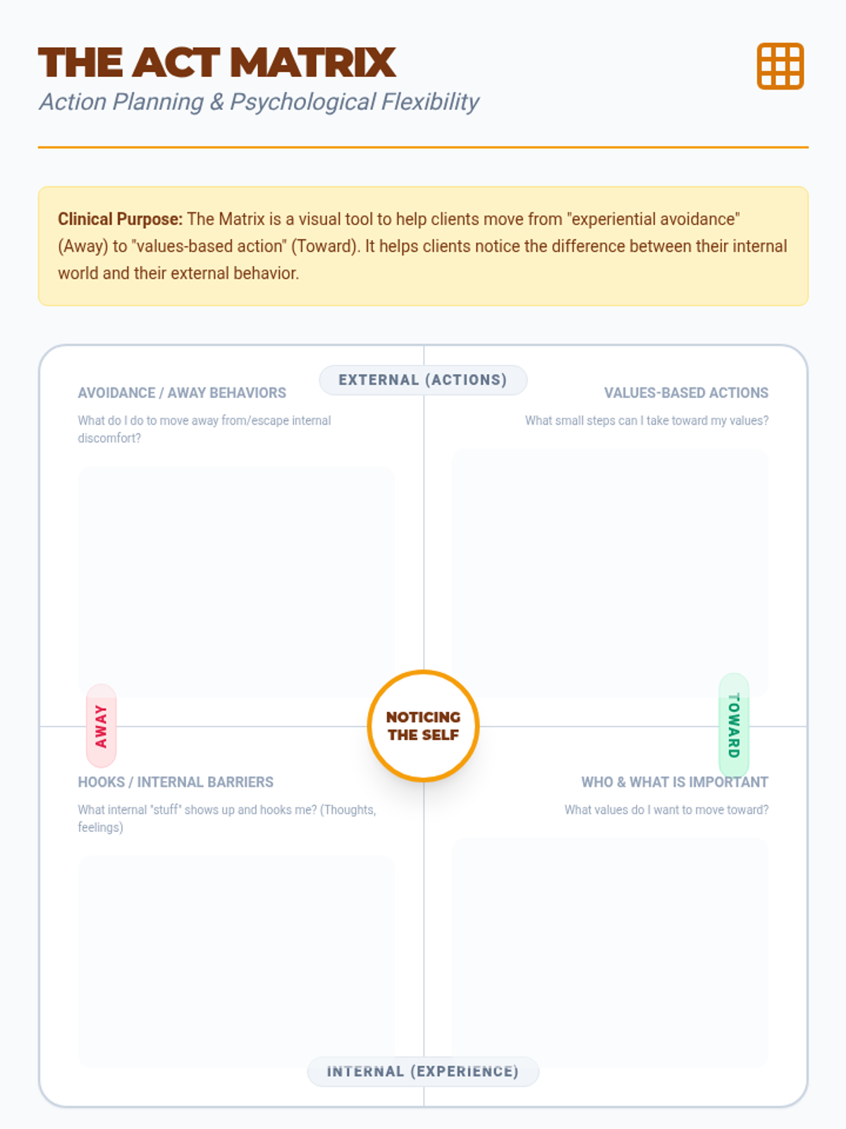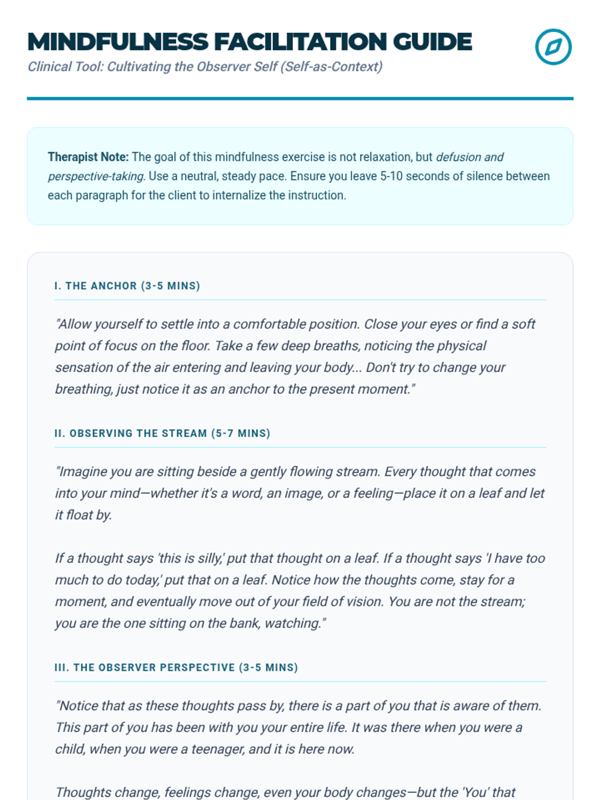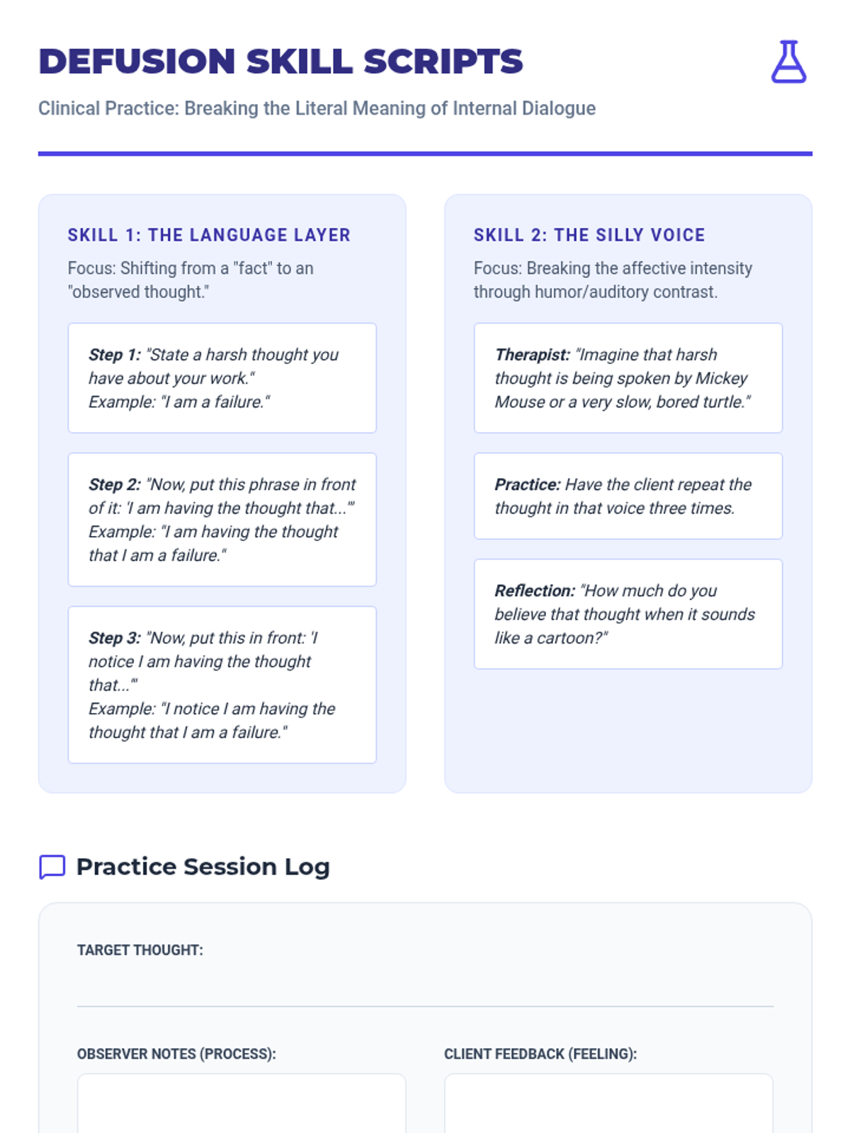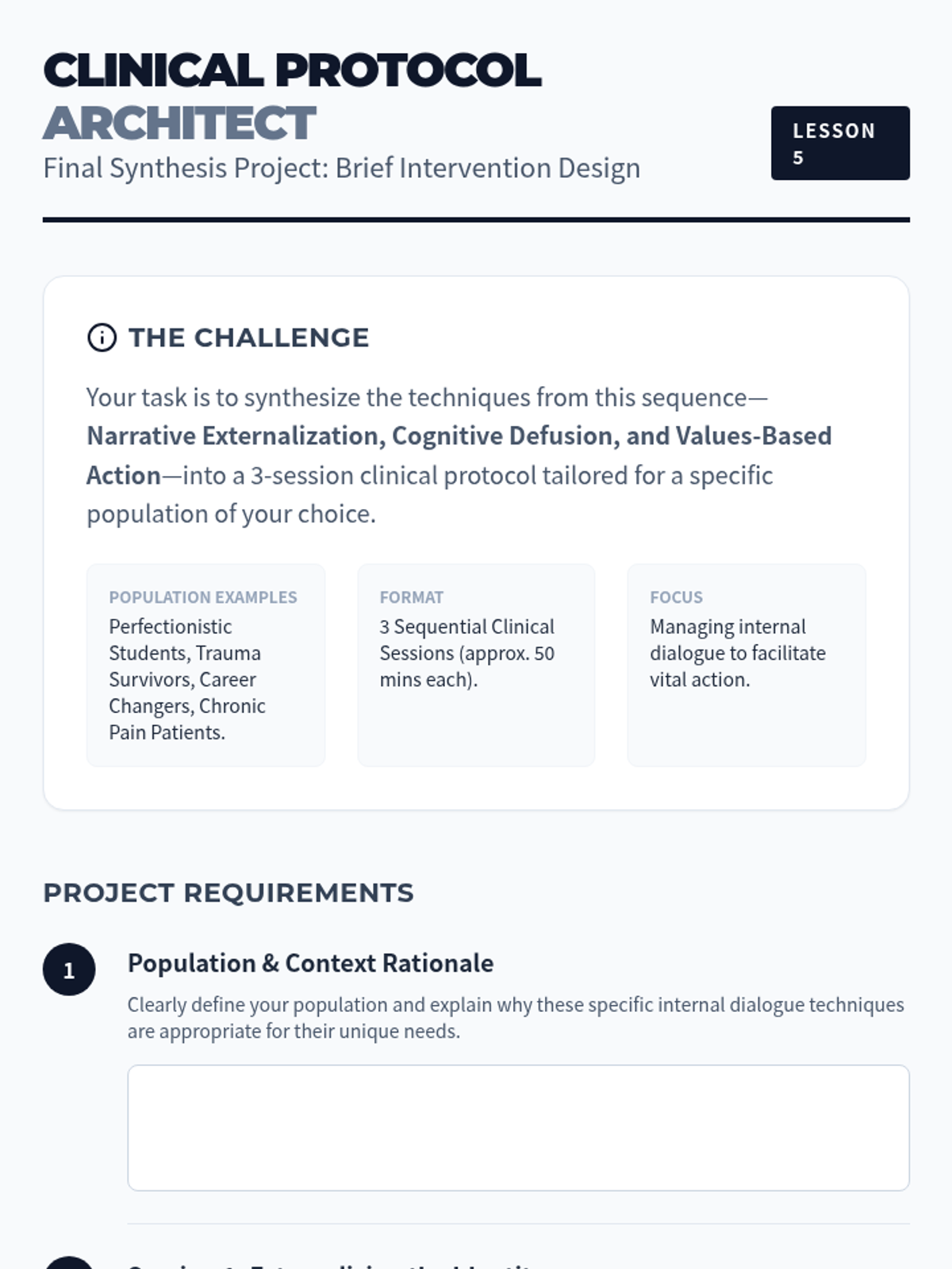 A graduate-level sequence exploring Narrative and Acceptance and Commitment Therapy (ACT) techniques to manage internal dialogue. Students move from externalizing thoughts to practicing cognitive defusion and values-based action.