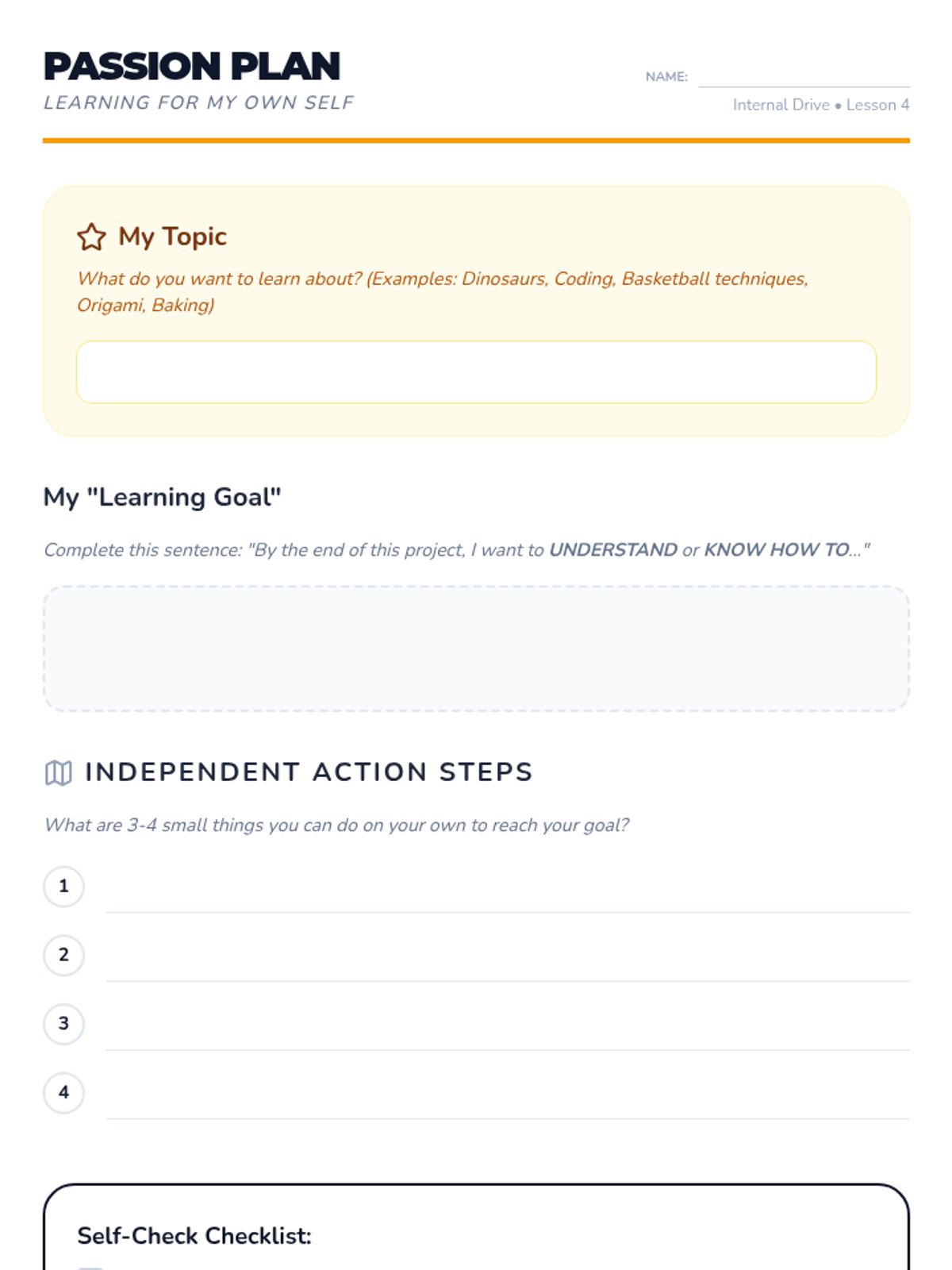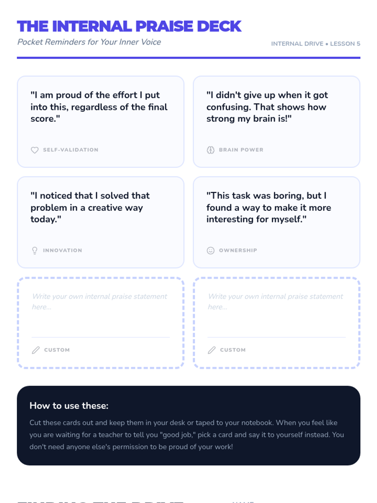 A comprehensive 5-lesson sequence for 4th graders to explore the difference between extrinsic and intrinsic motivation. Students identify personal interests, the power of autonomy, and how to fuel long-term effort through internal satisfaction.