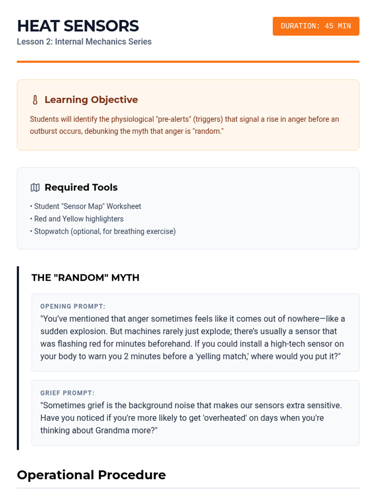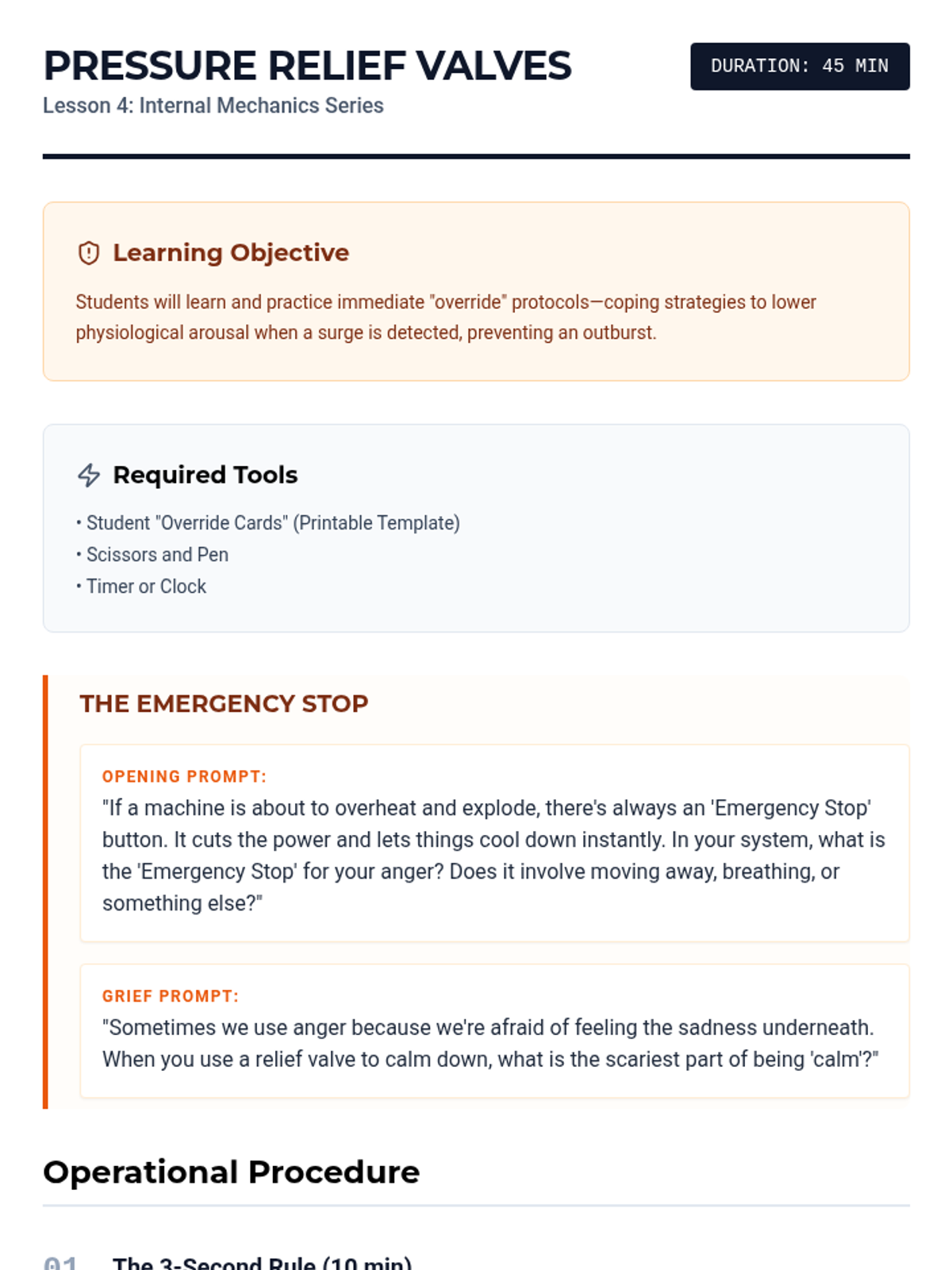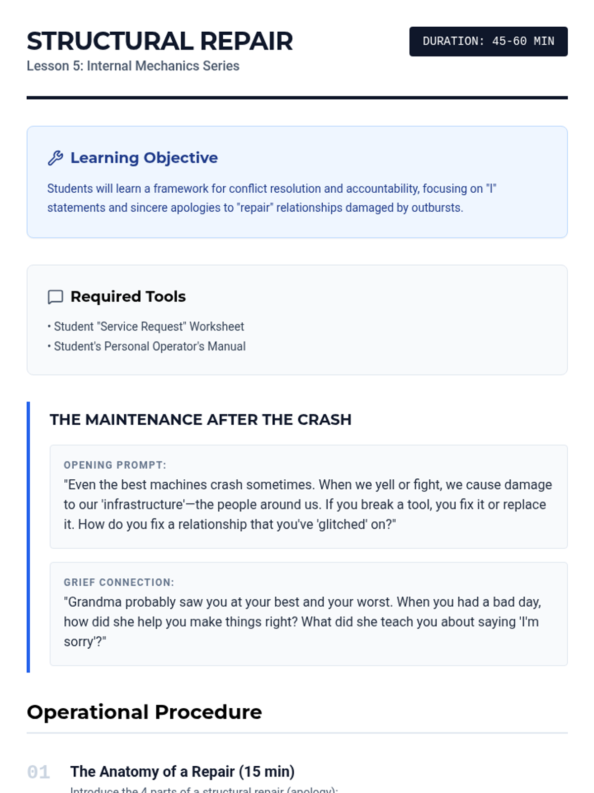 A 5-lesson series designed for middle school boys to explore emotional regulation, grief processing, and anger management through the metaphor of "Internal Mechanics." Students build a personal "Operator's Manual" to understand their triggers, name their emotions, and implement practical coping strategies.