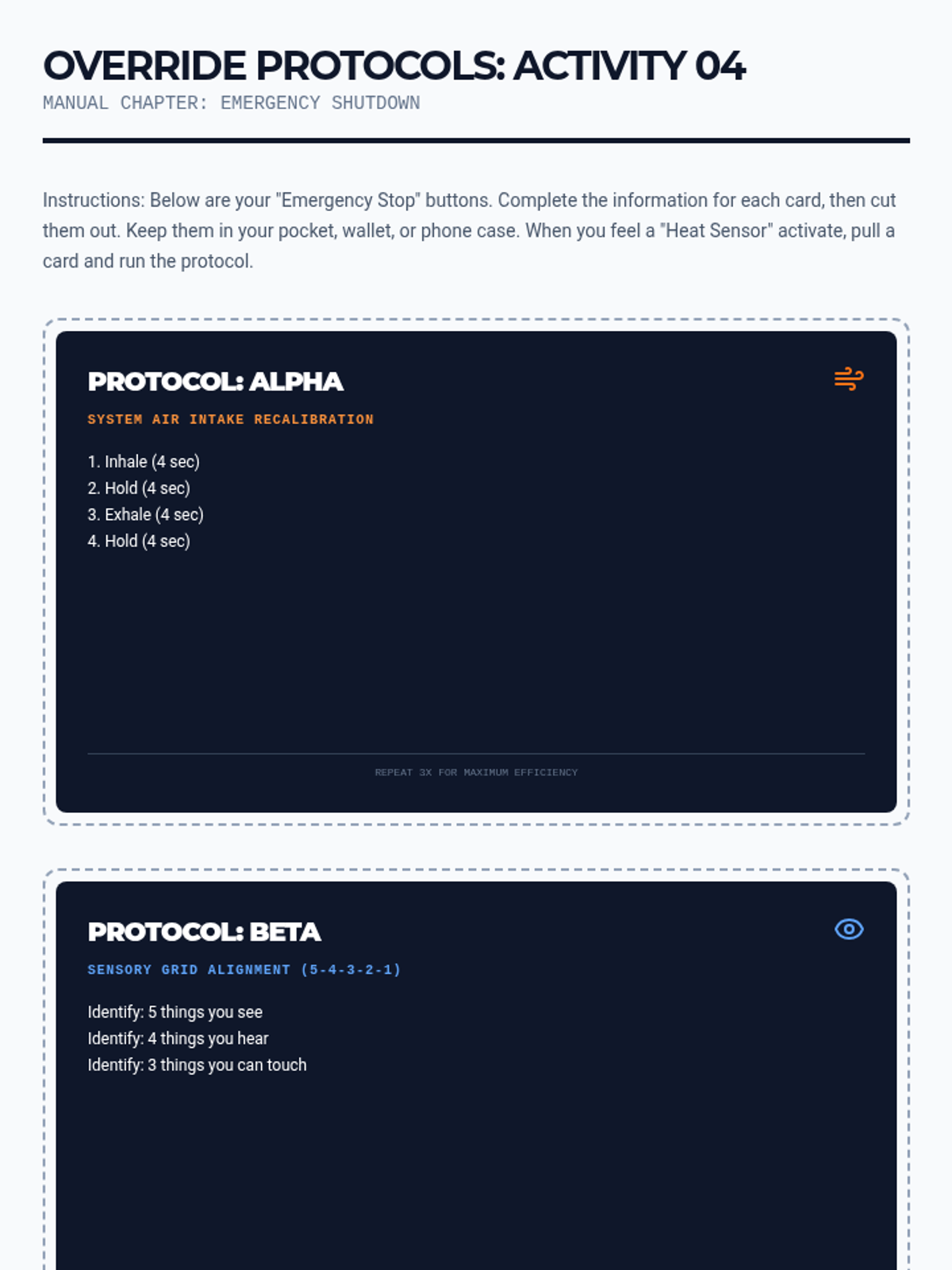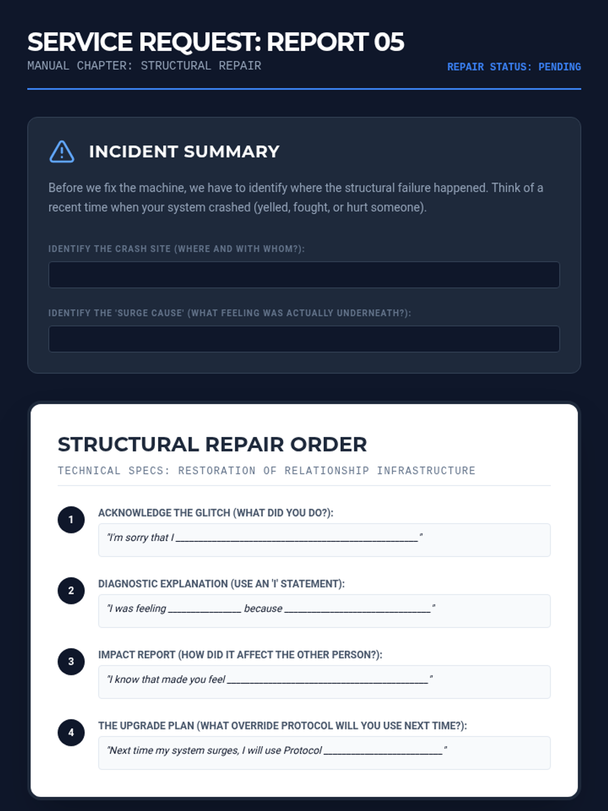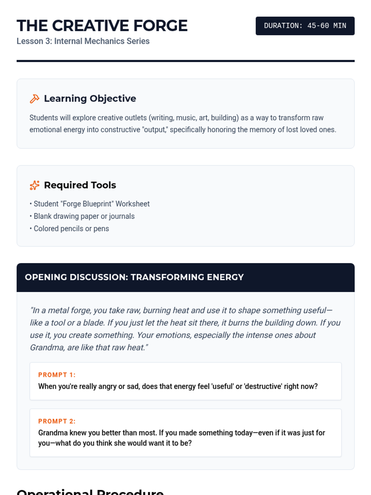A 5-lesson series designed for middle school boys to explore emotional regulation, grief processing, and anger management through the metaphor of "Internal Mechanics." Students build a personal "Operator's Manual" to understand their triggers, name their emotions, and implement practical coping strategies.