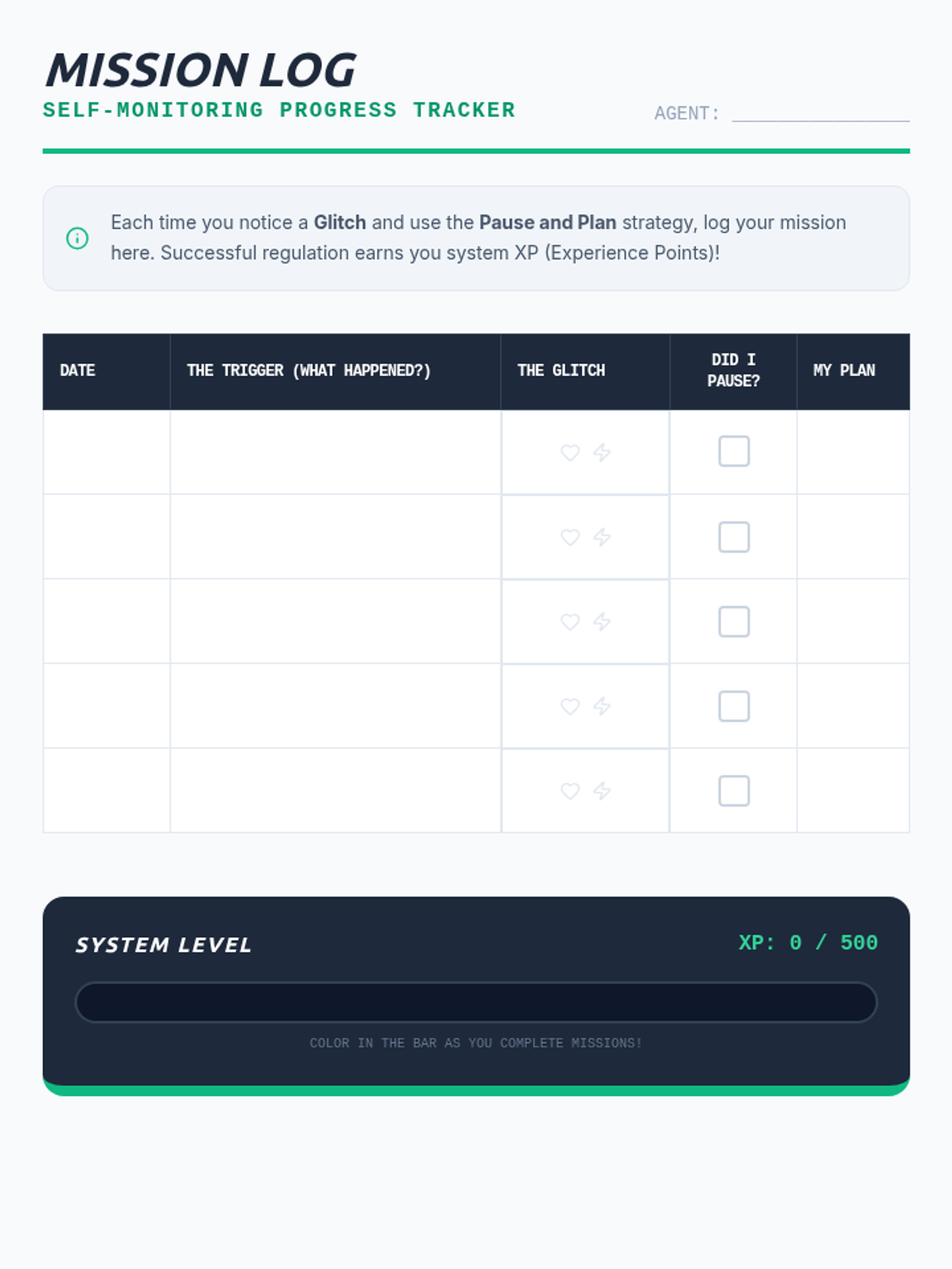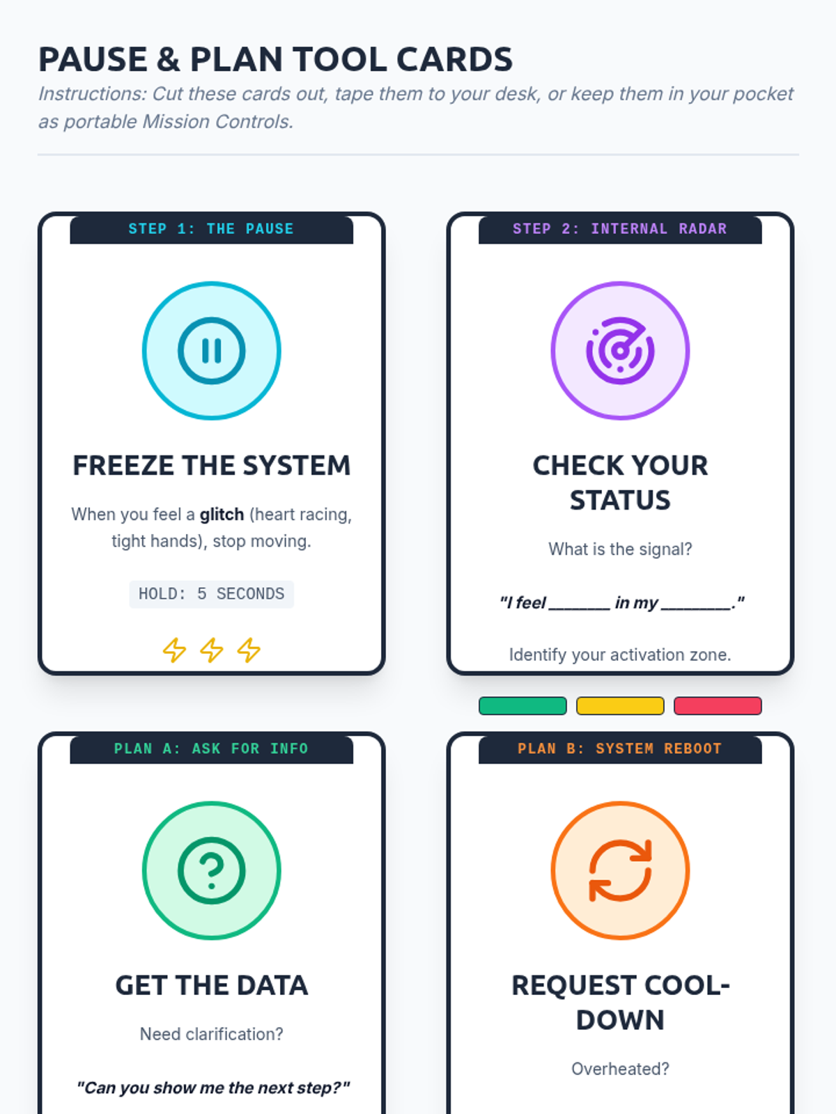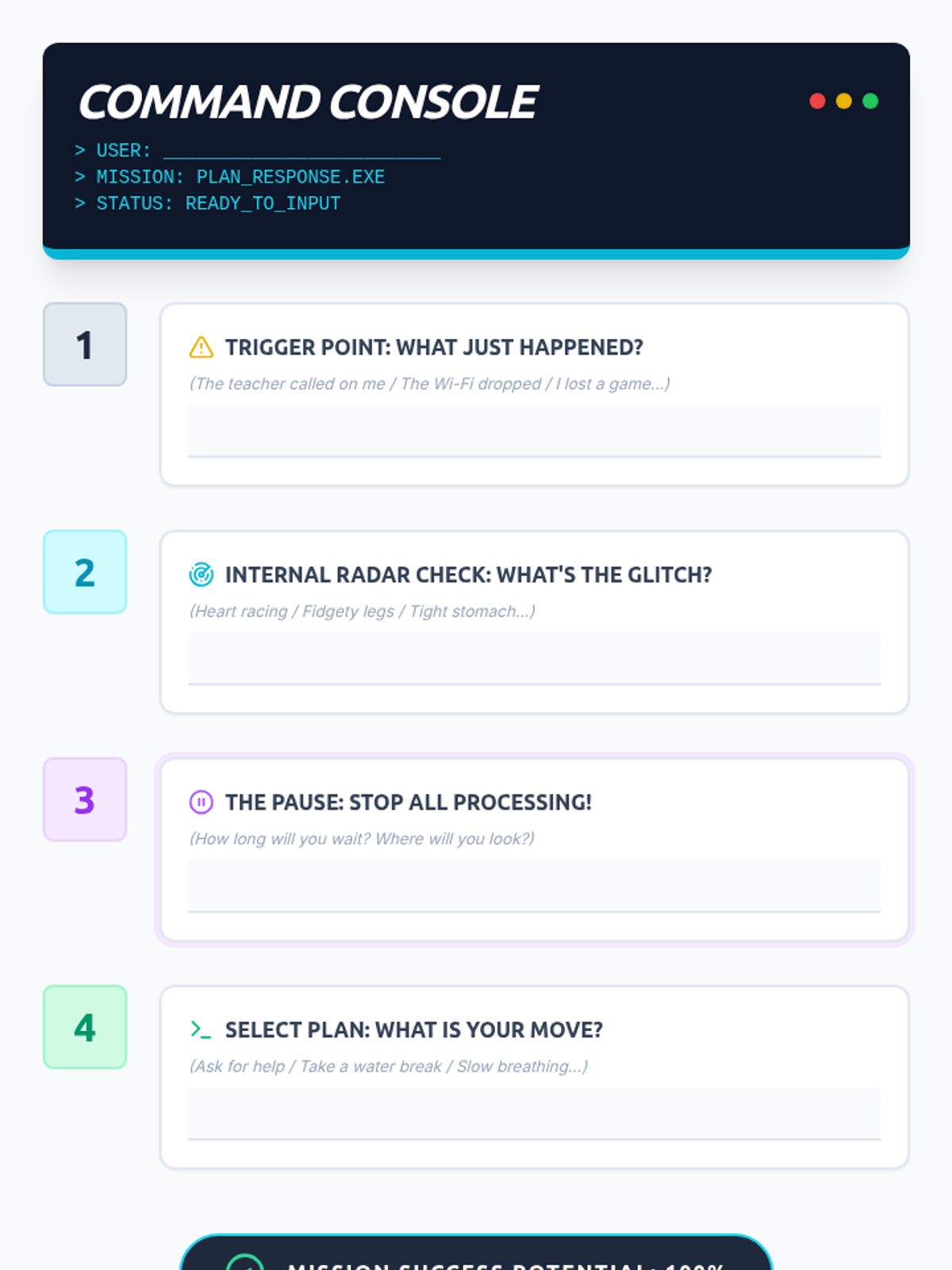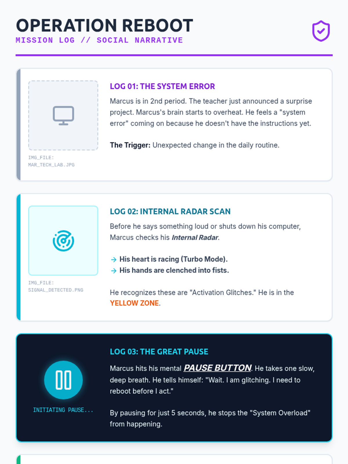 A therapeutic sequence designed for middle school boys to develop self-awareness and emotional regulation through a 'Tech/Gaming' metaphor. Students learn to scan their 'Internal Radar' for body signals and use a 'Pause and Plan' strategy to manage activation.