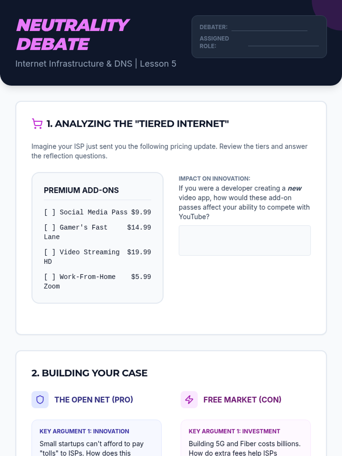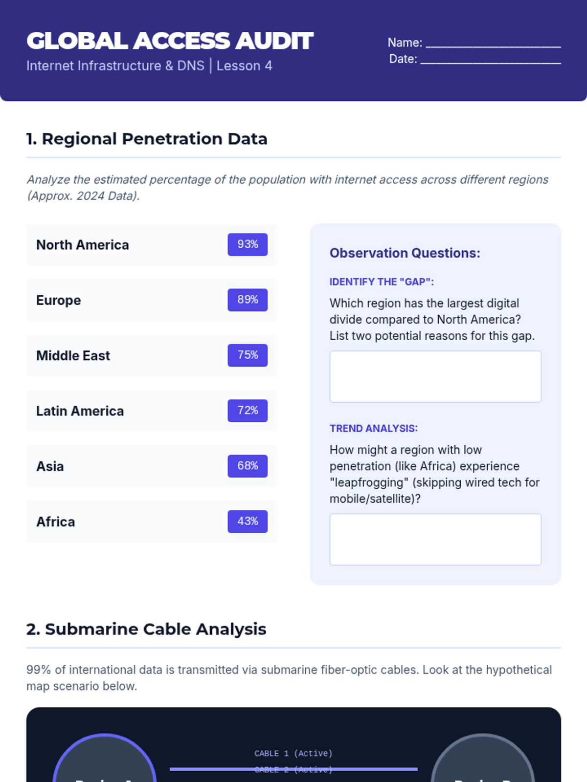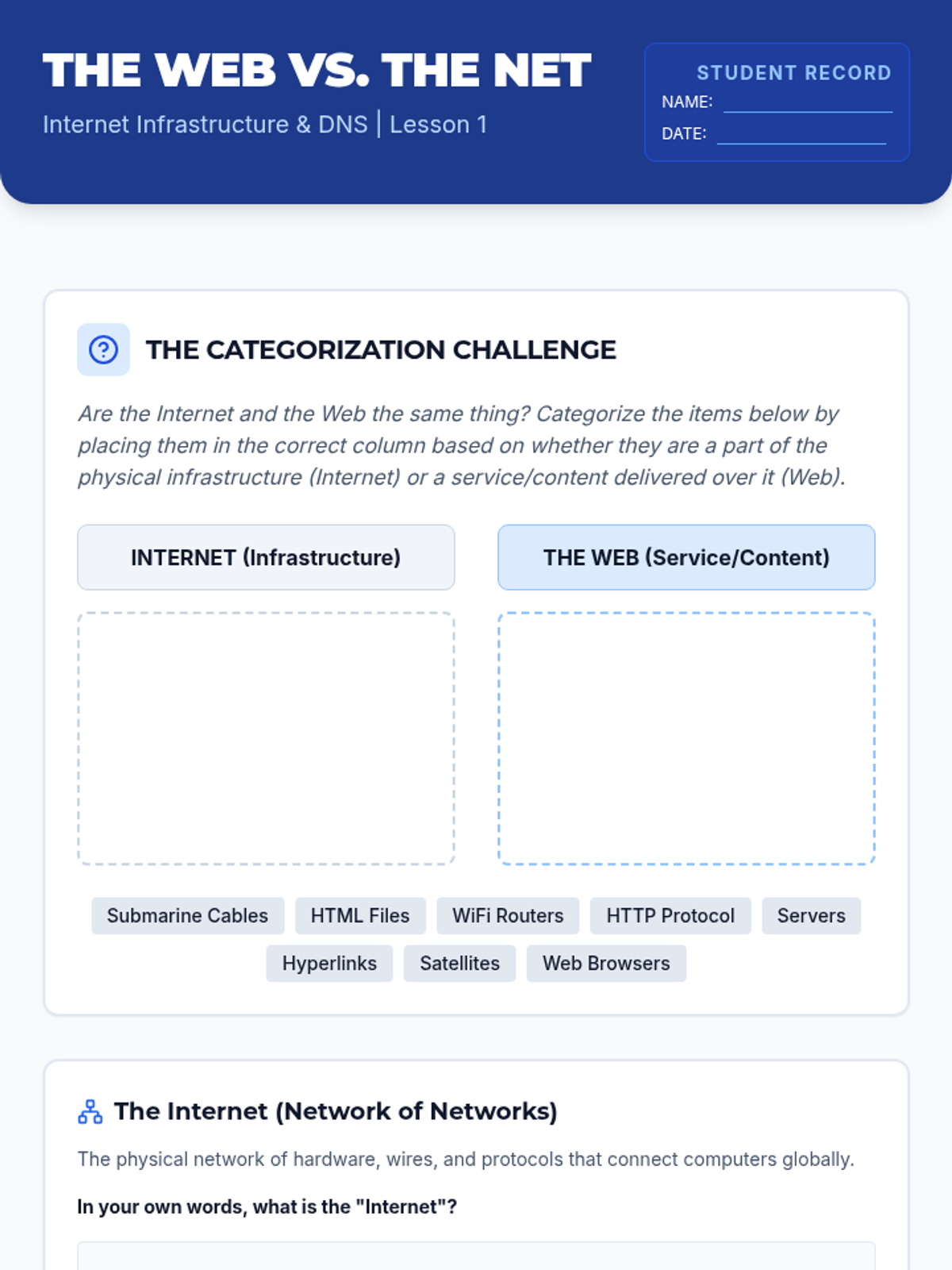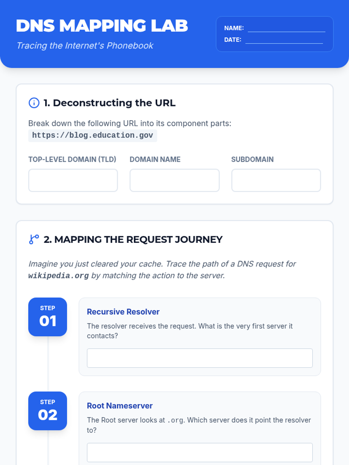 This sequence investigates the specific systems that make the World Wide Web usable for humans, focusing on the Domain Name System (DNS) and HTTP. Students trace the journey of a URL request, uncovering the hierarchy of domain names and the relationship between clients and servers.