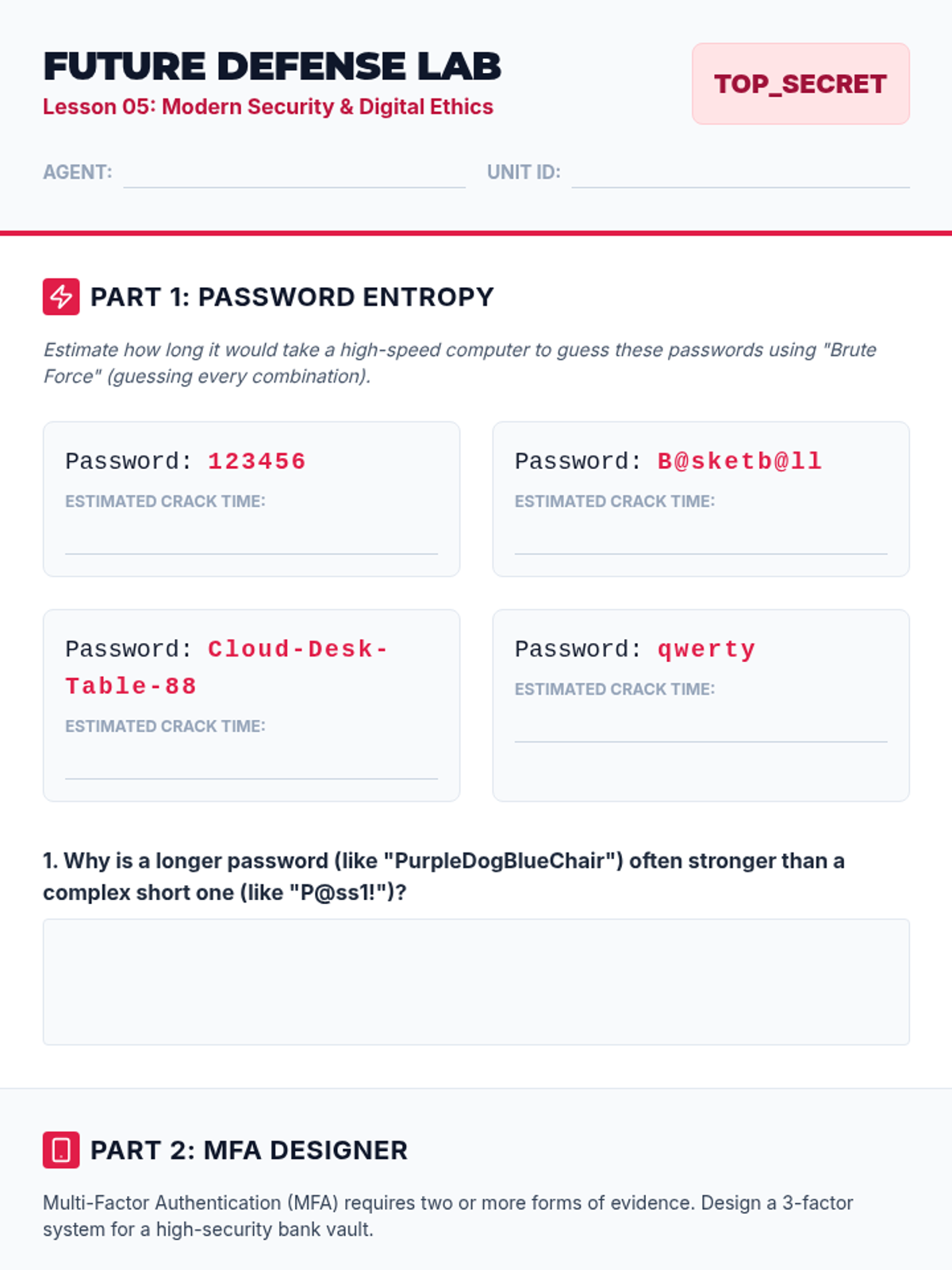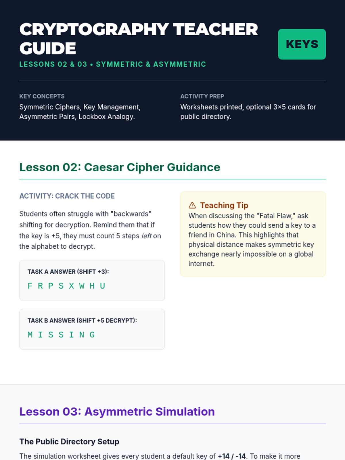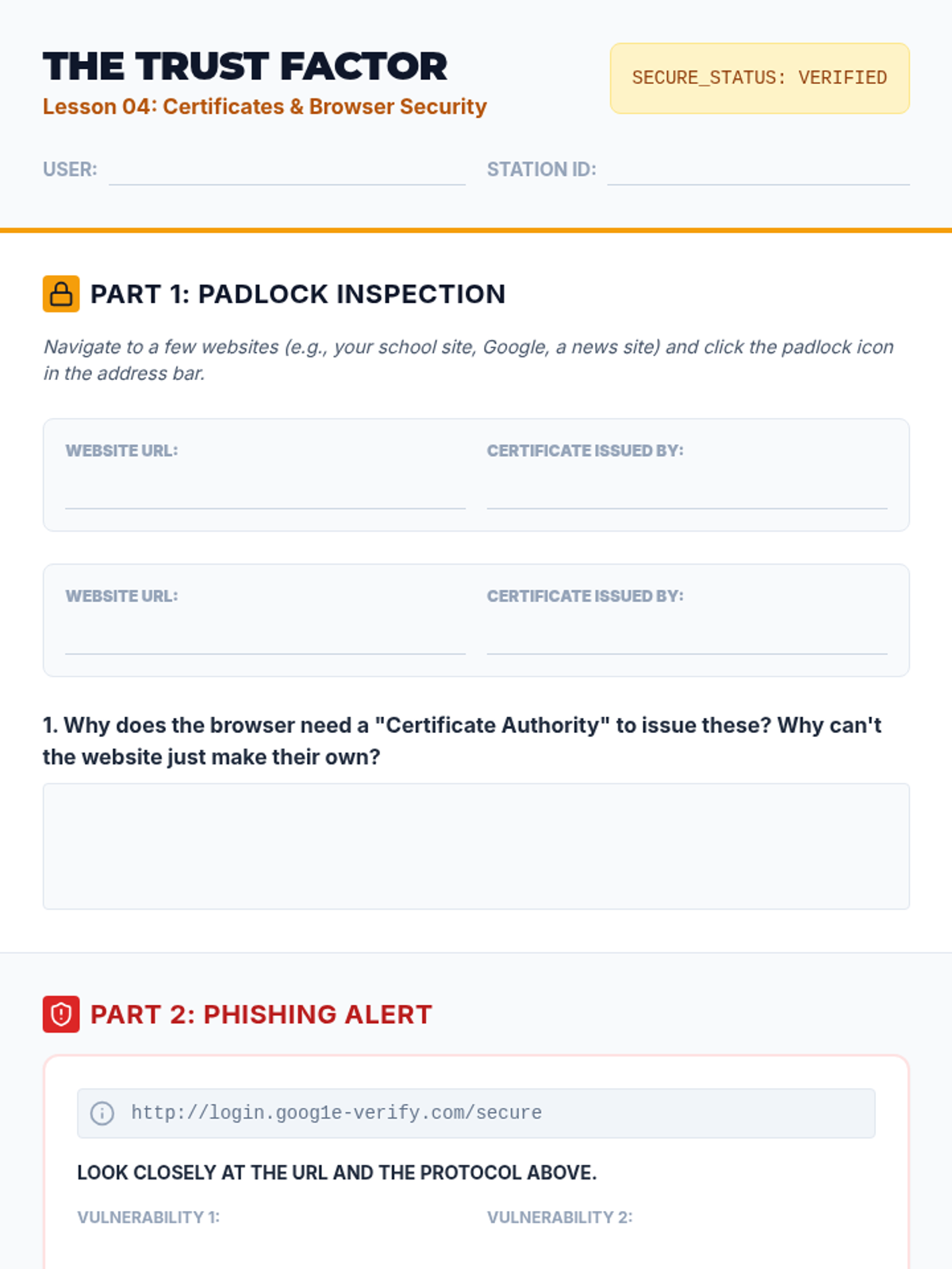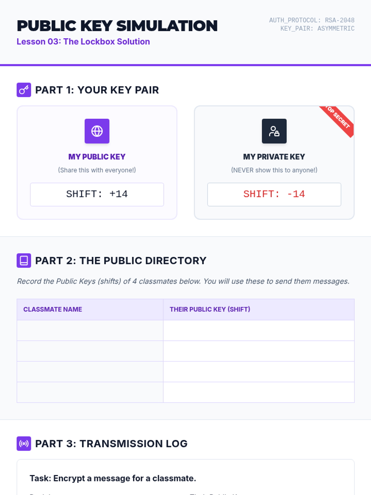 This 8th-grade computer science sequence explores the fundamental principles of network security and encryption. Students progress from understanding the risks of open communication on the internet to mastering symmetric and asymmetric encryption, digital certificates, and modern security best practices.